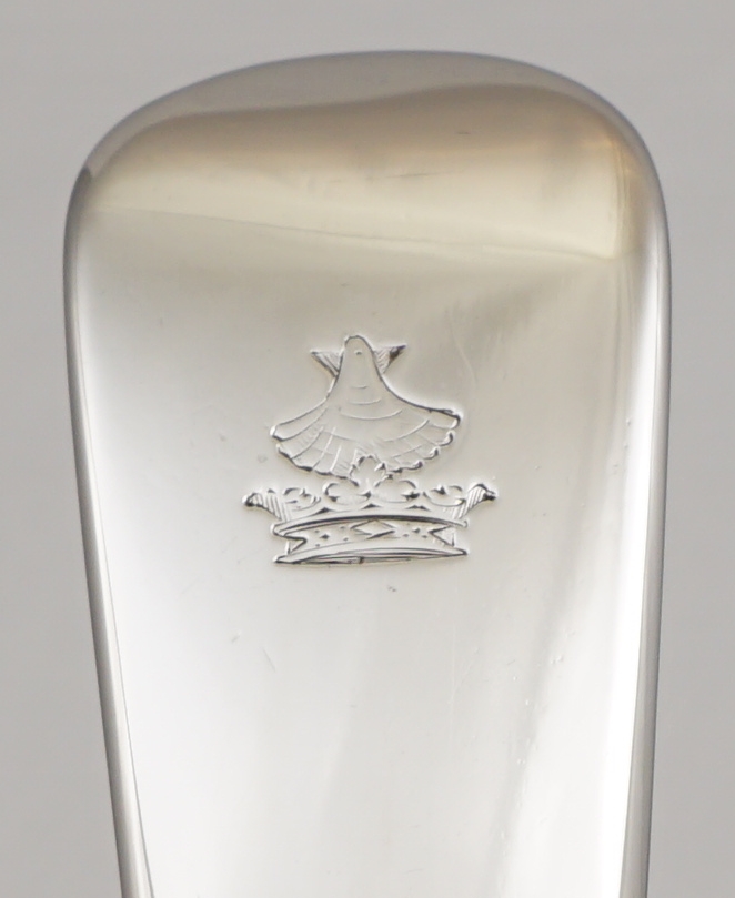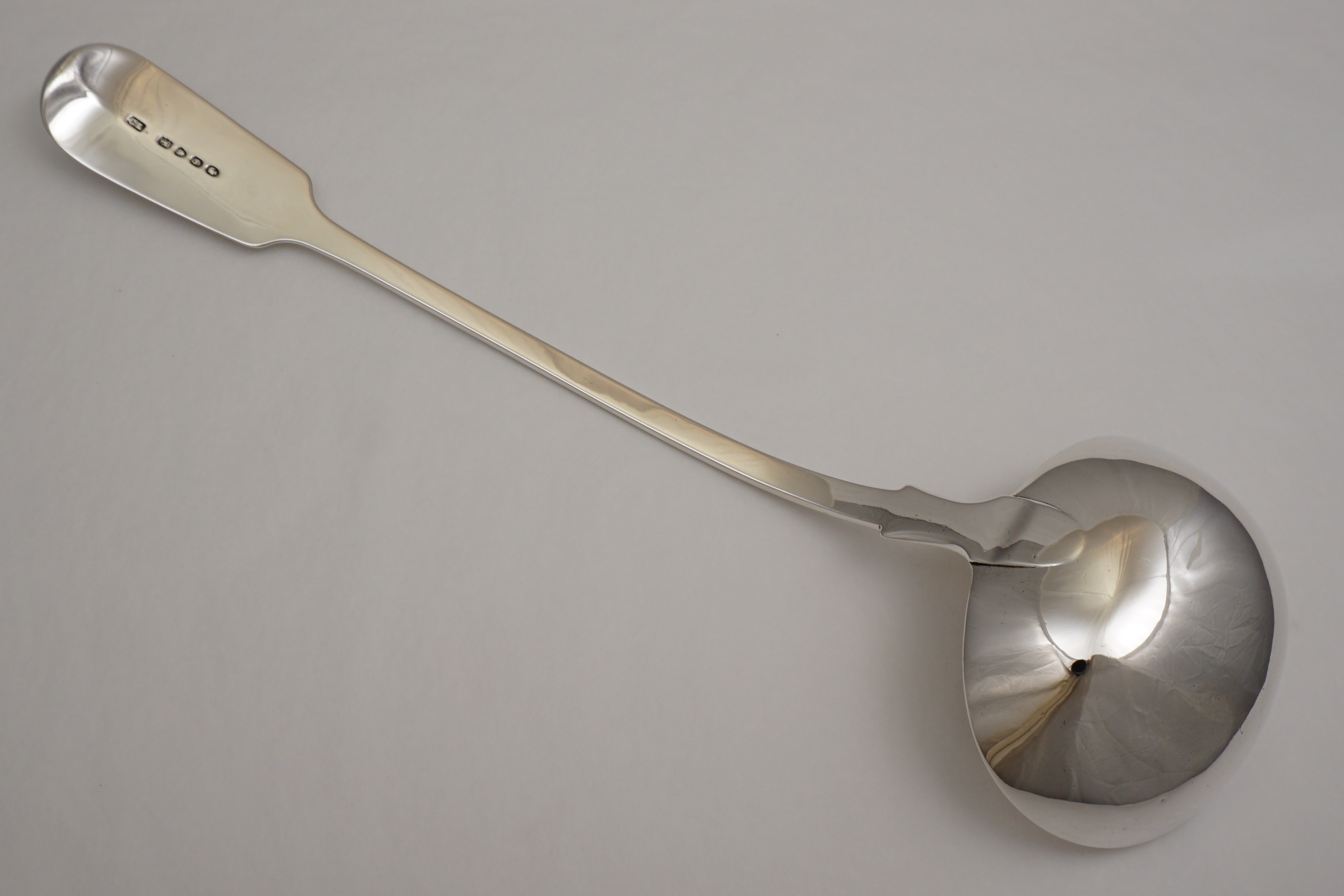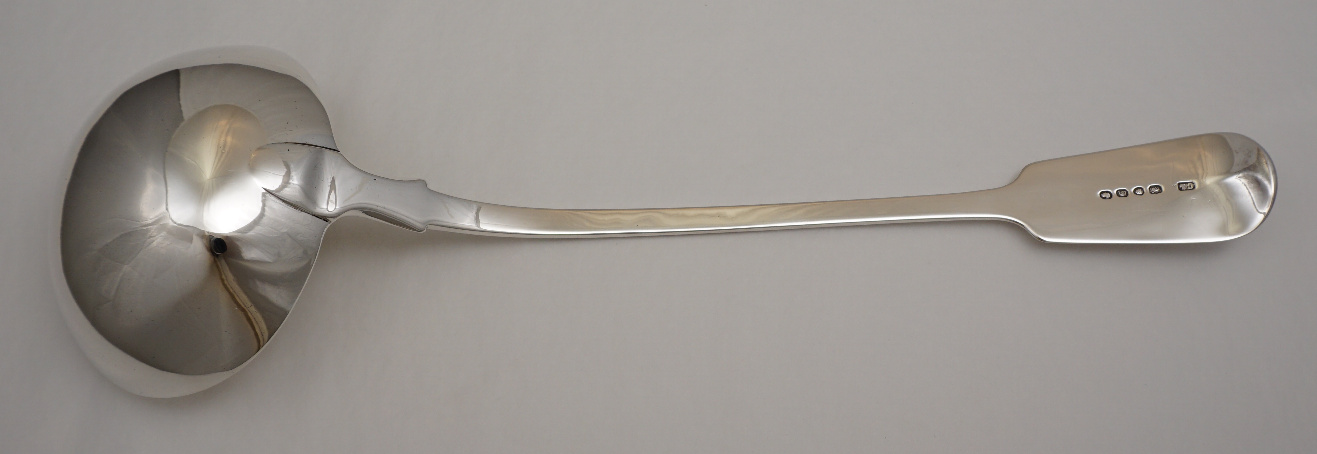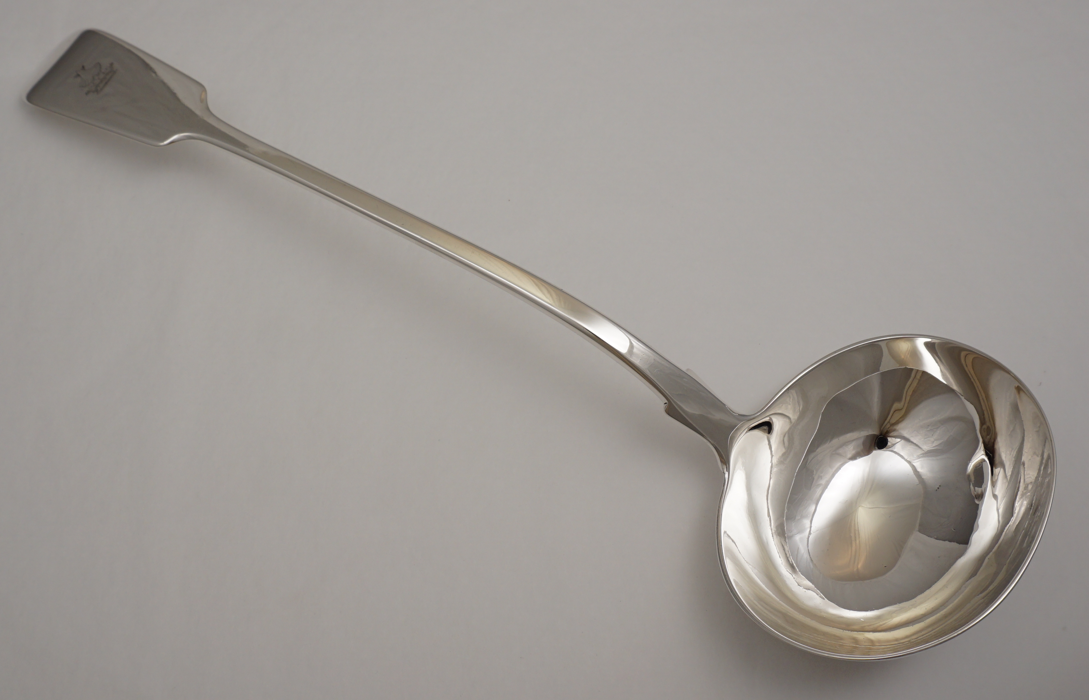 DESCRIPTION | Good, large and heavy antique English Victorian solid sterling silver Fiddle pattern soup ladle with a good frontal crest engraving. |