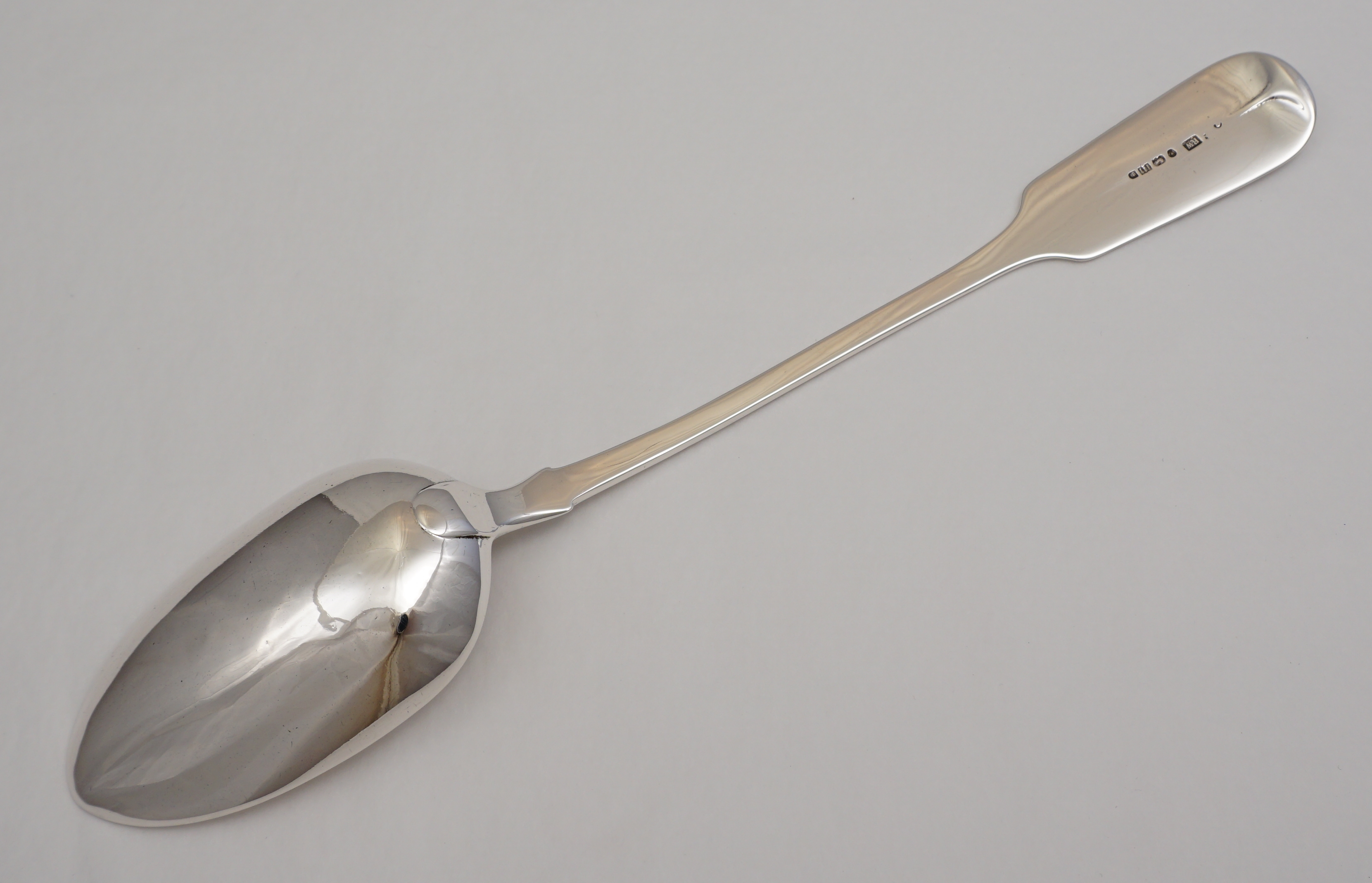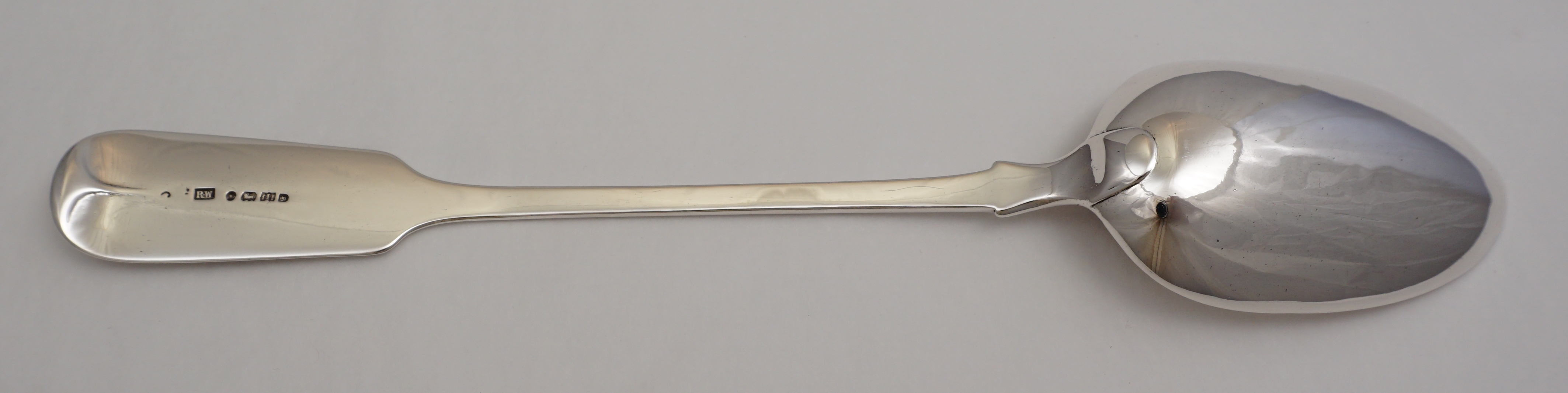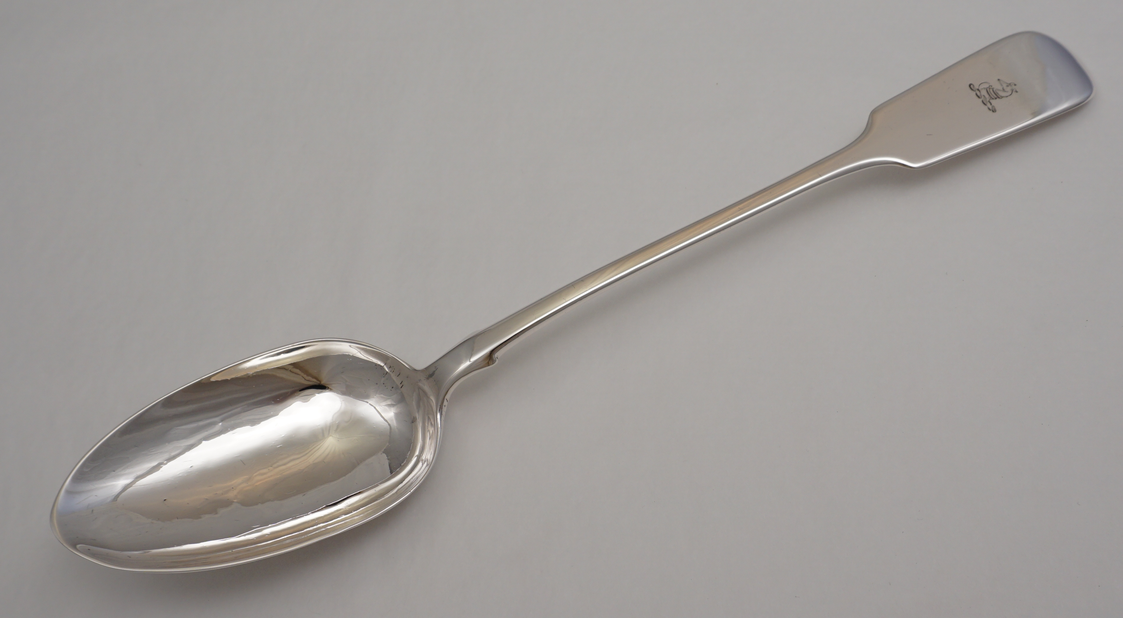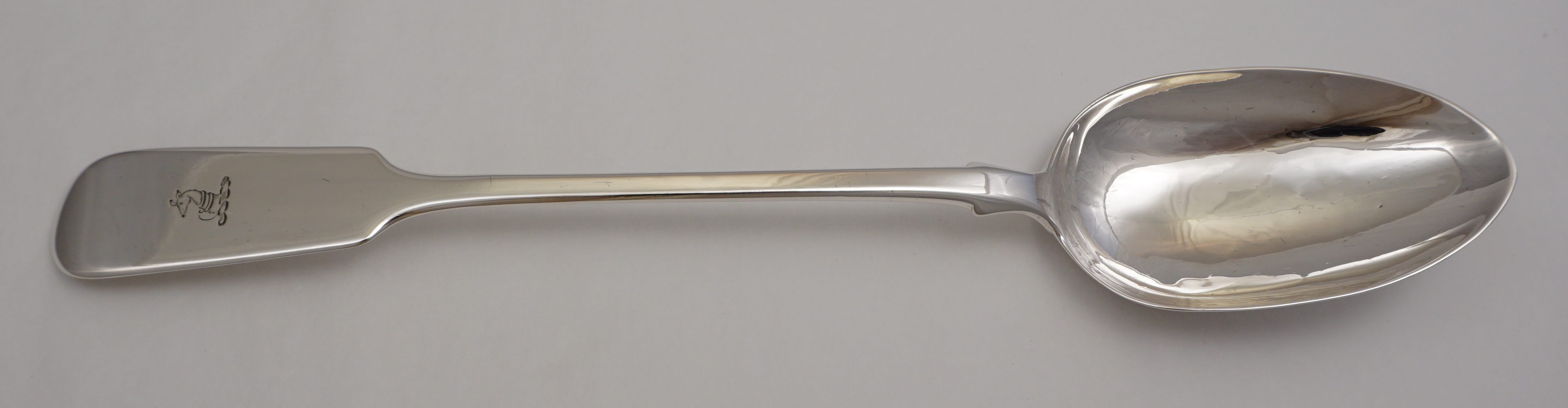 DESCRIPTION | Useful antique English early Victorian solid sterling silver Fiddle pattern basting spoon with a frontal crest engraving. |
