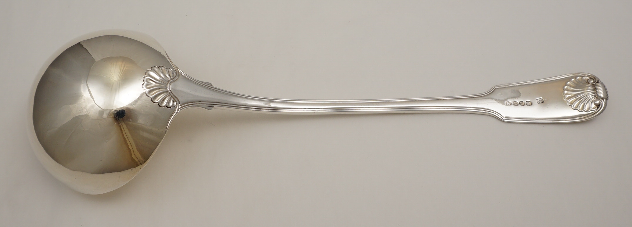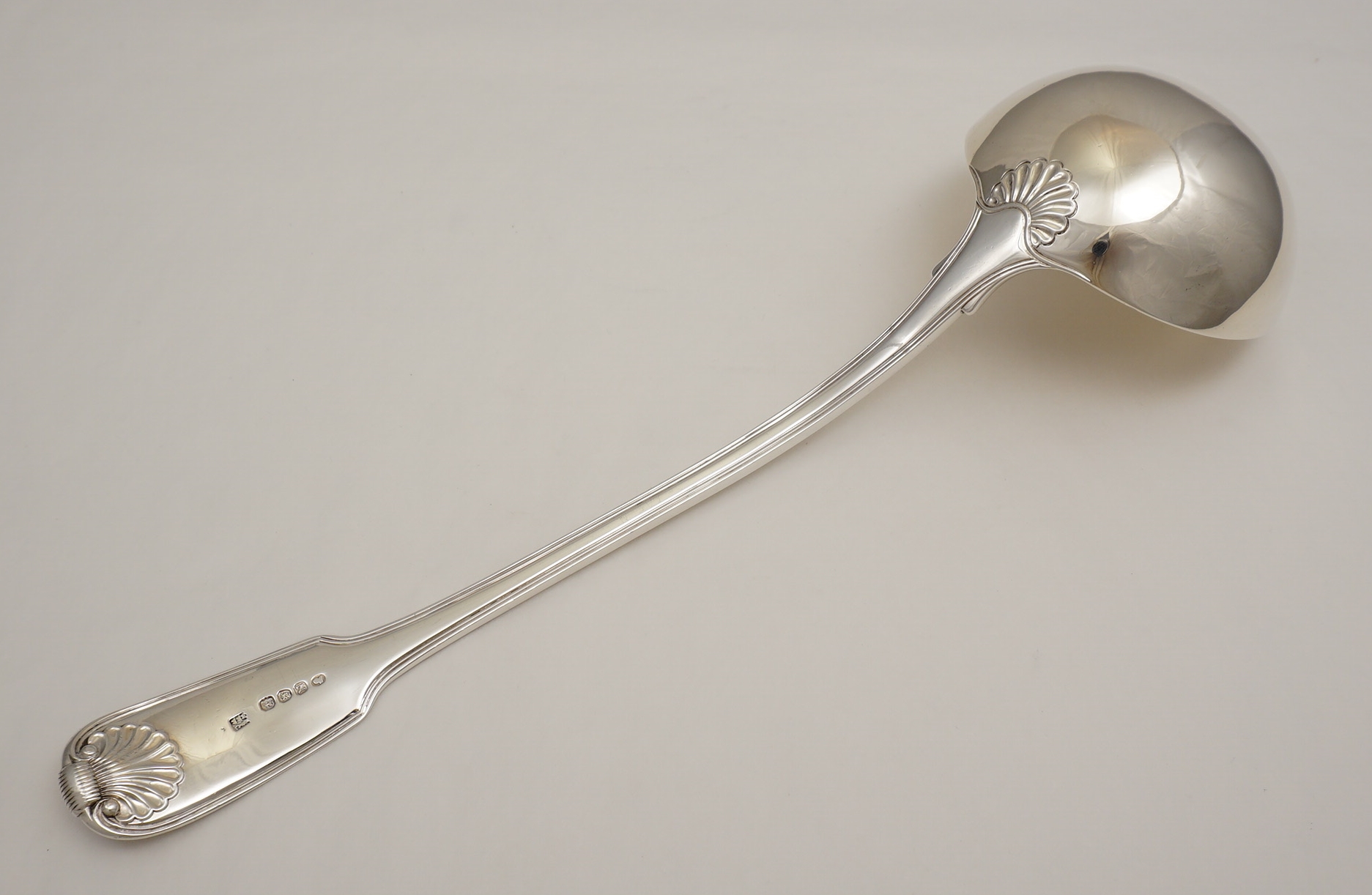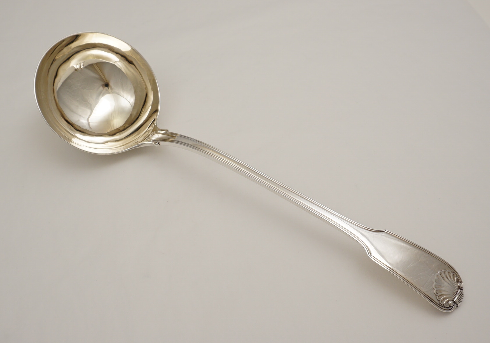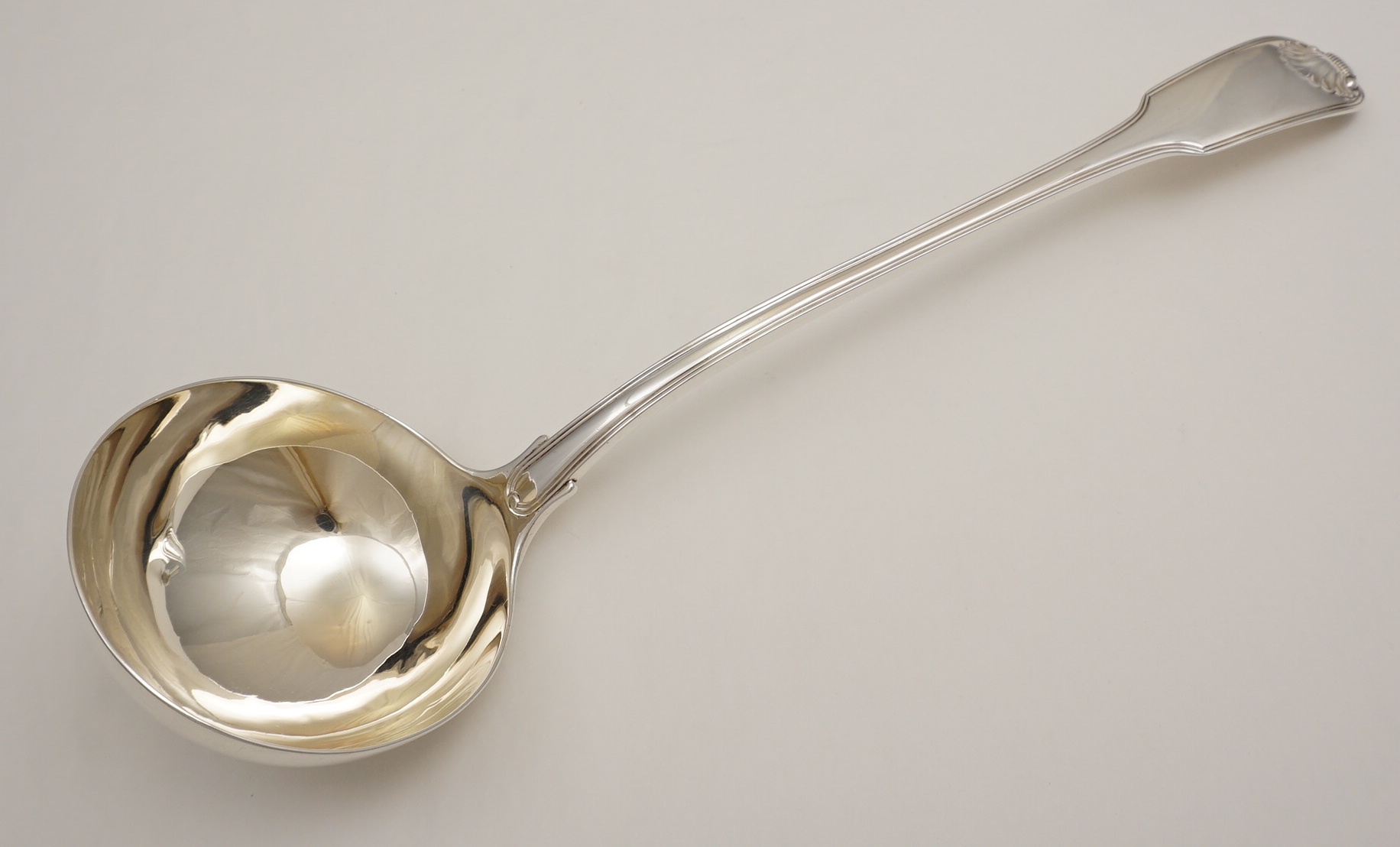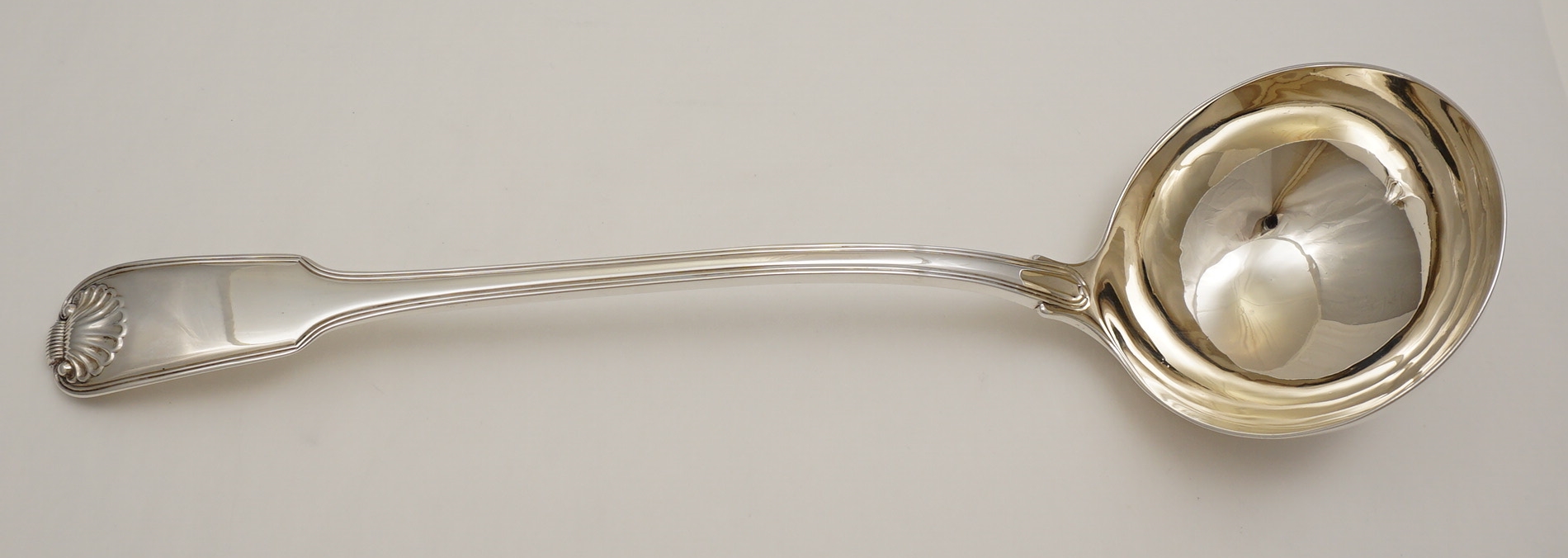 DESCRIPTION | Antique English Georgian solid sterling silver Fiddle, Thread & Shell pattern soup ladle with a Union Shell heel and no engraving or erasure. |