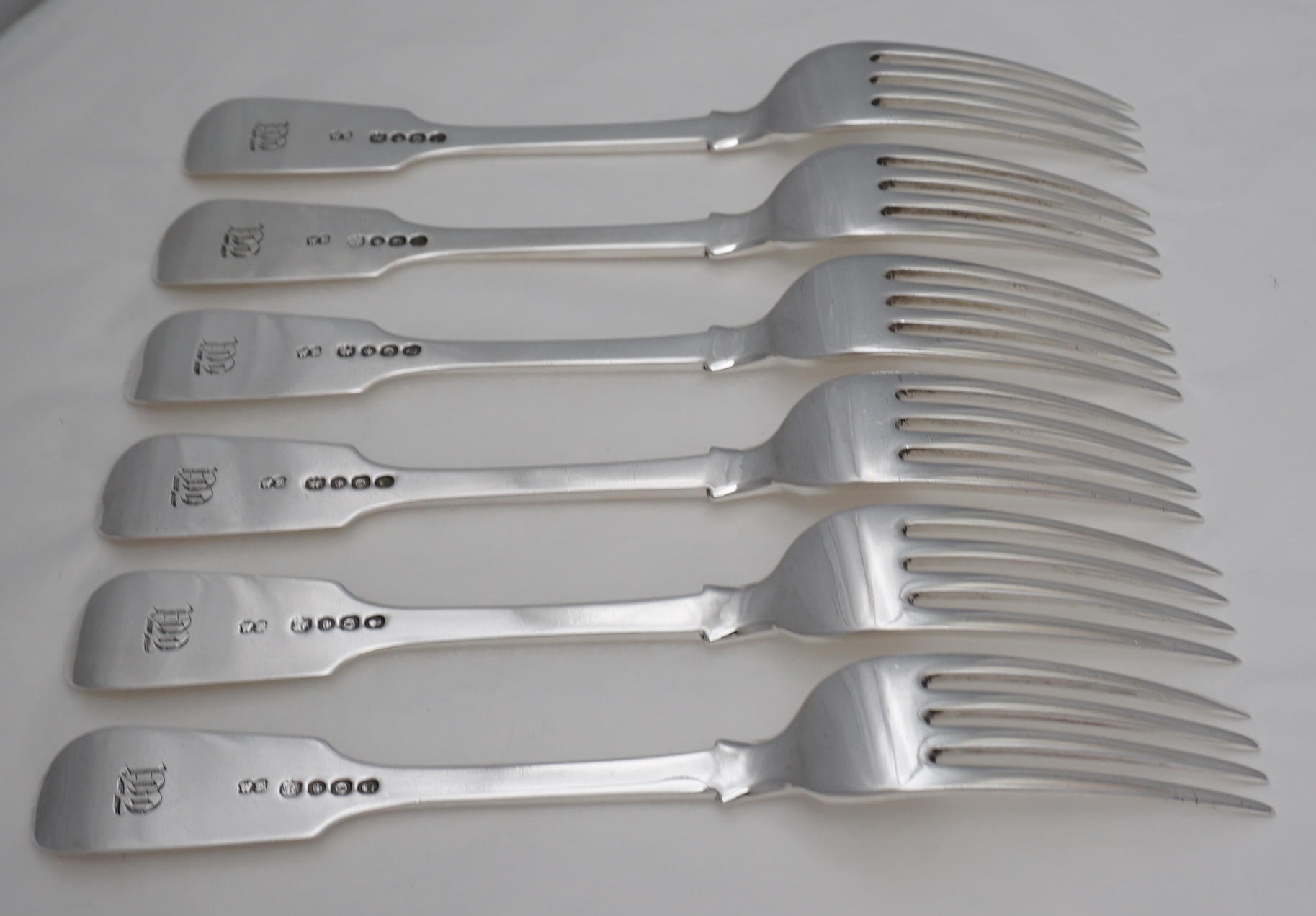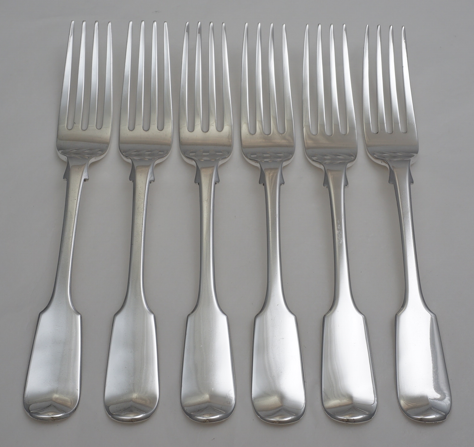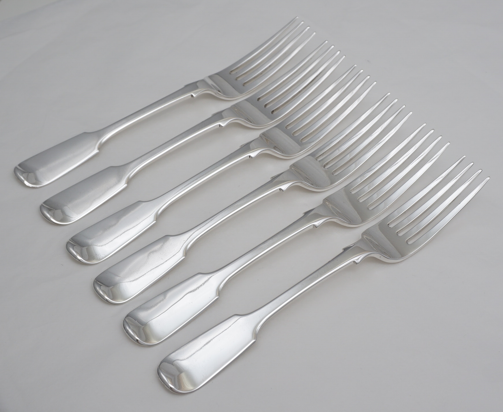 DESCRIPTION | Good set of six antique English Georgian solid sterling silver Fiddle pattern table forks with an initial engraving verso. |