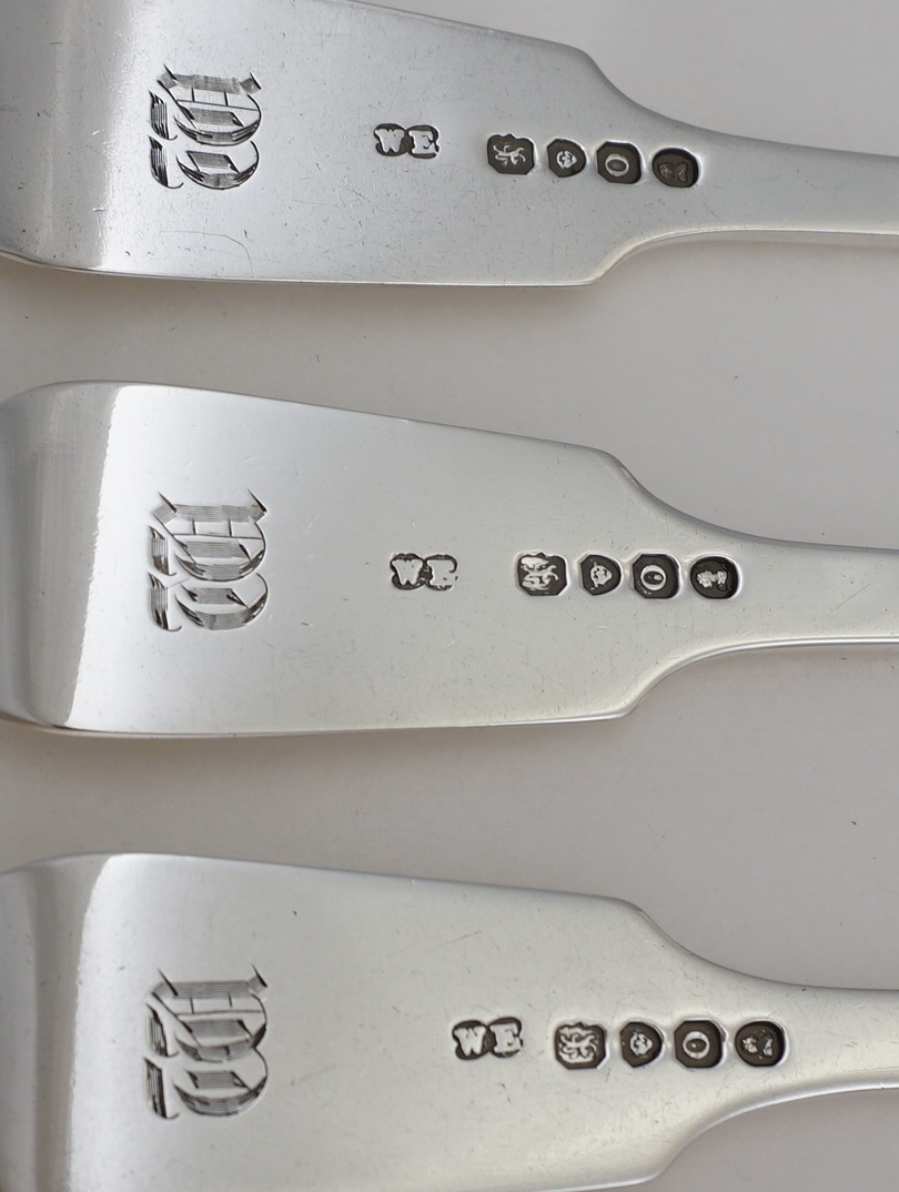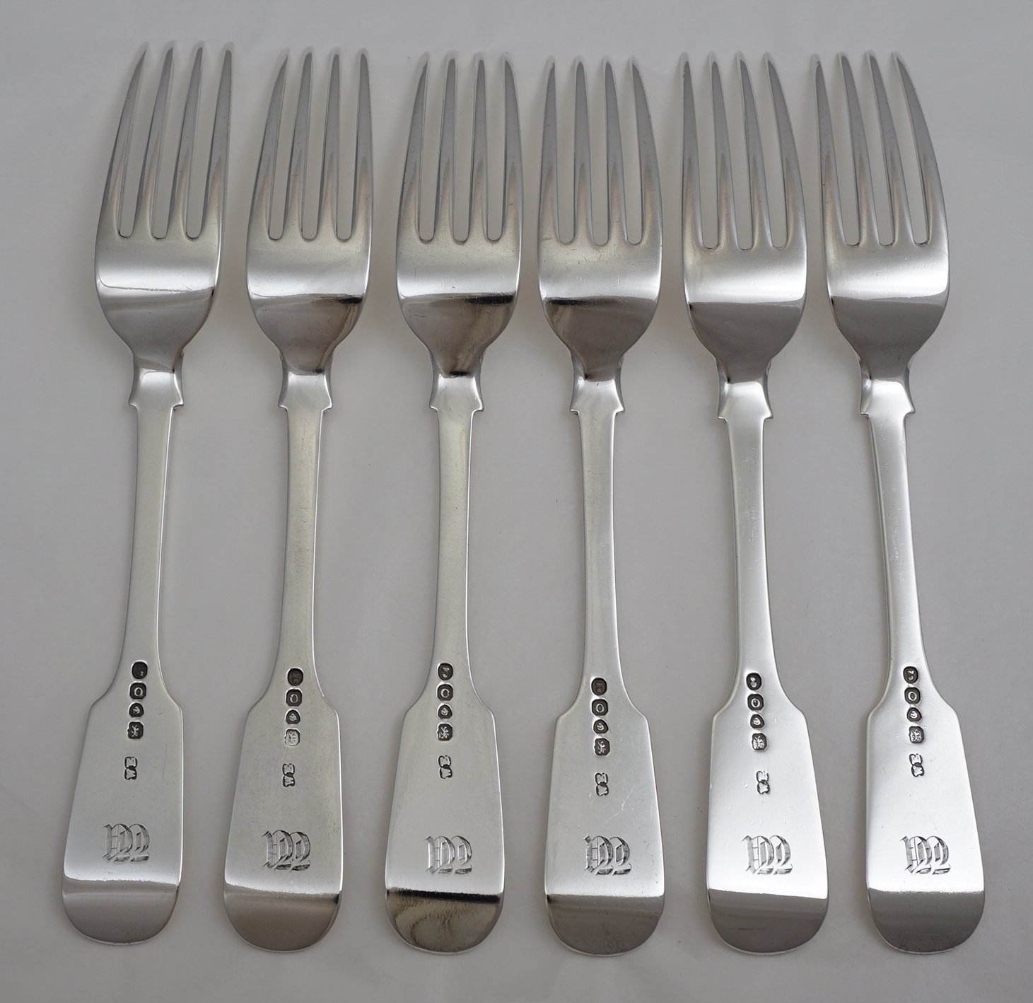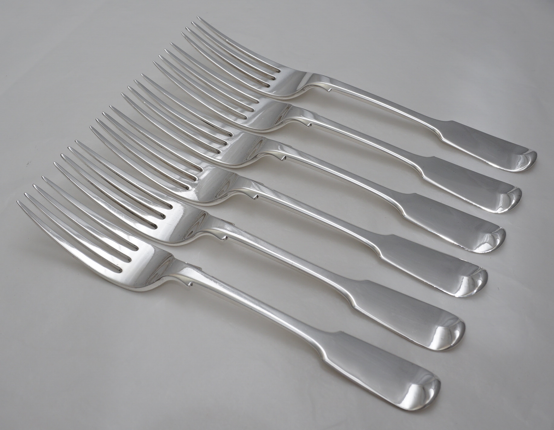 DESCRIPTION | Good set of six antique English Georgian solid sterling silver Fiddle pattern table forks with an initial engraving verso. |
