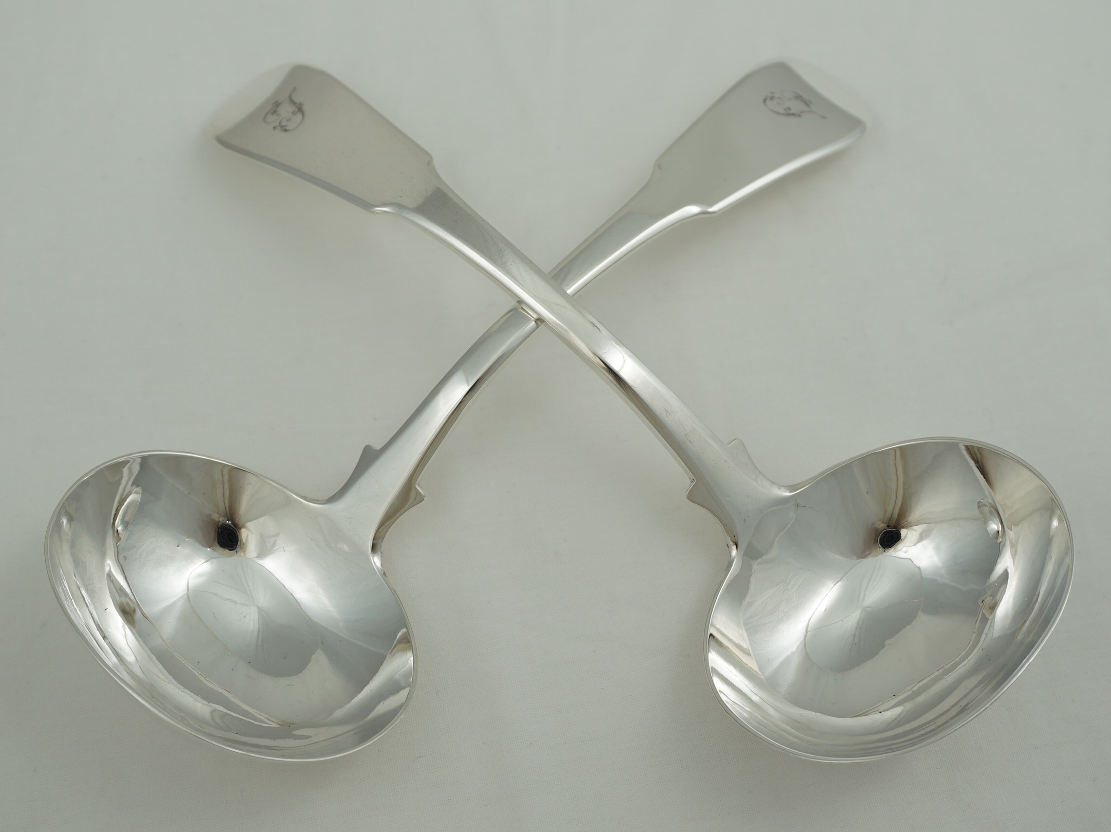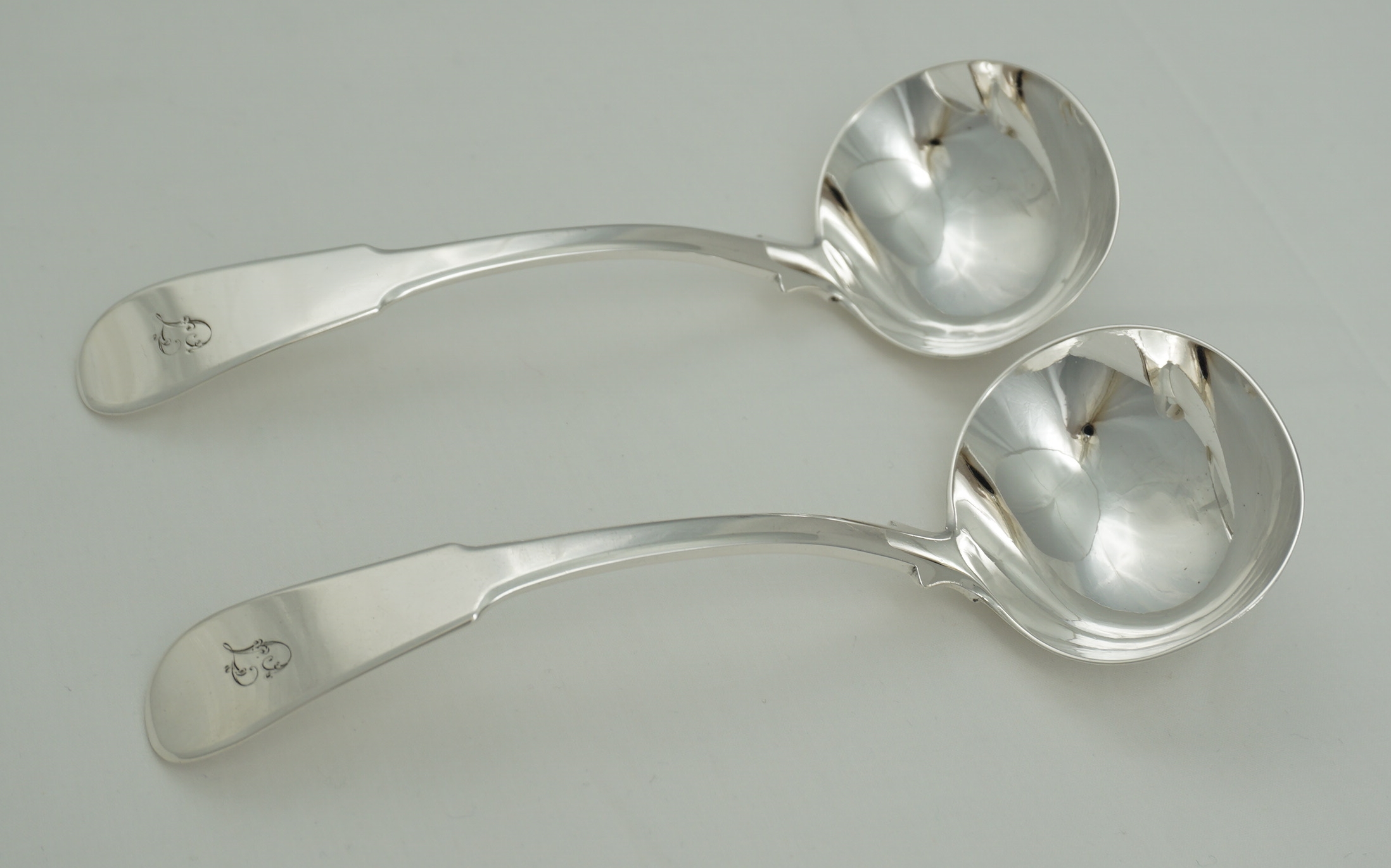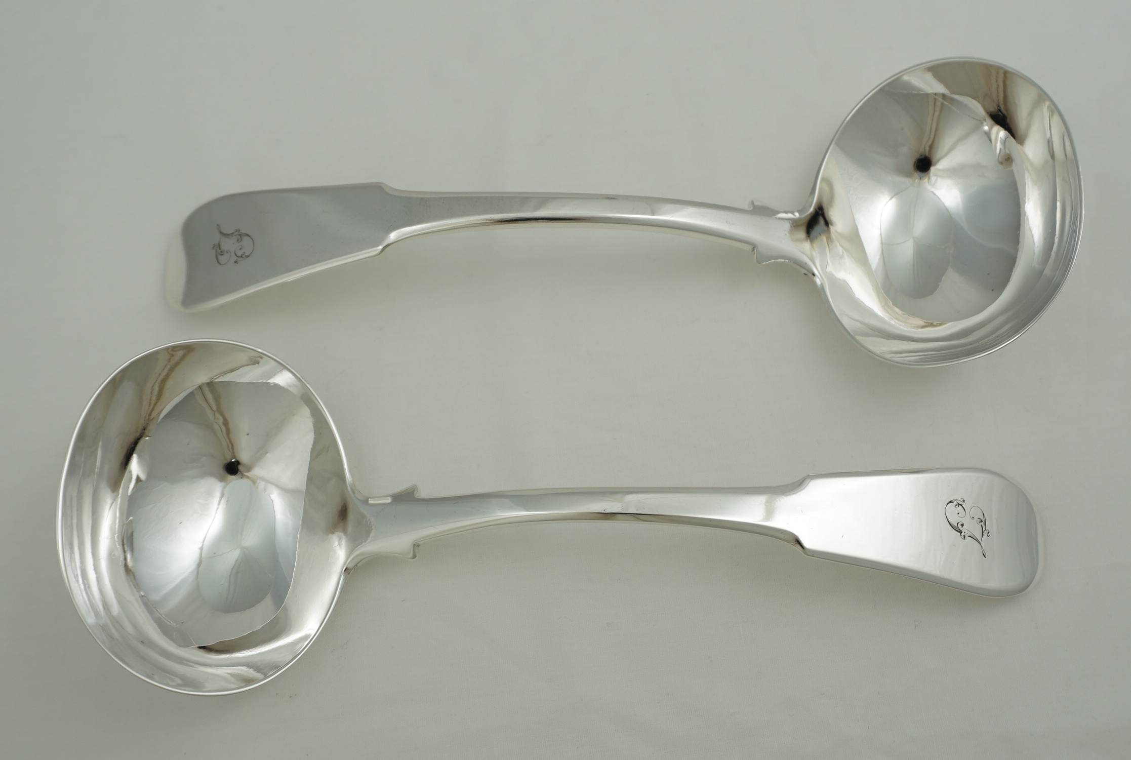 DESCRIPTION | Good and useful pair of antique Scottish Georgian solid sterling silver Fiddle pattern sauce ladles with a frontal initial 'T' engraving. |