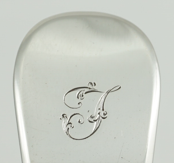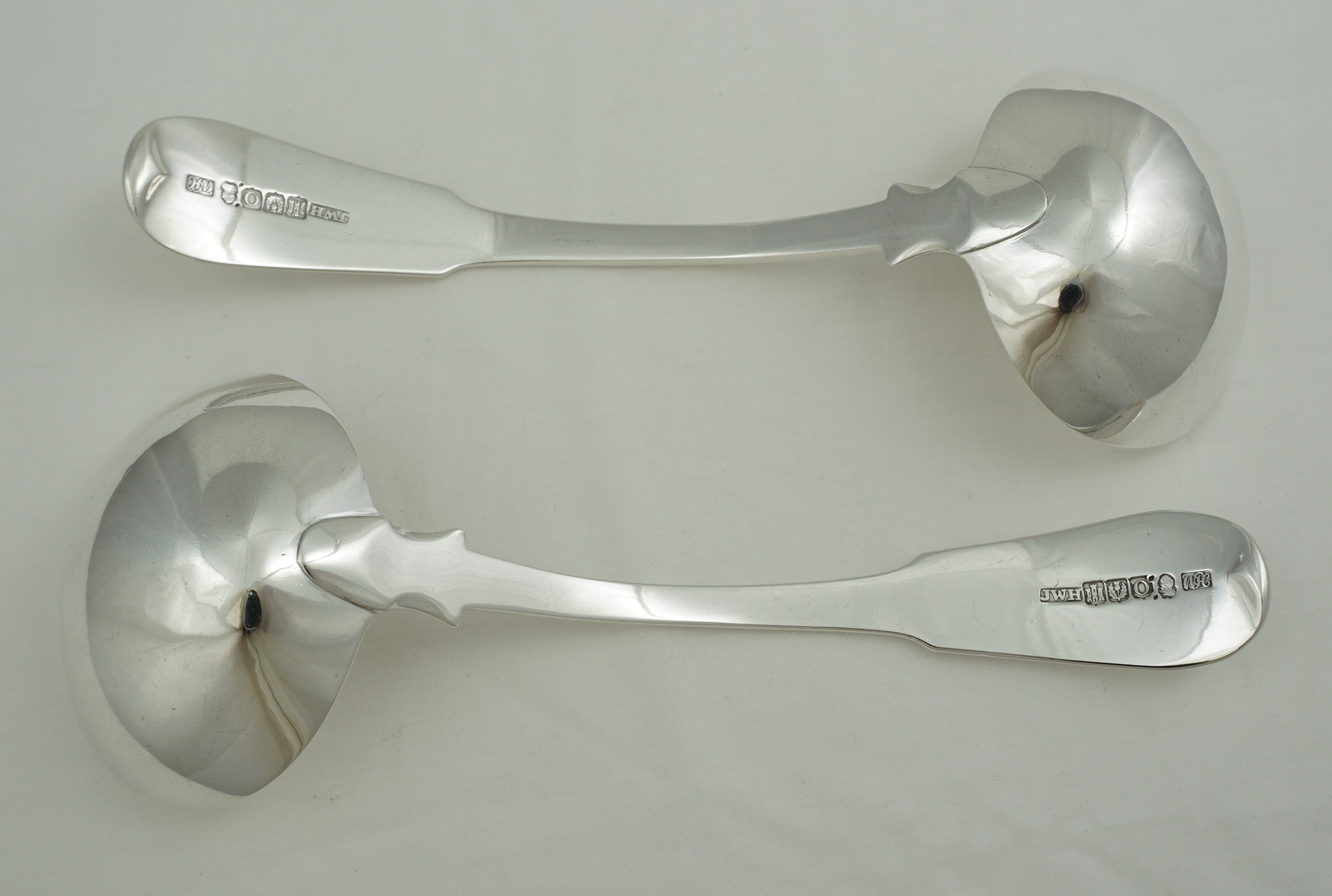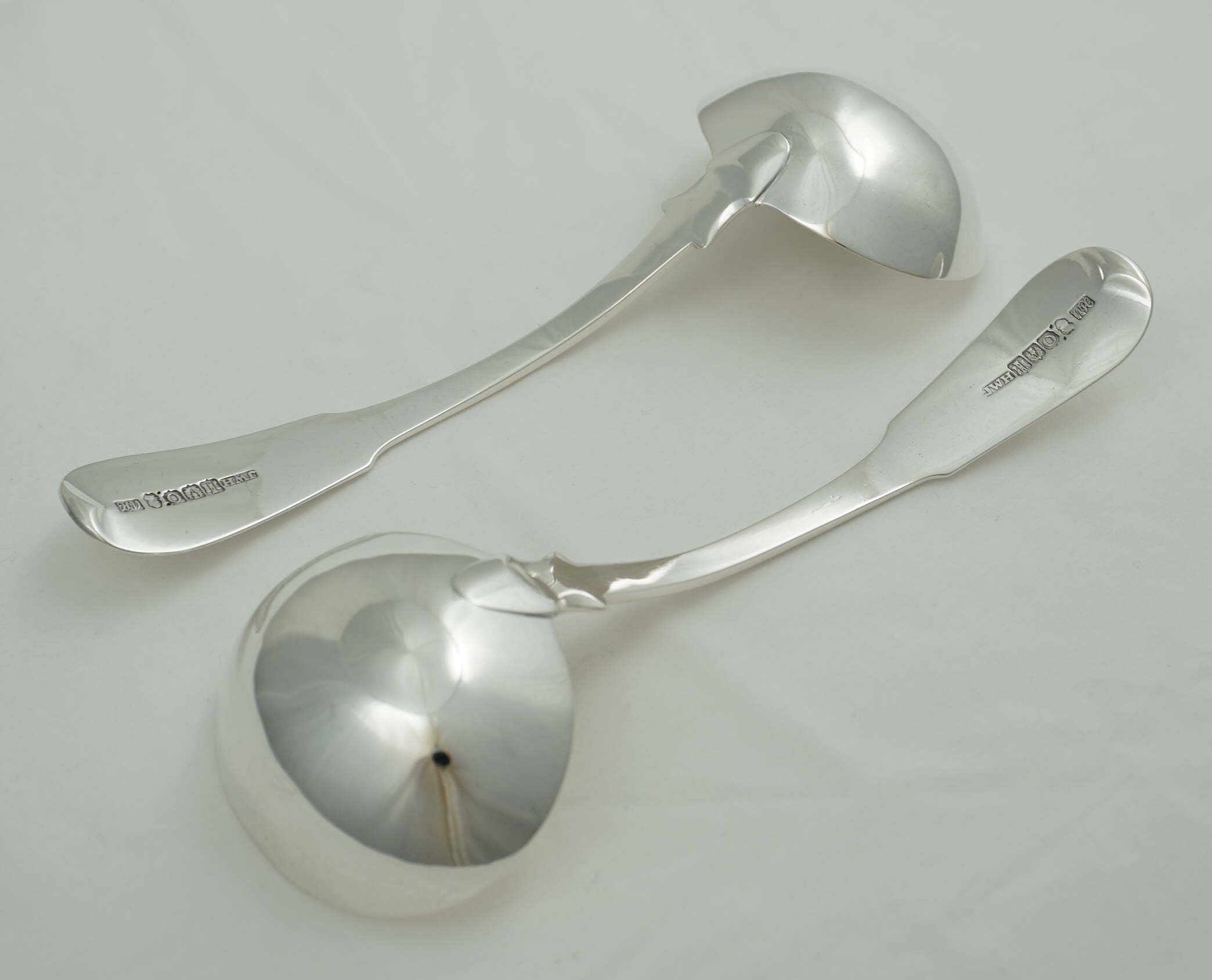 DESCRIPTION | Good and useful pair of antique Scottish Georgian solid sterling silver Fiddle pattern sauce ladles with a frontal initial 'T' engraving. |