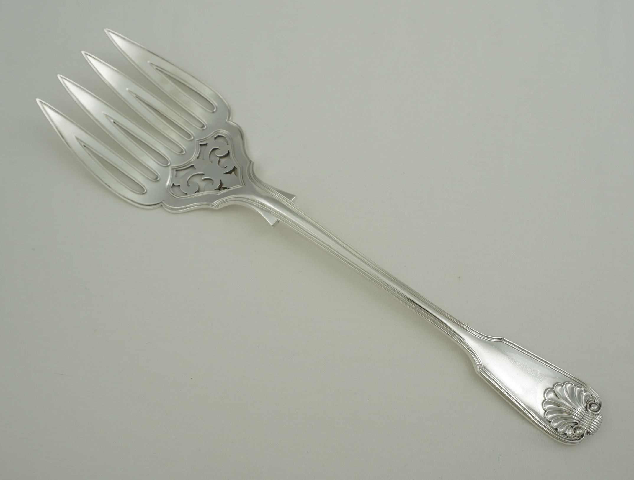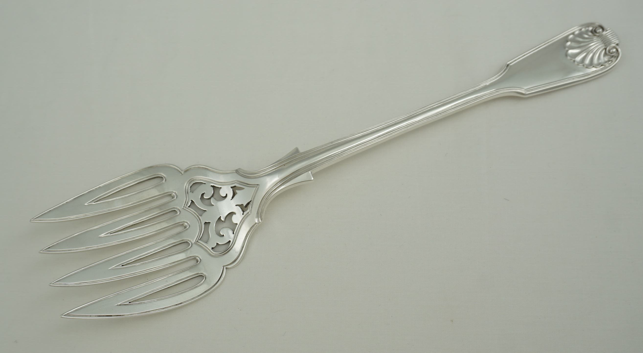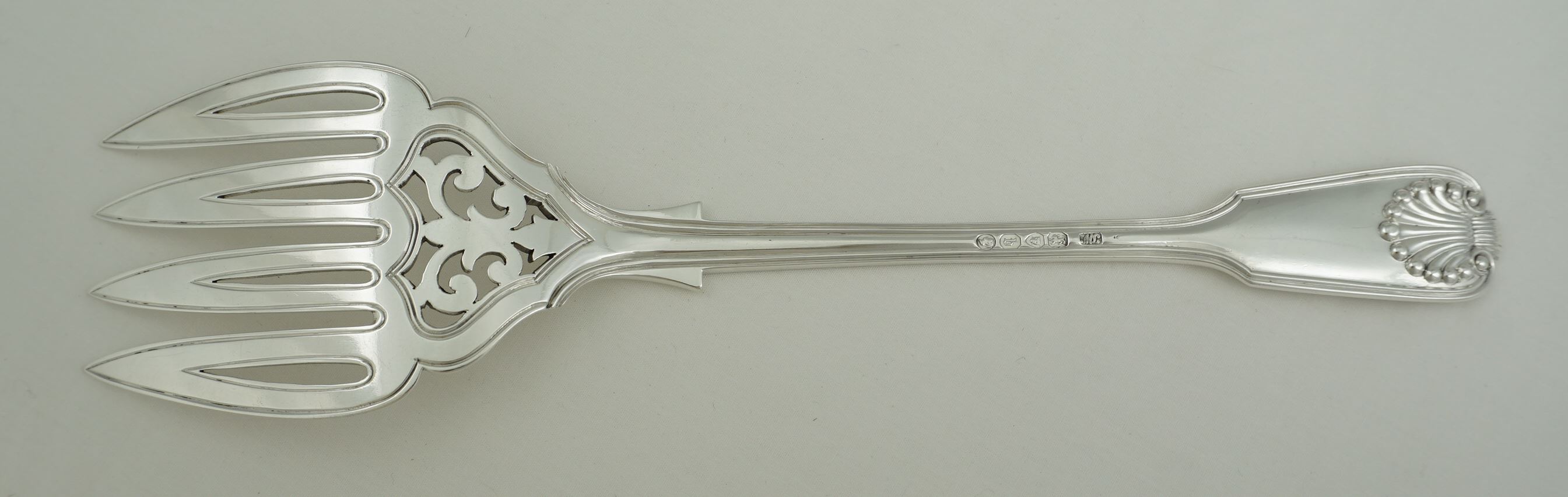 DESCRIPTION | Good antique English Victorian solid sterling silver double struck (pattern on both sides) Fiddle, Thread & Shell pattern serving fork with no engraving. |