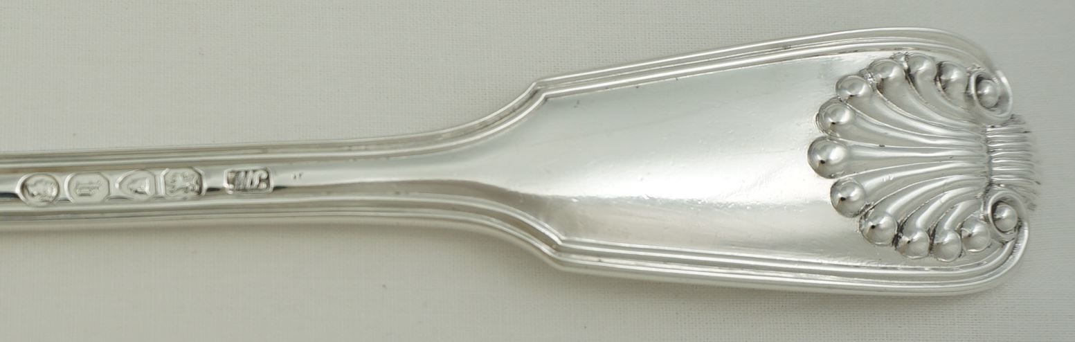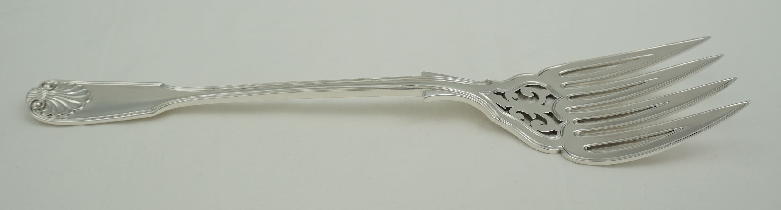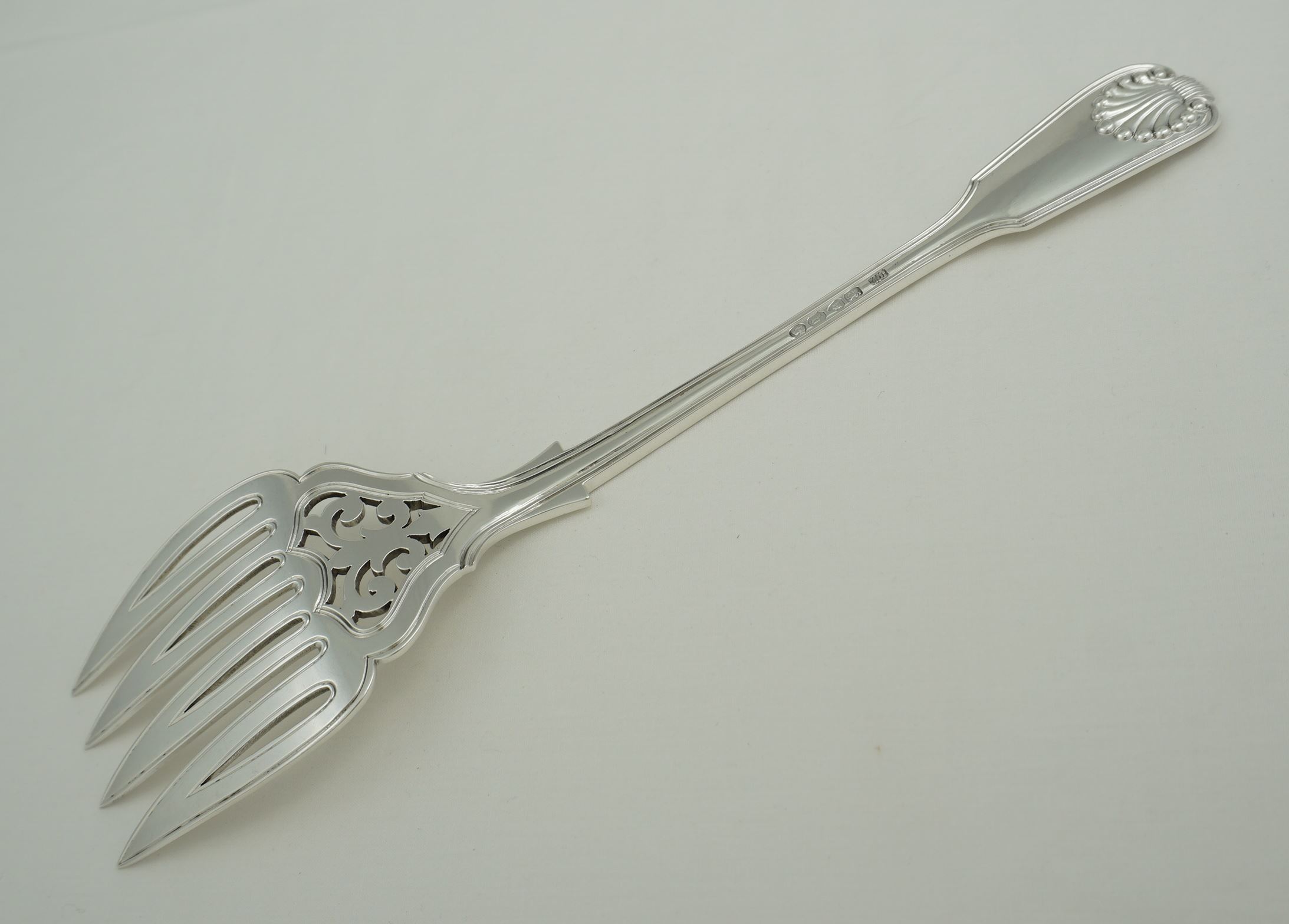 DESCRIPTION | Good antique English Victorian solid sterling silver double struck (pattern on both sides) Fiddle, Thread & Shell pattern serving fork with no engraving. |