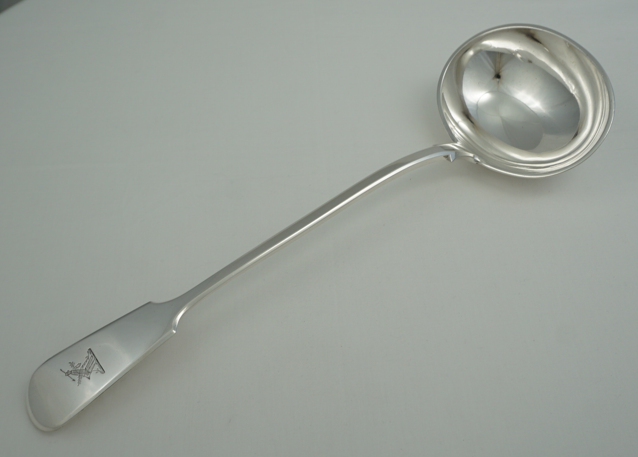DESCRIPTION | Exceptionally large, heavy and impressive antique English Victorian solid sterling silver Fiddle pattern soup ladle with a crisp frontal crest engraving. |