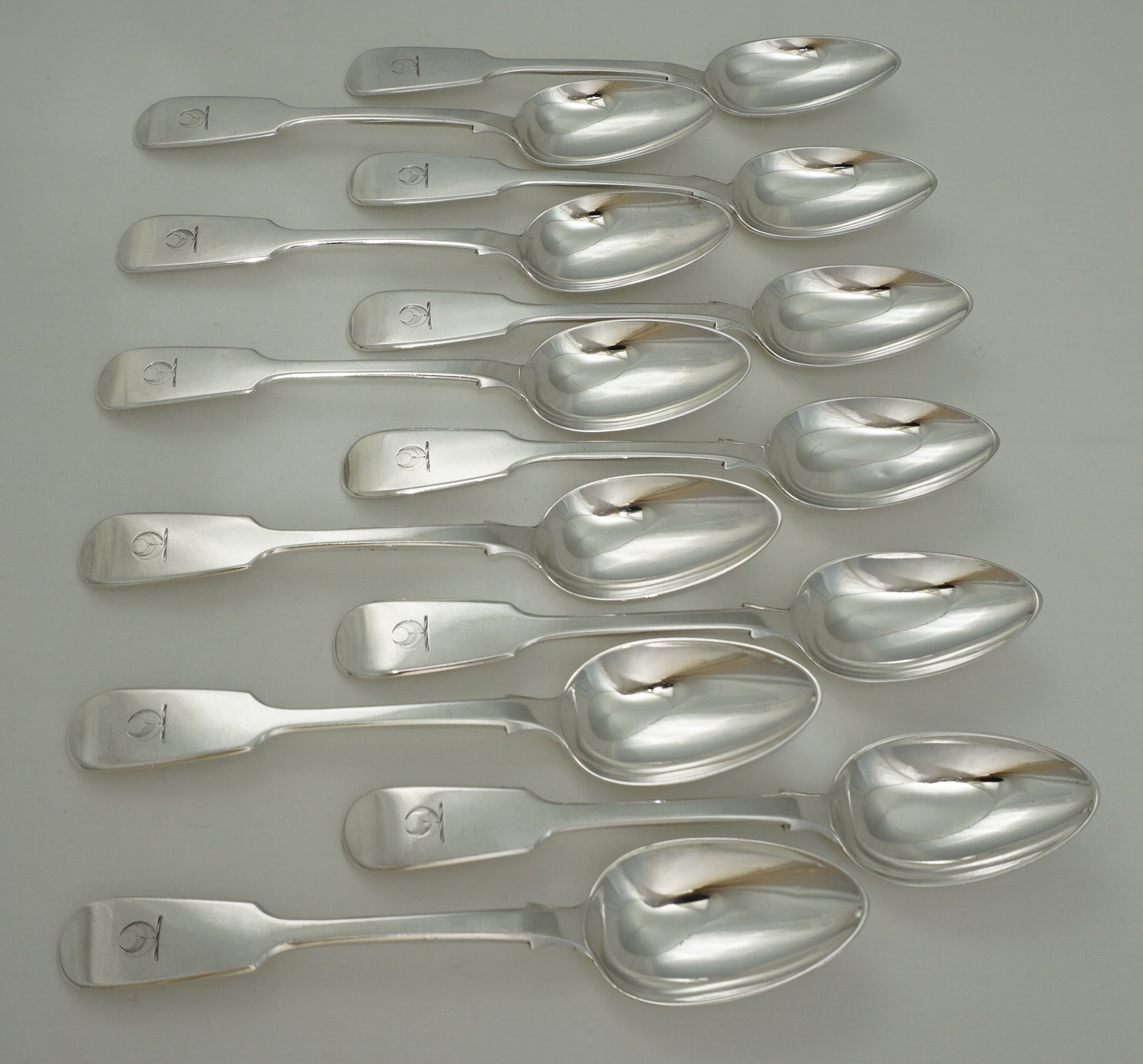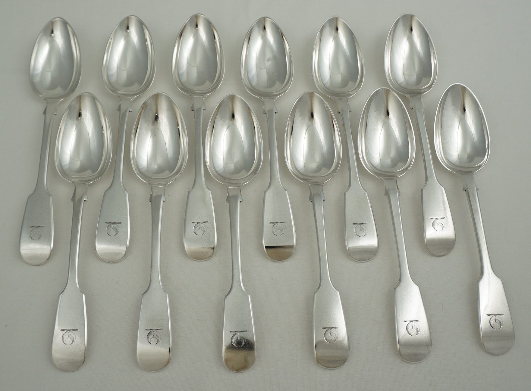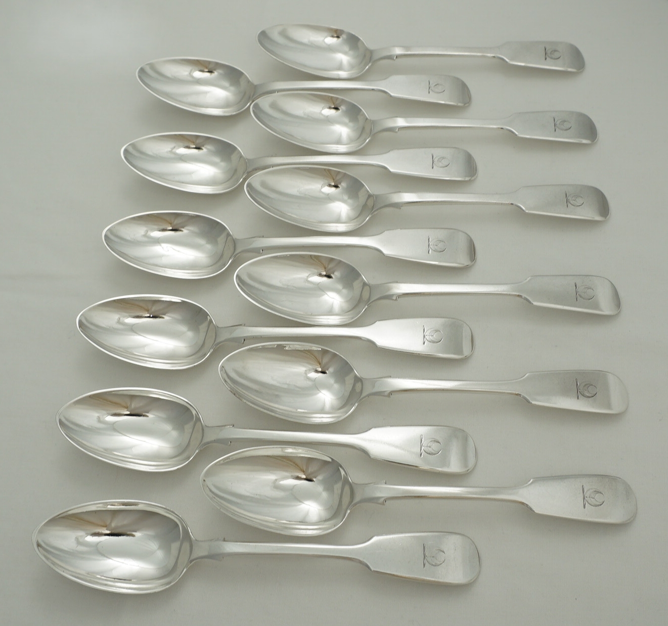 DESCRIPTION | Useful set of antique English Victorian solid sterling silver Fiddle pattern dessert spoons with a frontal crest engraving. 12 available and 8 matching (same maker, date and crest) dessert forks. |