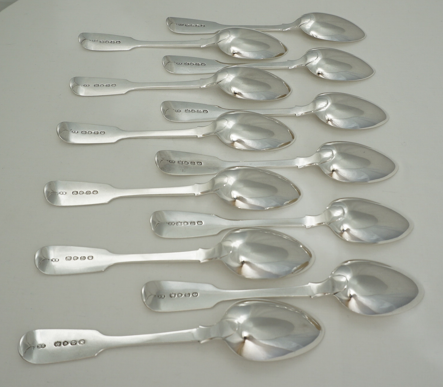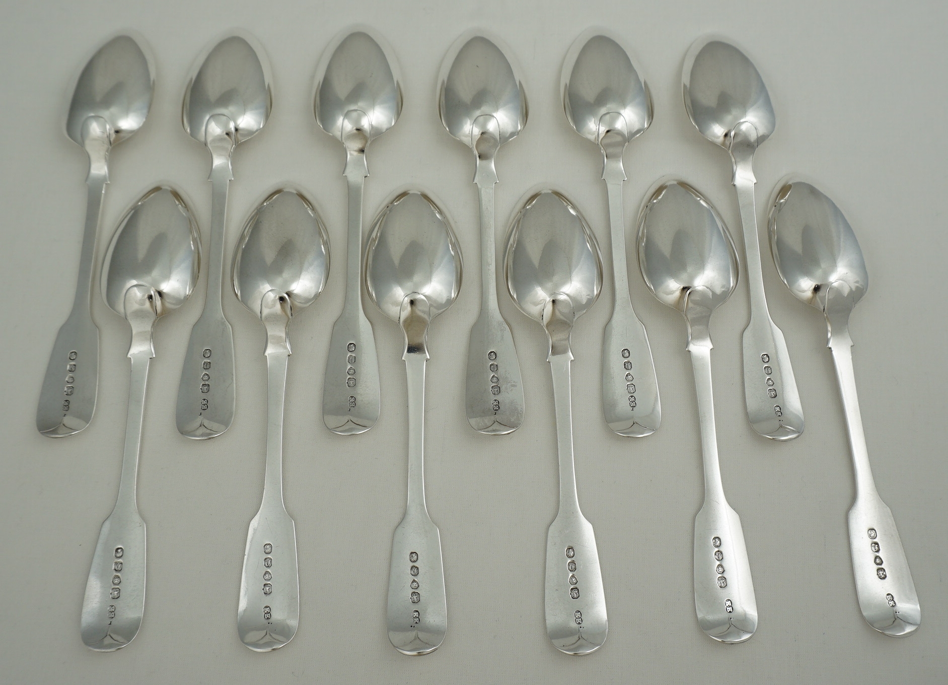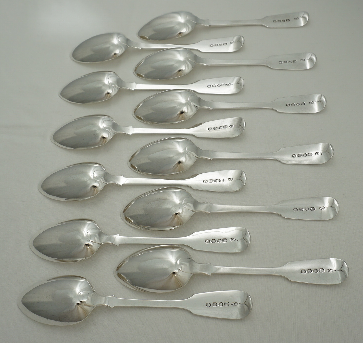 DESCRIPTION | Useful set of antique English Victorian solid sterling silver Fiddle pattern dessert spoons with a frontal crest engraving. 12 available and 8 matching (same maker, date and crest) dessert forks. |