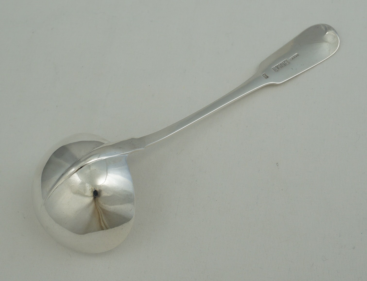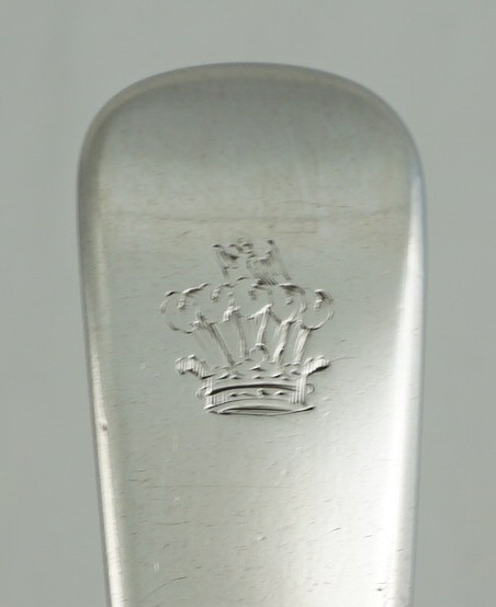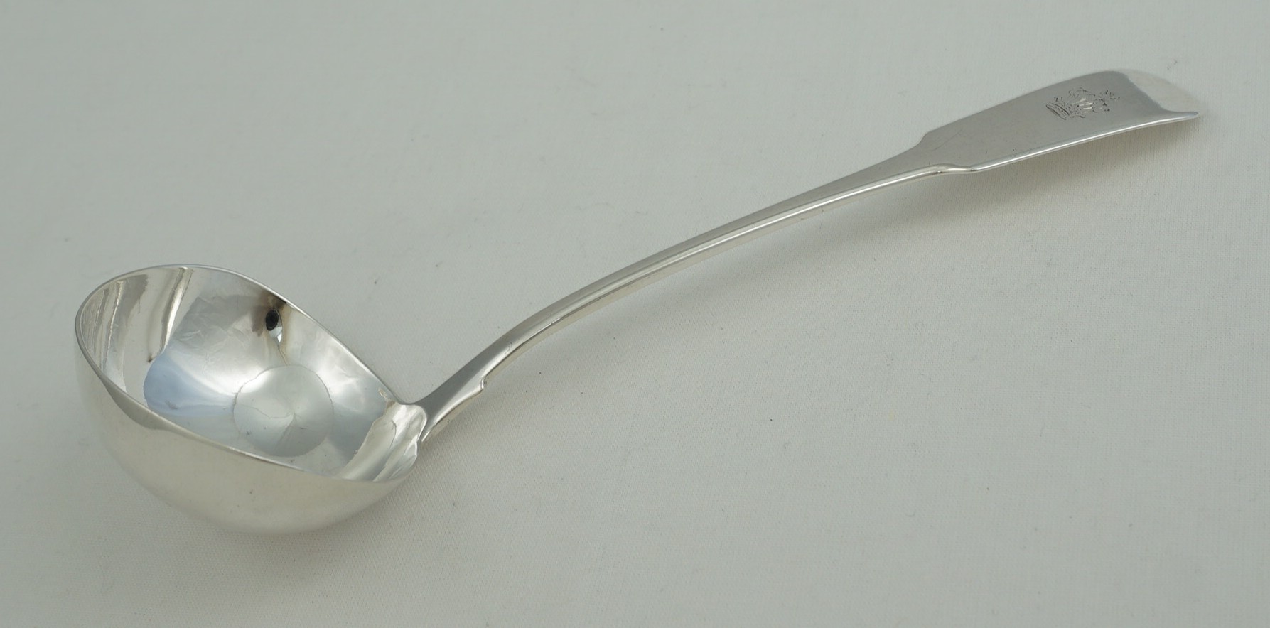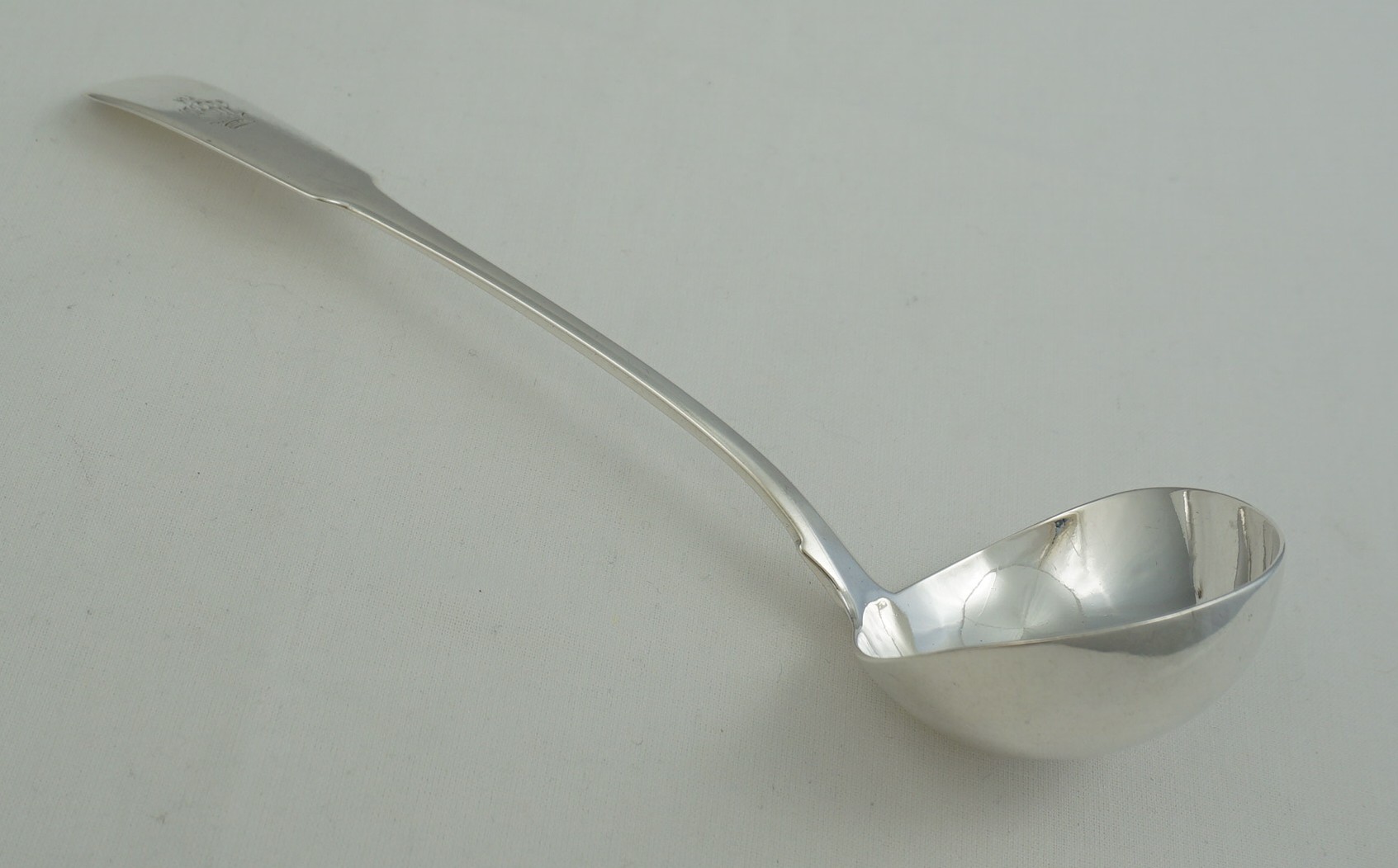 DESCRIPTION | Good antique Irish Georgian solid sterling silver Fiddle with Rat Tail pattern sauce ladle with a nice frontal crest engraving. Quirky bowl shape with both sides rising to an apex mid way. Bowl is not bent, it was clearly made this way. Tip forwards and the flow is concentrated. Tip to either side and the flow spreads out. I think the design is for sideways usage to spread your sauce more widely over your meal. |