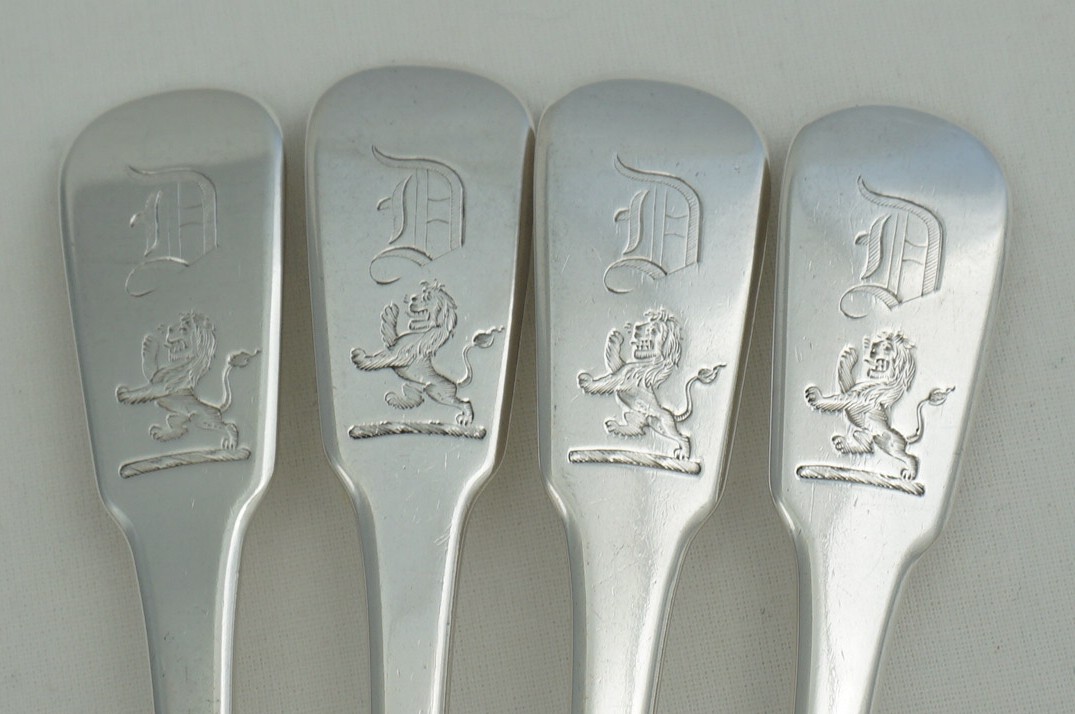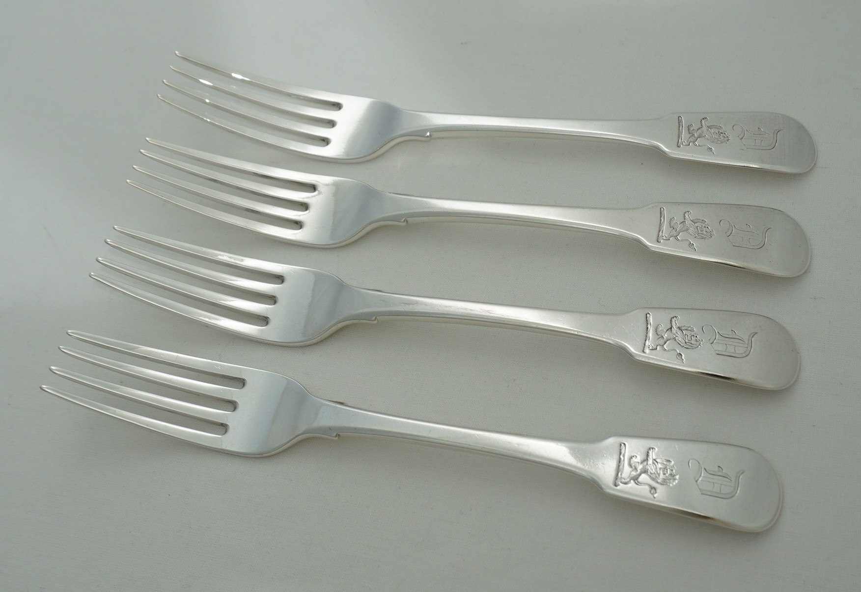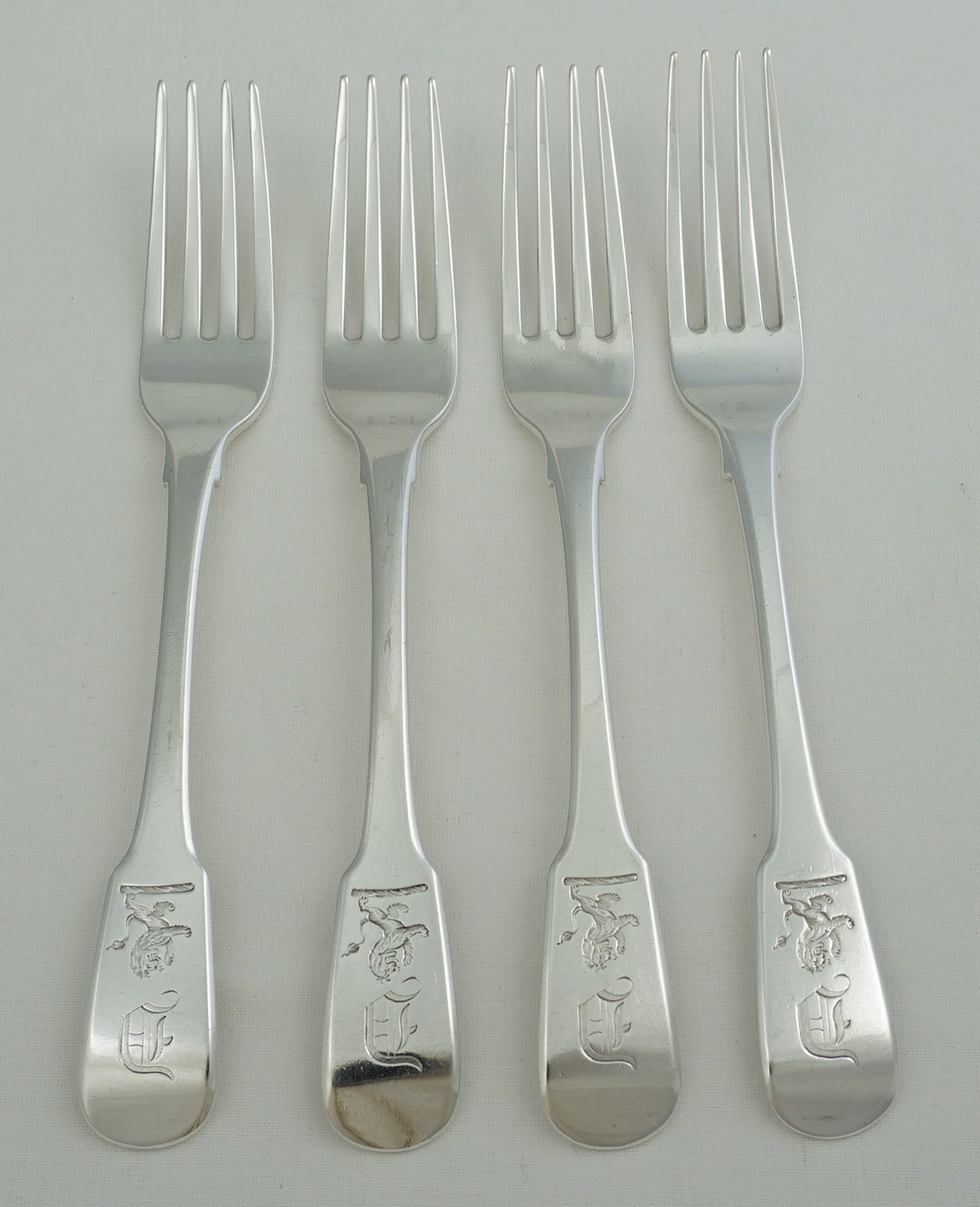 DESCRIPTION | Set of four heavy antique English Georgian solid sterling silver Fiddle pattern table forks with fabulous frontal engravings. |
