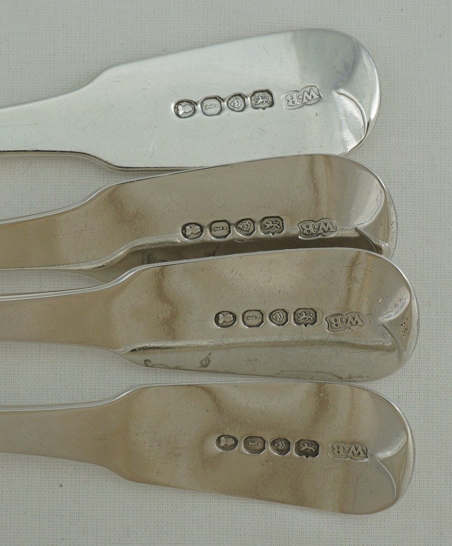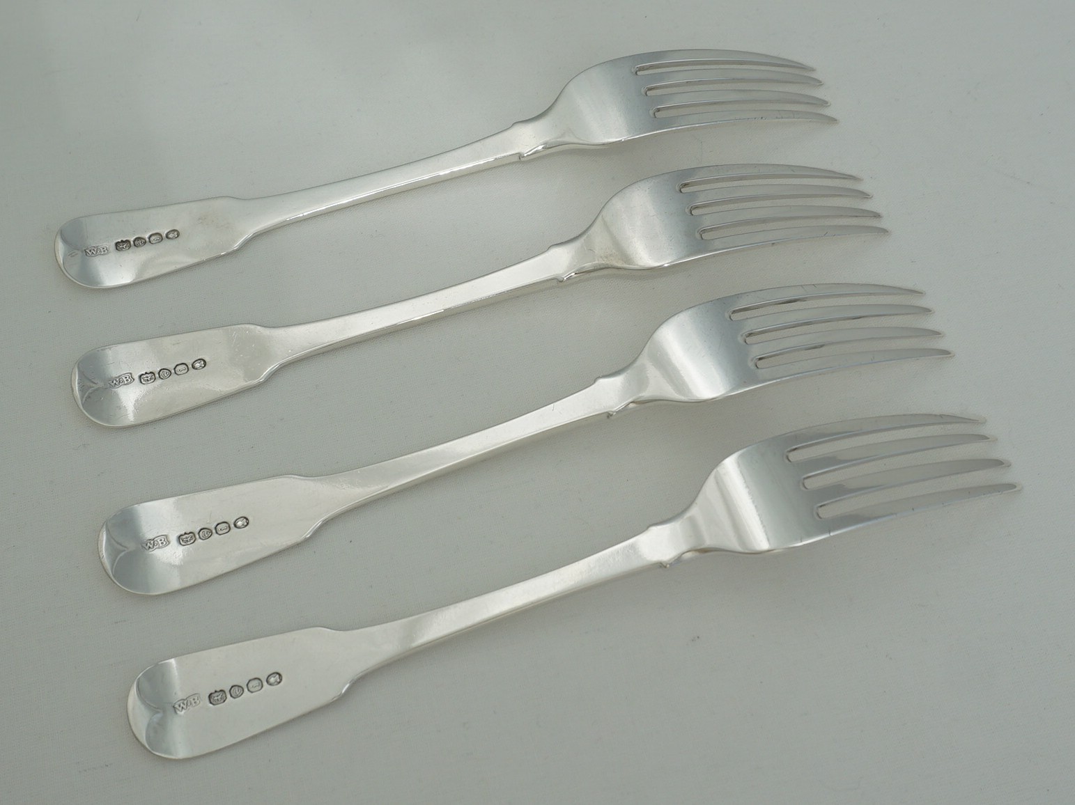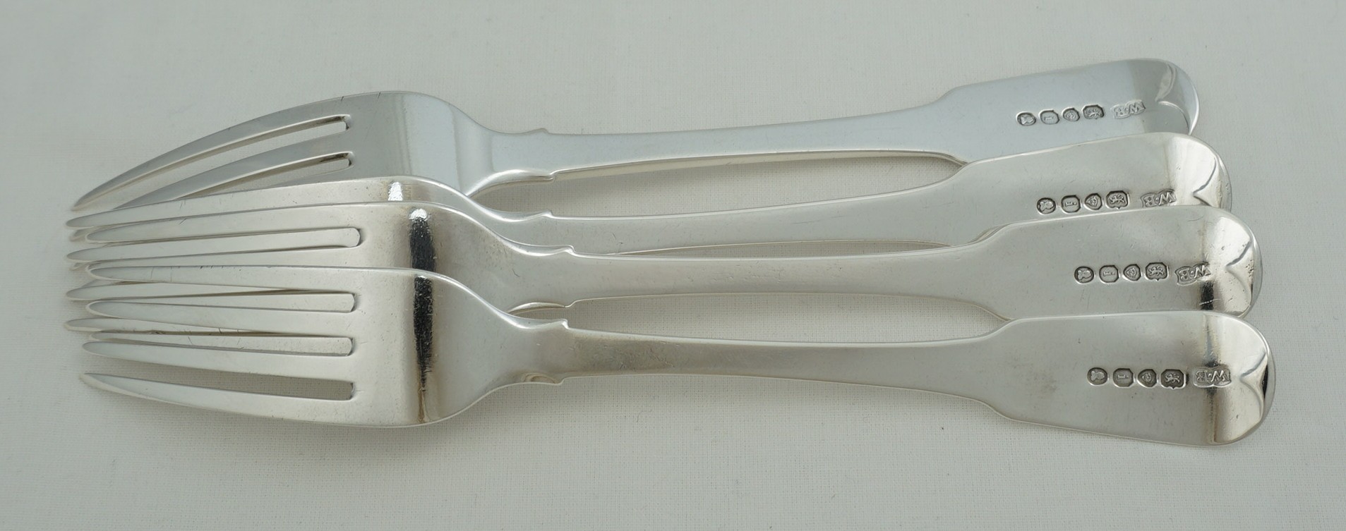 DESCRIPTION | Set of four heavy antique English Georgian solid sterling silver Fiddle pattern table forks with fabulous frontal engravings. |
