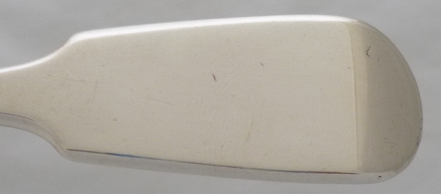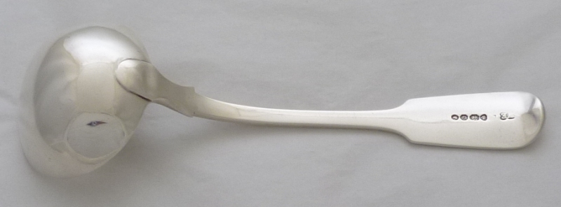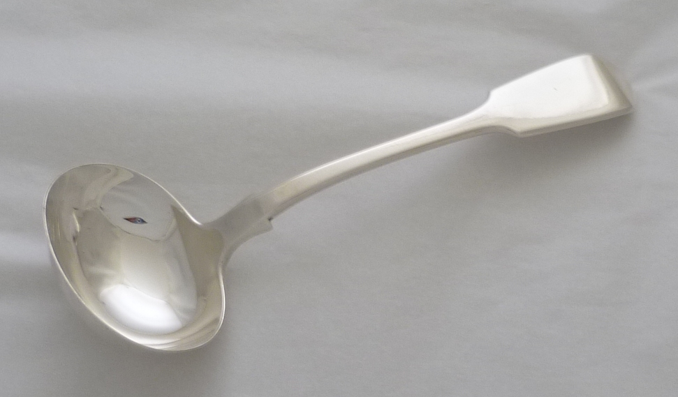 Heavy Victorian silver Fiddle pattern sauce ladle, no engravings but probable well executed frontal erasure. |