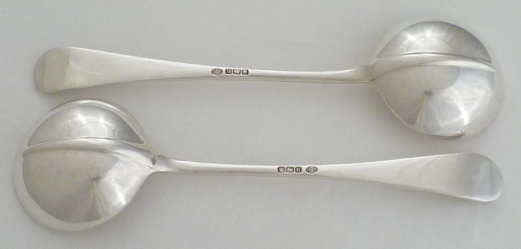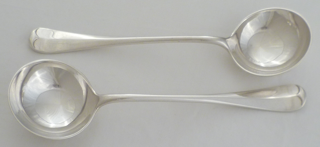 DESCRIPTION | Superb pair of heavy silver round bowled Hanoverian with long rat tail pattern sauce ladles with no engravings or erasures. Would also work as luxurious soup spoons. |