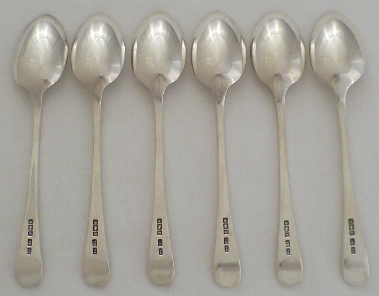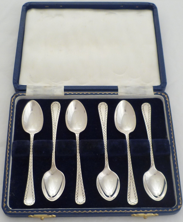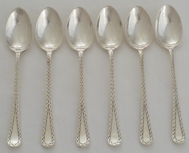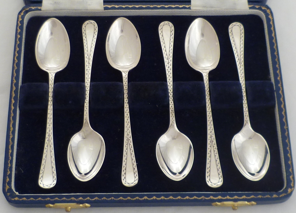 DESCRIPTION | High quality, pretty and cased set of six silver bright cut Hanoverian pattern tea or coffee spoons. The case is in good condition and is probably later. |