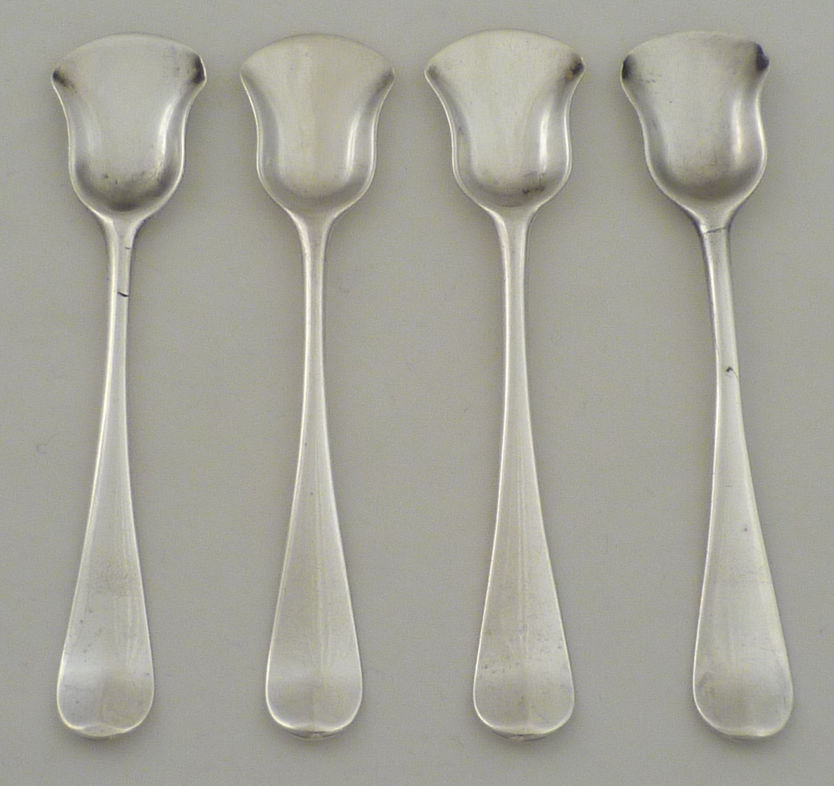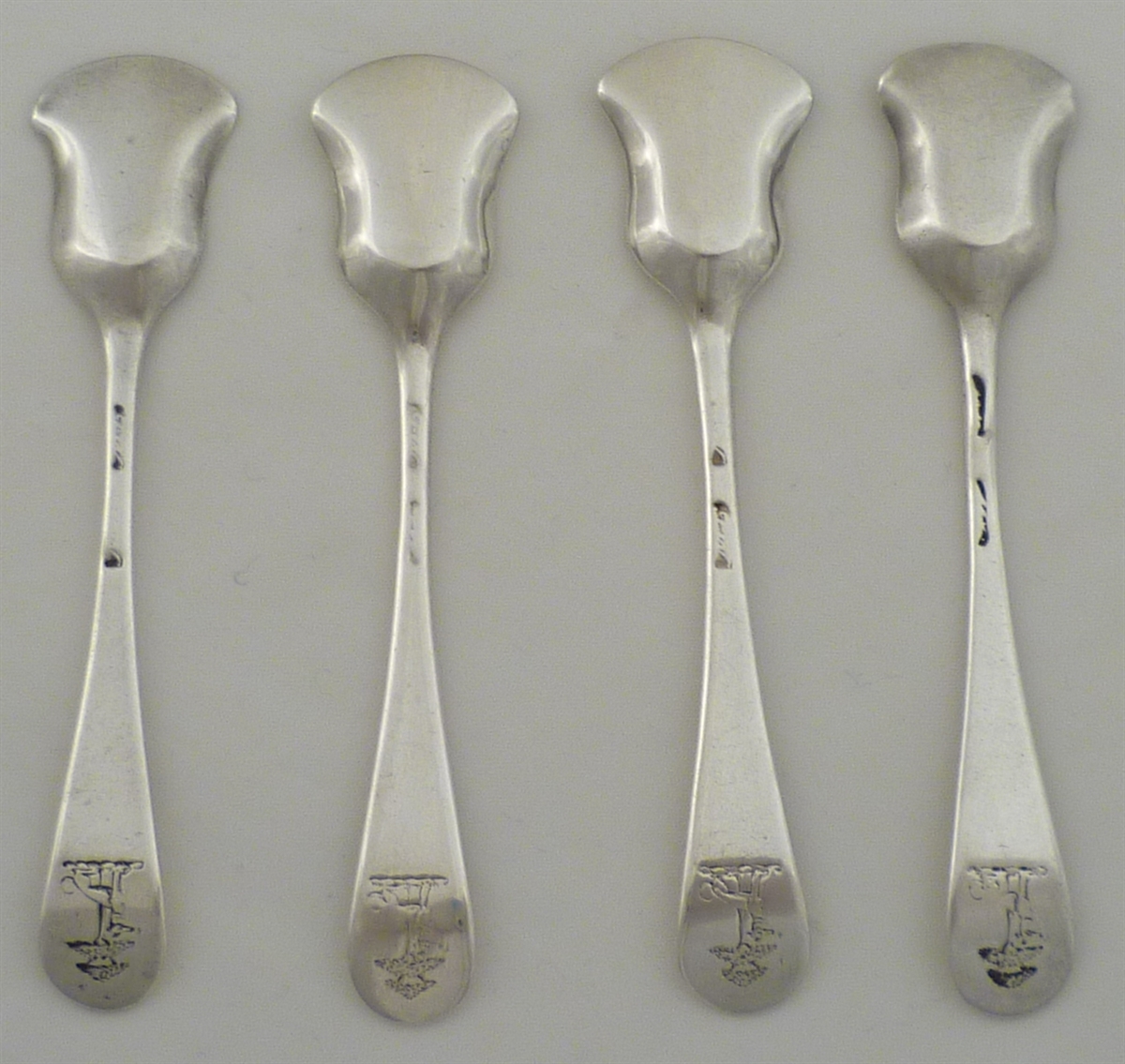 DESCRIPTION | Extremely rare set of four Georgian silver Hanoverian pattern salt shovels with attractive crest engraving verso. |
