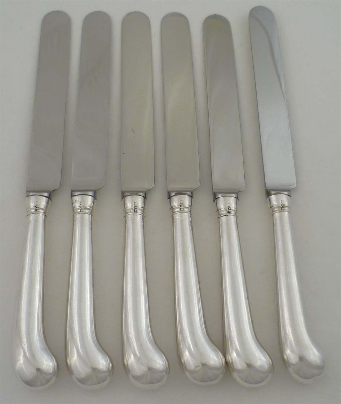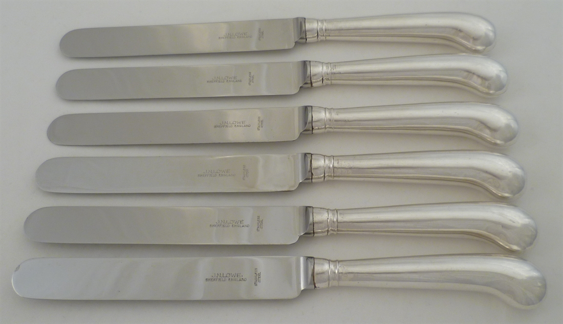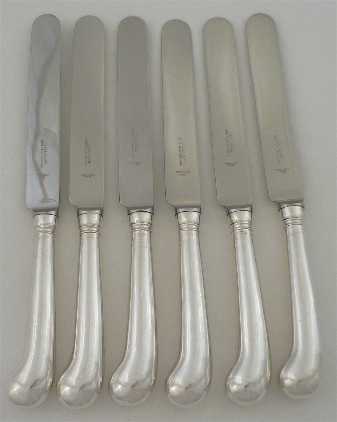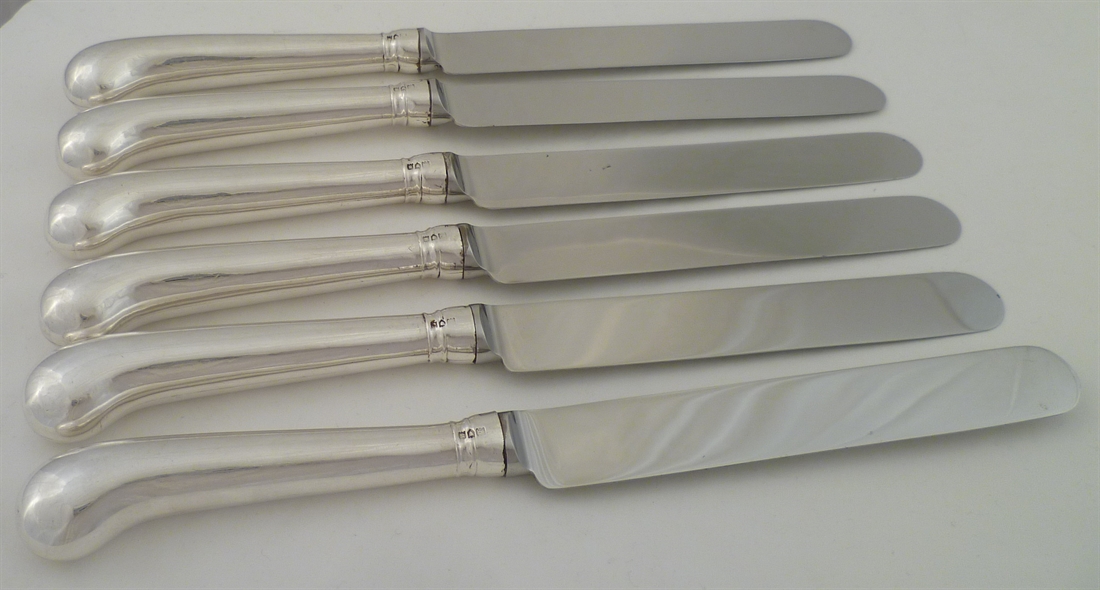 DESCRIPTION | Set of six Pistol Grip table knives with loaded silver handles and modern mirror finished parallel stainless steel blades. Probably not dishwasher safe, best to hand wash. |