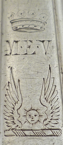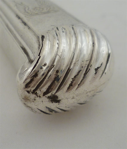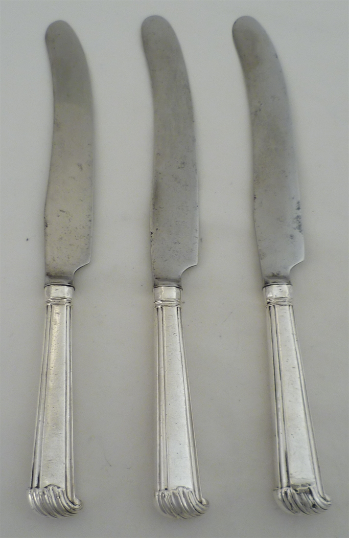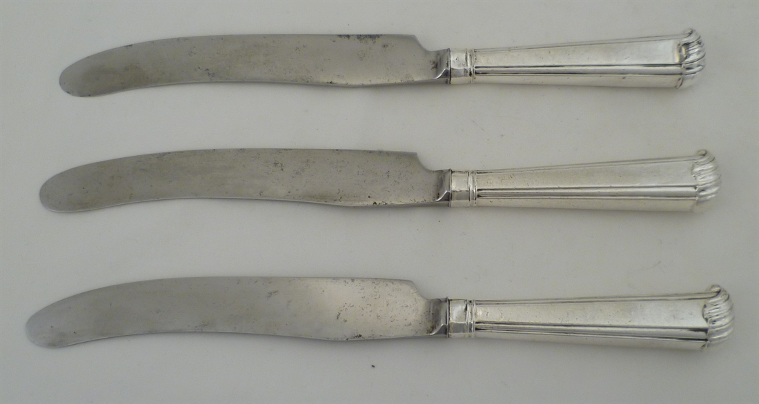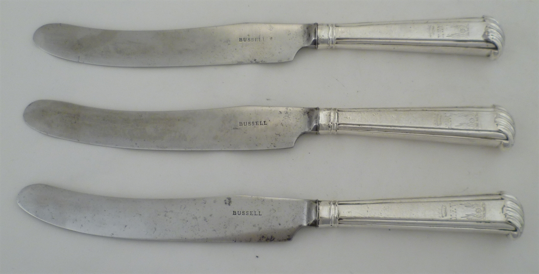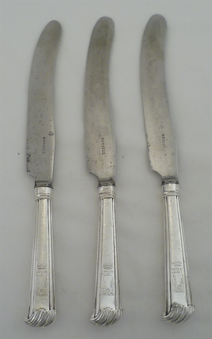 DESCRIPTION | Scarce set of three pitch loaded leaf capped reed decorated silver handled table knives with old steel scimitar blades marked by the cutlers 'Bussell'. Each handle engraved to one side with a coronet above initials above a crest. These blades were out of fashion by 1835 so I expect they were made to replace or add to a set from the mid-18th century although this handle shape works with most flatware patterns and is comfortable to use. The old steel is still good so I have not replaced the blades. |