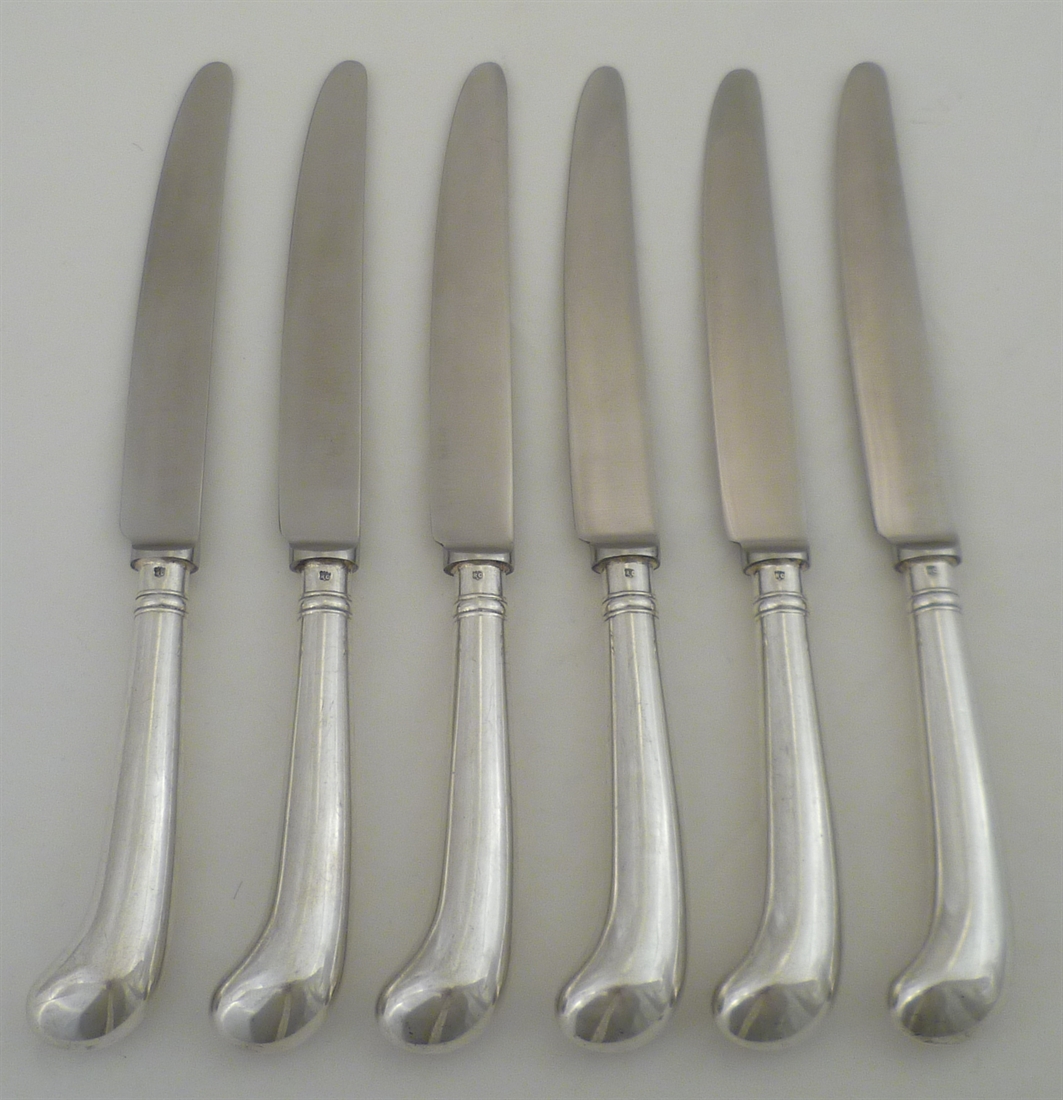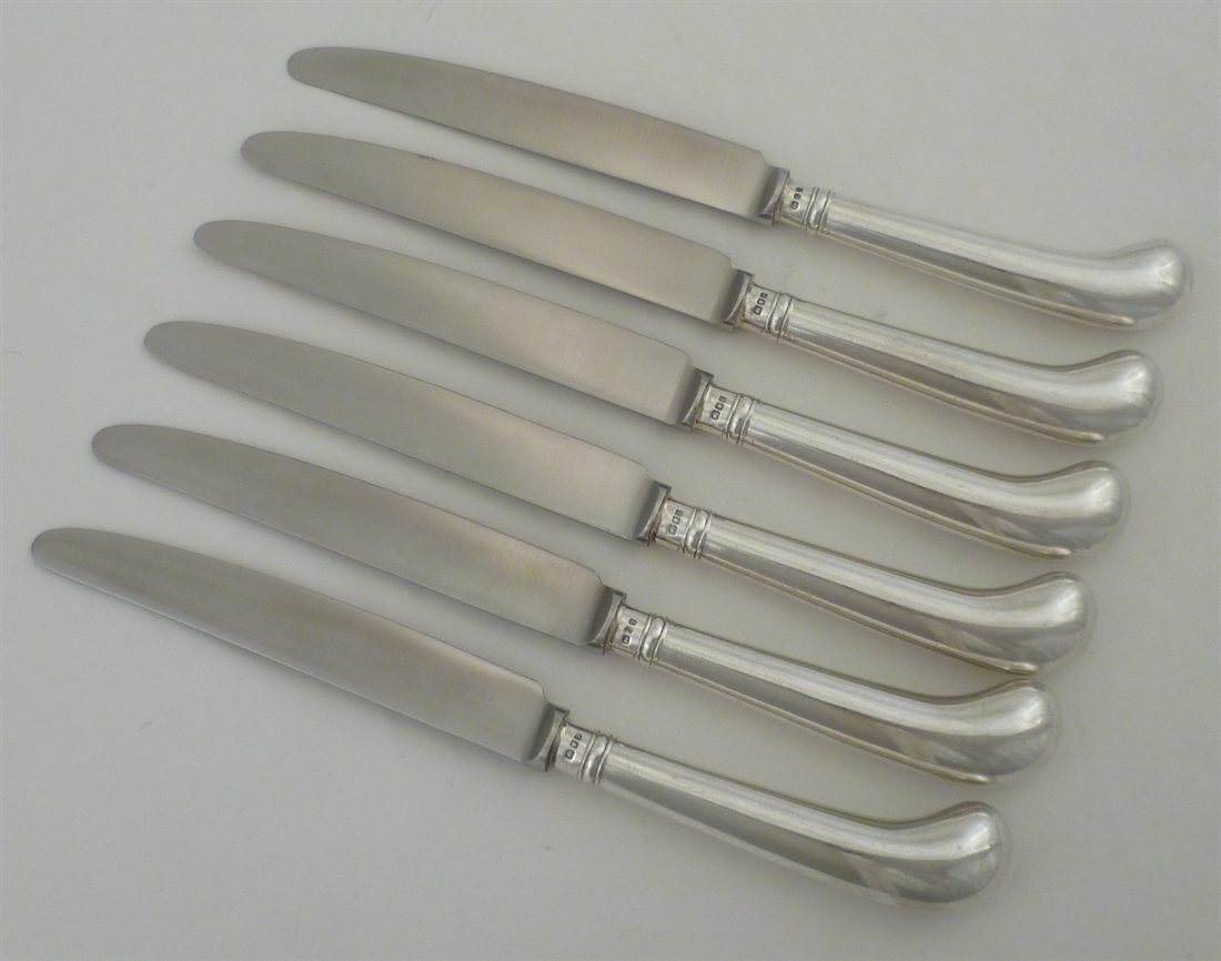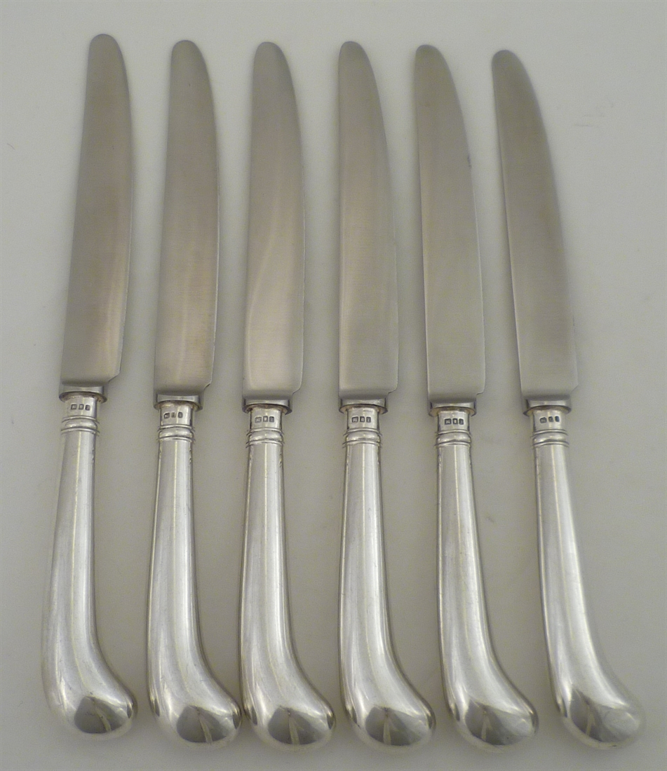 DESCRIPTION | Good set of six table knives with new taper point satin finish stainless steel blades and loaded silver Pistol Grip handles. Historically this handle shape was used with Hanoverian and early Old English pattern flatware. No engraving or erasure and the joints are soldered so these could be safely cleaned in a dishwasher. Great set for everyday/regular use and should last almost forever. |