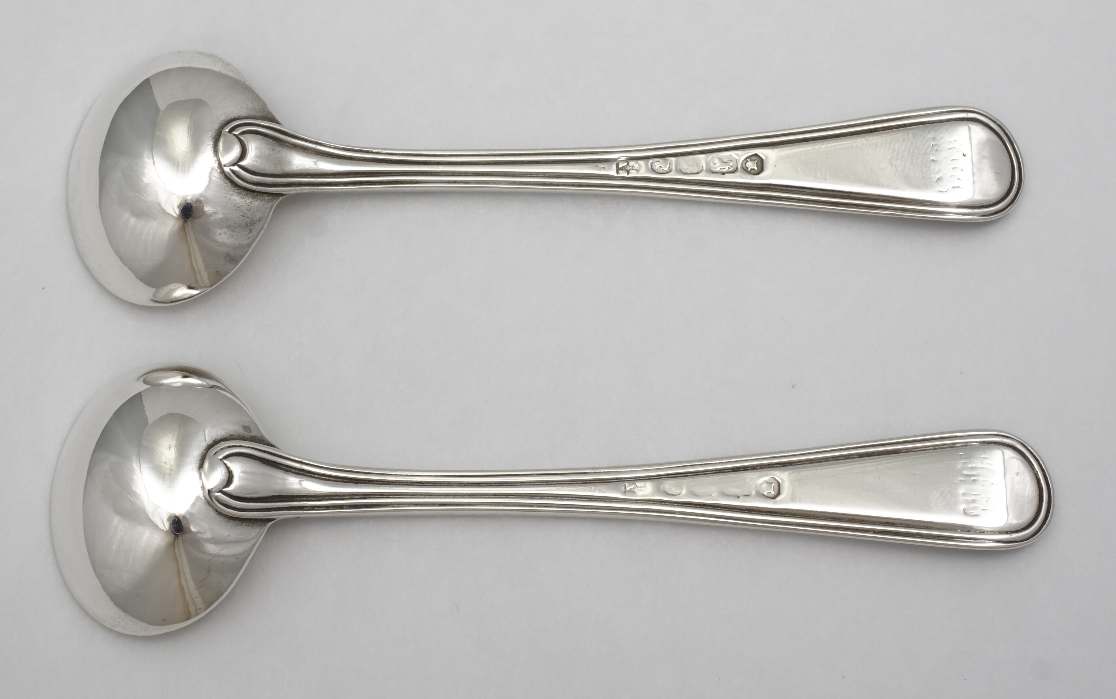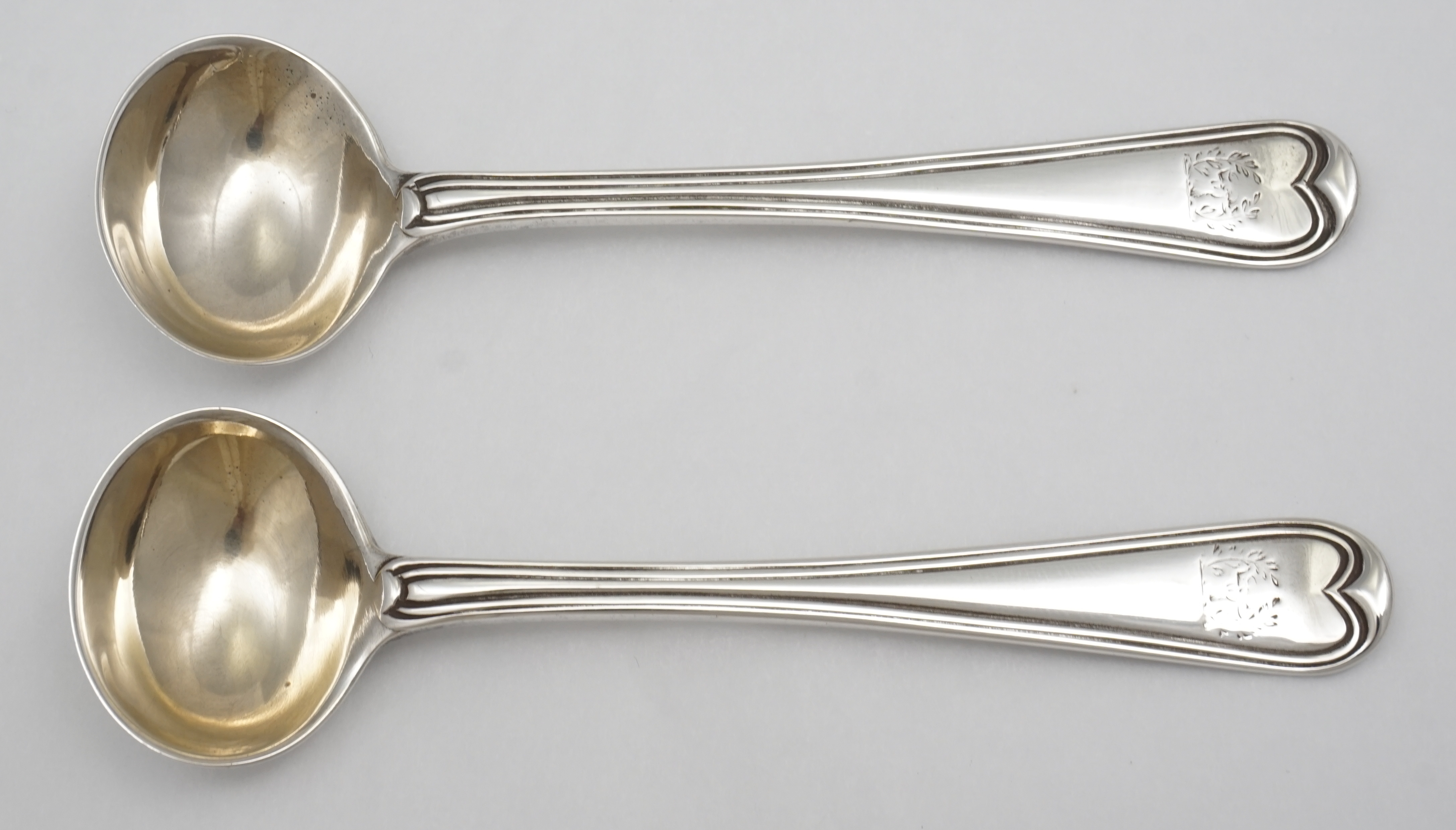 DESCRIPTION | Scarce pair of antique English early Victorian solid sterling silver Hanoverian & Thread pattern salt spoons with frontal crest and monogram engraving verso. |