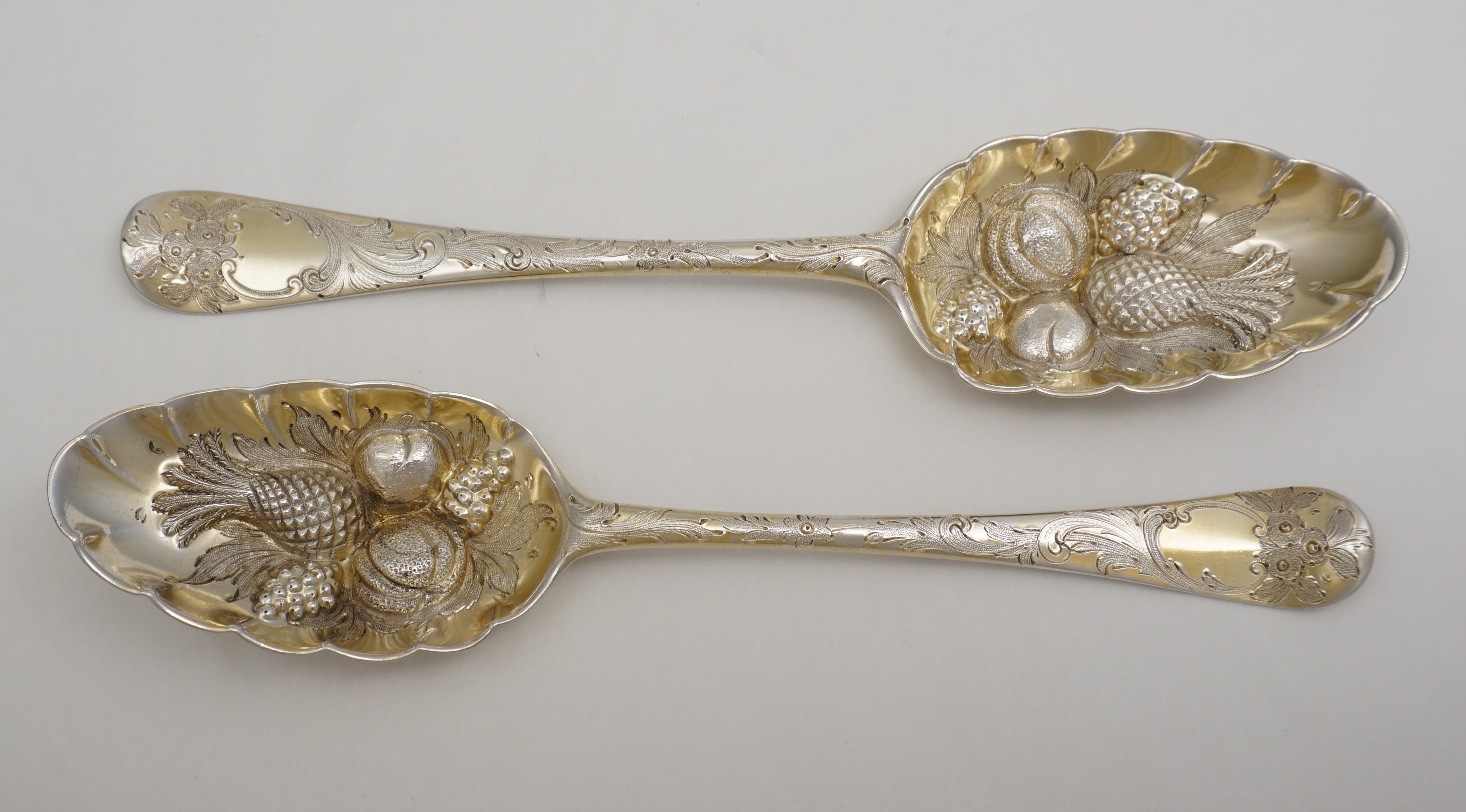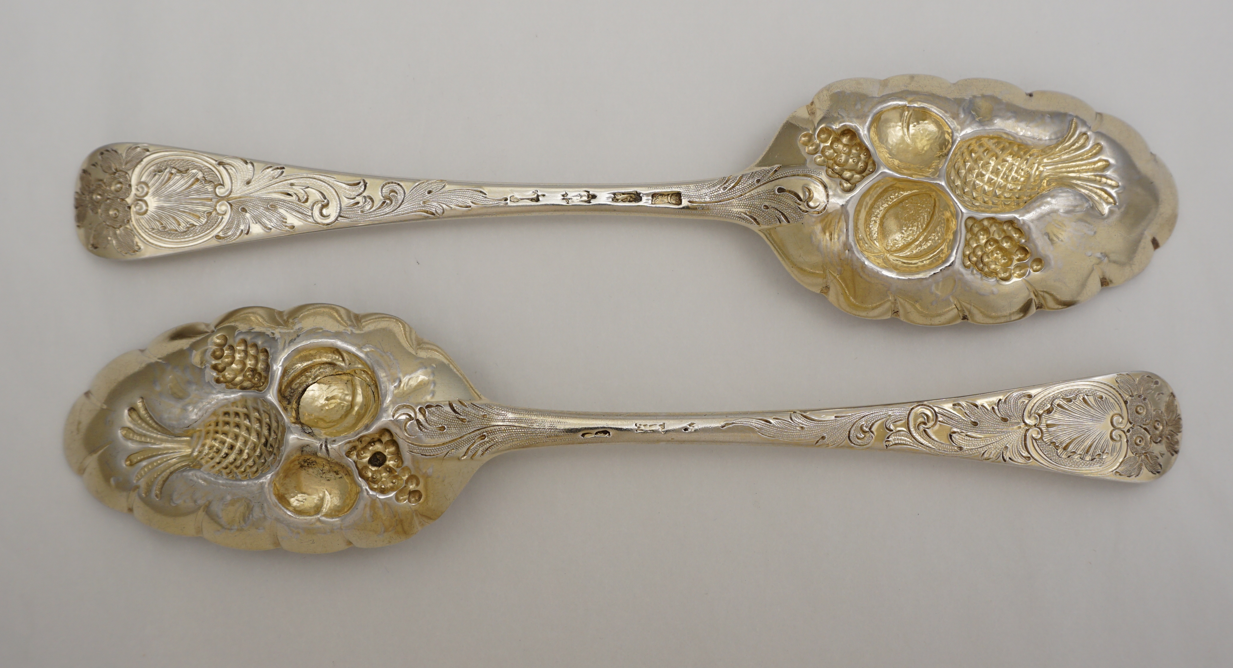 DESCRIPTION | Good pair of antique English Georgian solid sterling silver fully gilt Hanoverian pattern 'Berry' table spoons with later embossed and engraved decoration. |