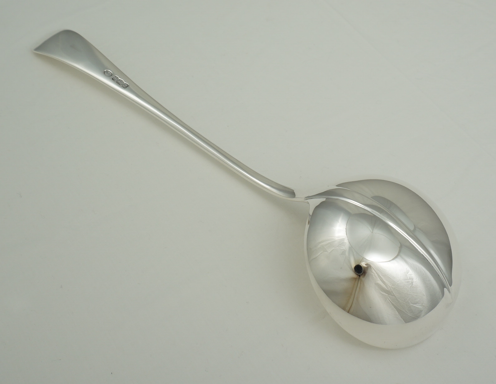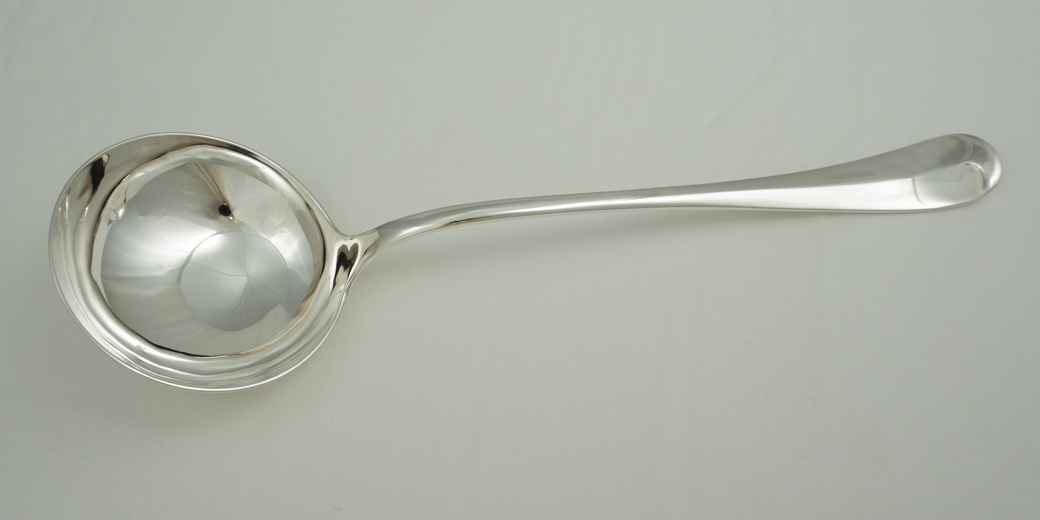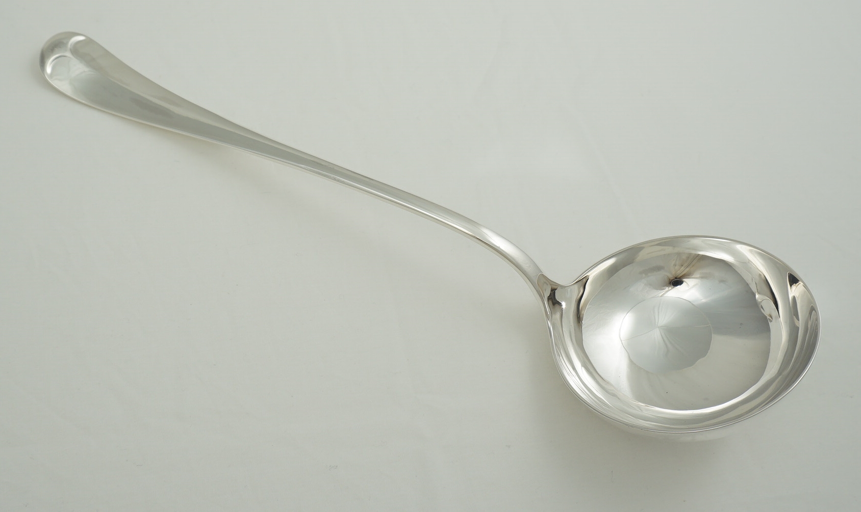 DESCRIPTION | Excellent antique English solid sterling silver Hanoverian with Rat Tail pattern soup ladle with no engraving or erasure. |