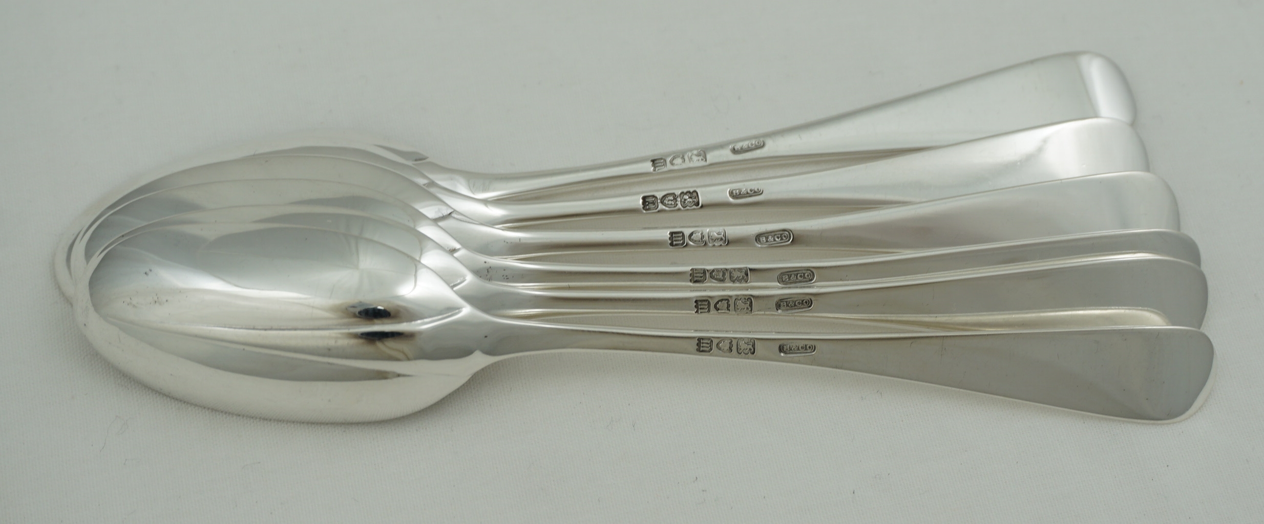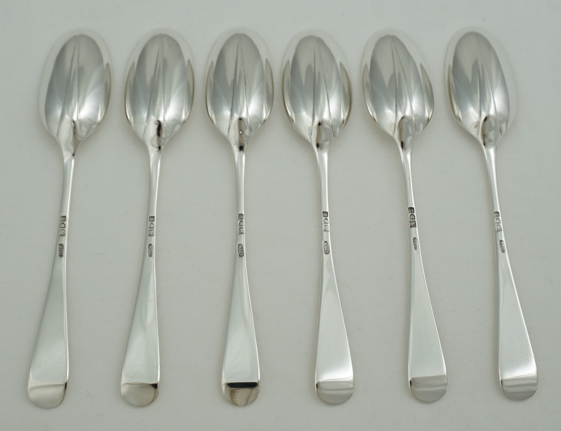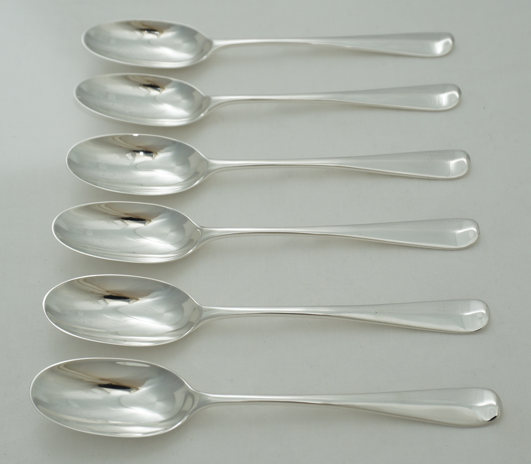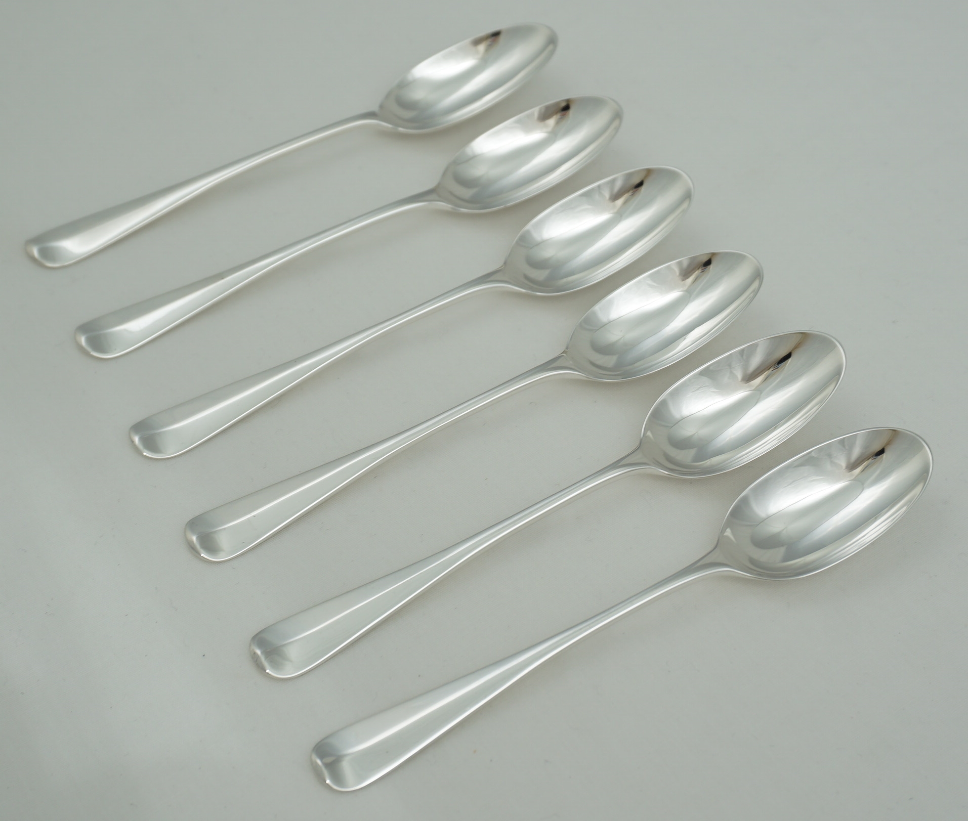 DESCRIPTION | Set of six antique English George I 1720s style Edwardian solid sterling silver Hanoverian with Rat Tail pattern teaspoons with no engraving or erasure. This earliest form of Hanoverian pattern is identified by the long, narrow bowl, full length rat tail and central rib. Nice touch is the attempt to place the hallmarks low down the stem. |