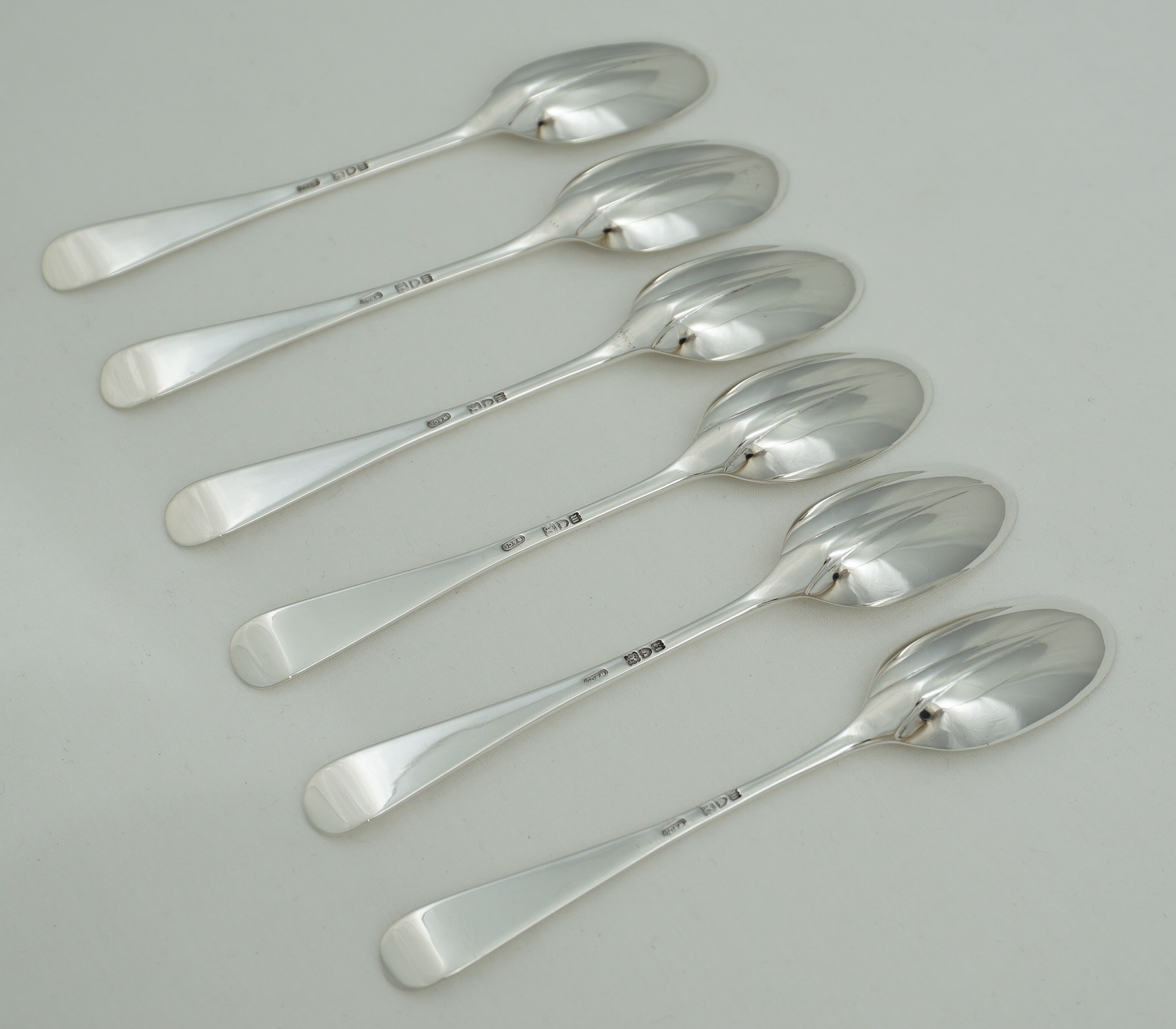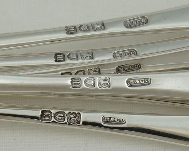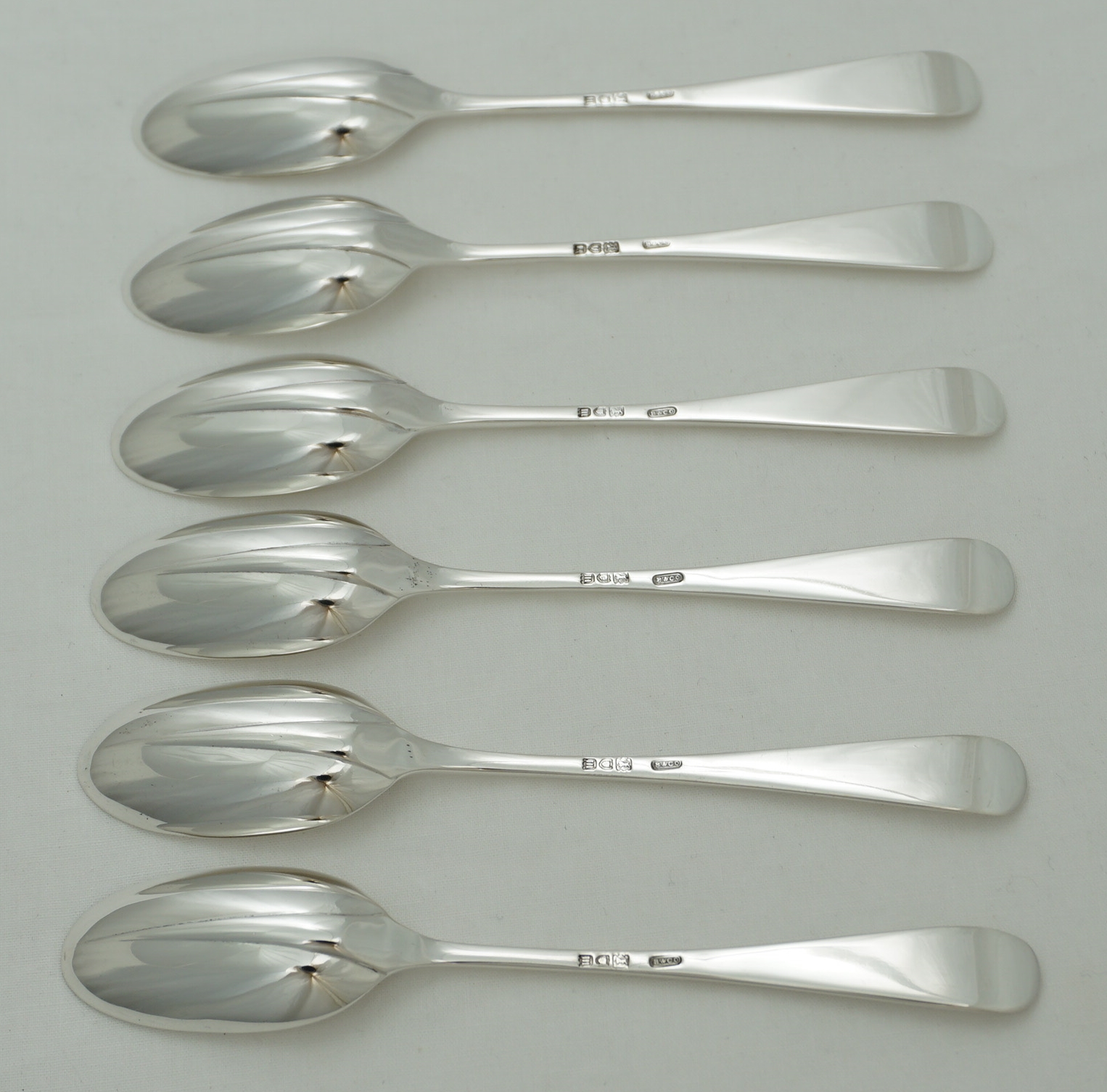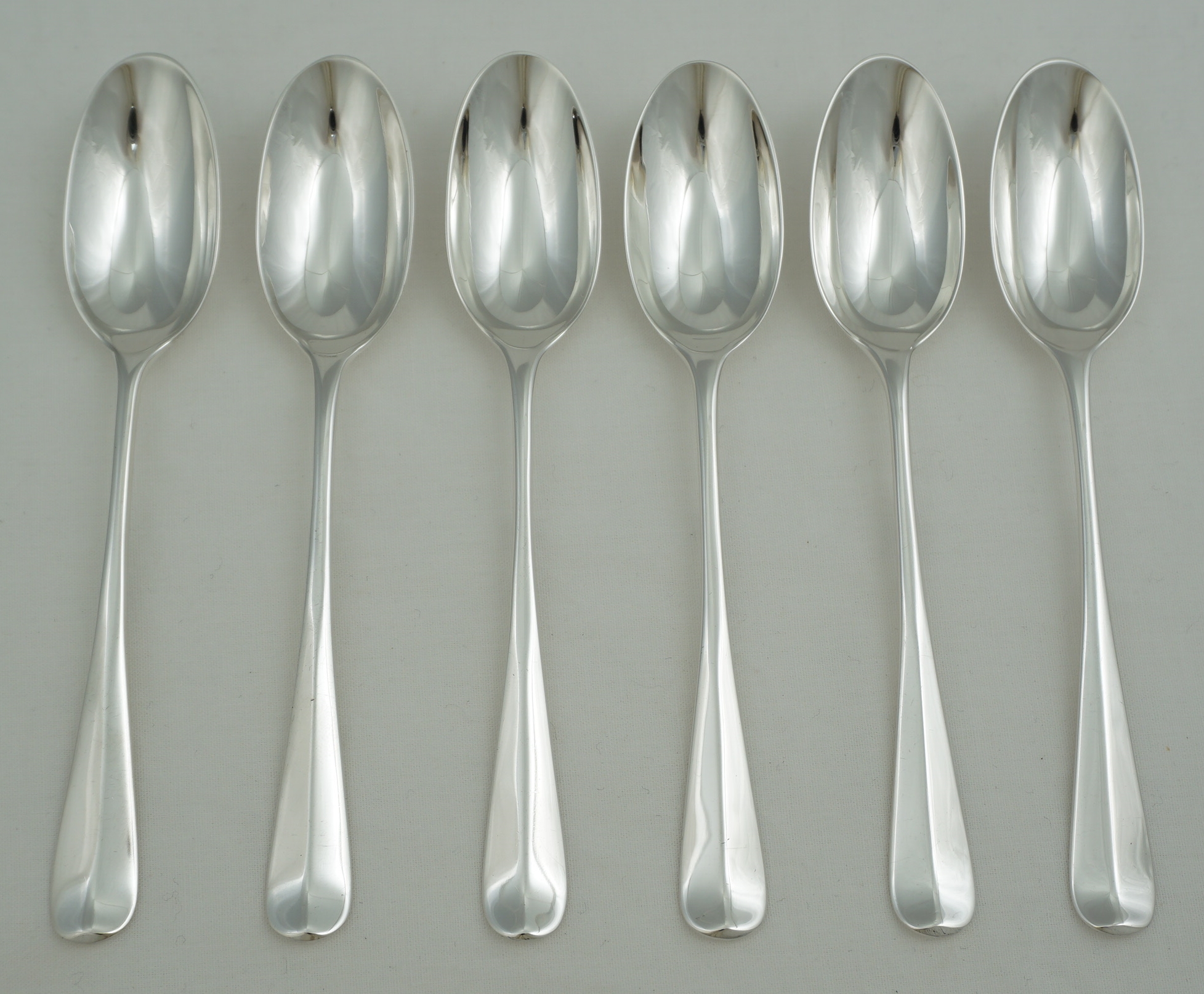 DESCRIPTION | Set of six antique English George I 1720s style Edwardian solid sterling silver Hanoverian with Rat Tail pattern teaspoons with no engraving or erasure. This earliest form of Hanoverian pattern is identified by the long, narrow bowl, full length rat tail and central rib. Nice touch is the attempt to place the hallmarks low down the stem. |