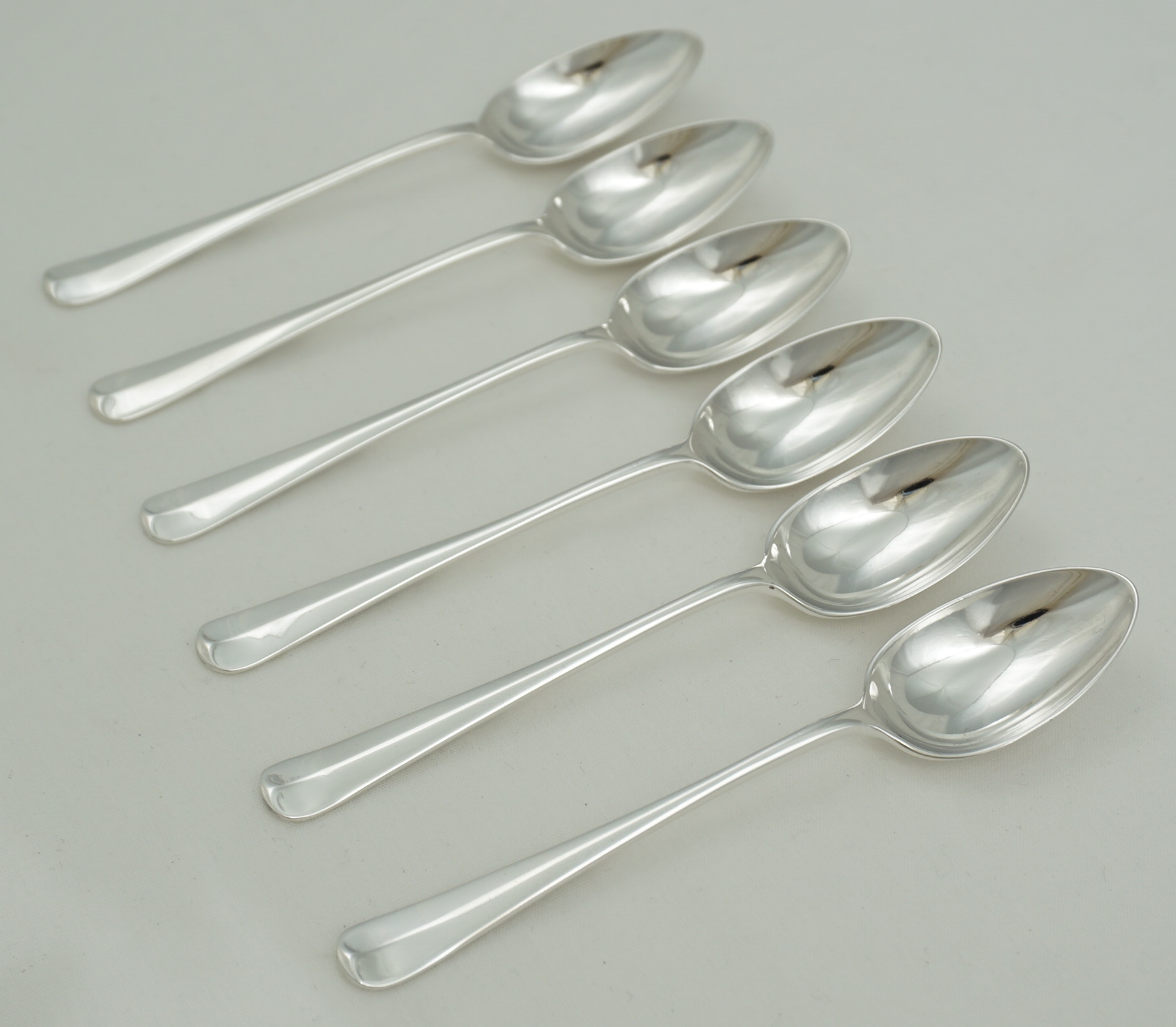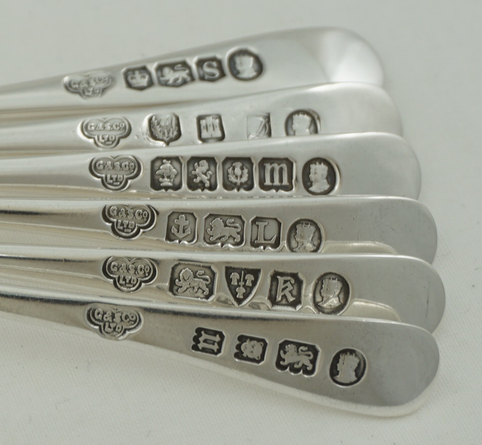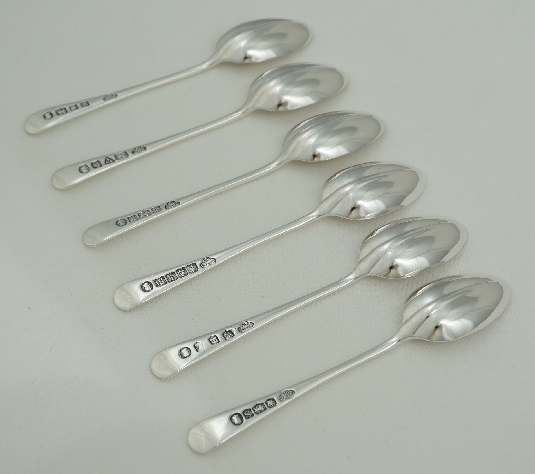 DESCRIPTION | Interesting set of six vintage English solid sterling silver Hanoverian with Rat Tail pattern demitasse coffee spoons with no engraving or erasure. One has been assayed at each of the British assay offices open in 1934. Stylistically these are good reproductions of Hanoverian pattern of the 1740s, still with the full length rat tail and central rib but bowl now a little broader and shallower than the 1720s. However, a little point of interest for those who enjoy such pedantry as much as I do, there are two spoons that could not have existed in the 1740s. They are the Birmingham and Sheffield marked examples for those assay offices did not open until 1773. |