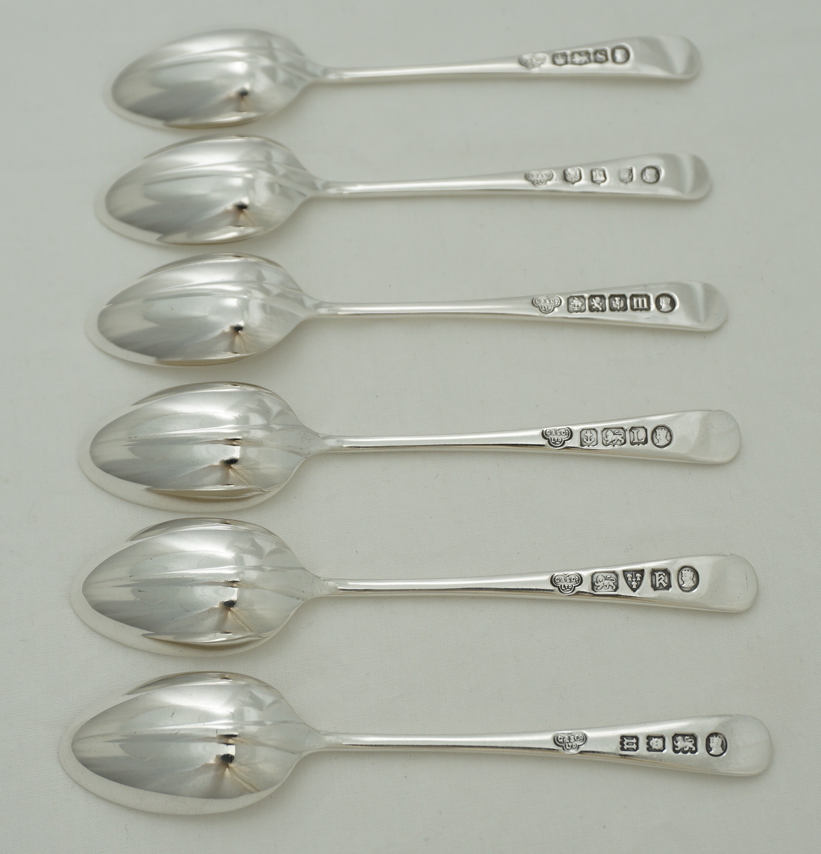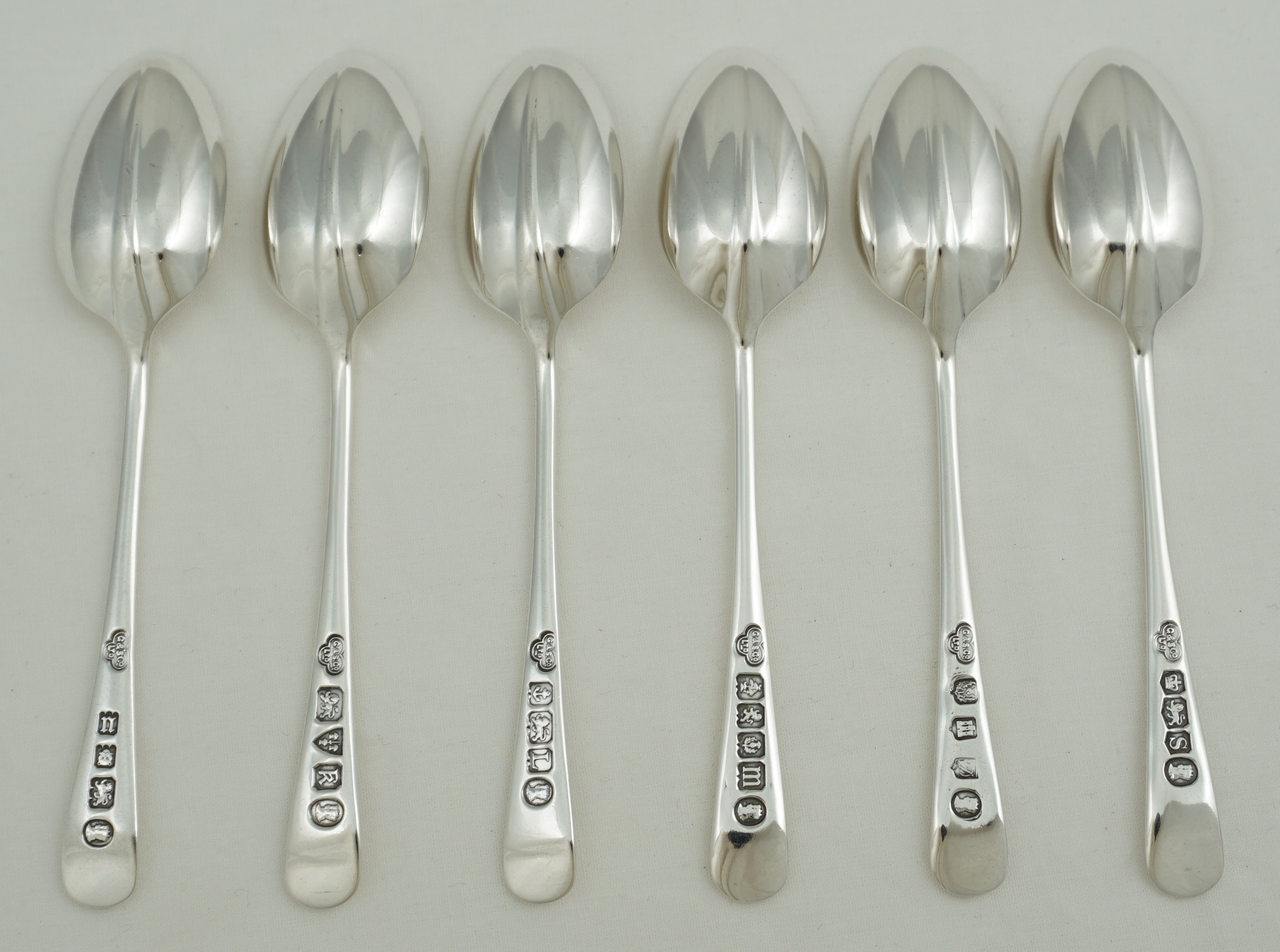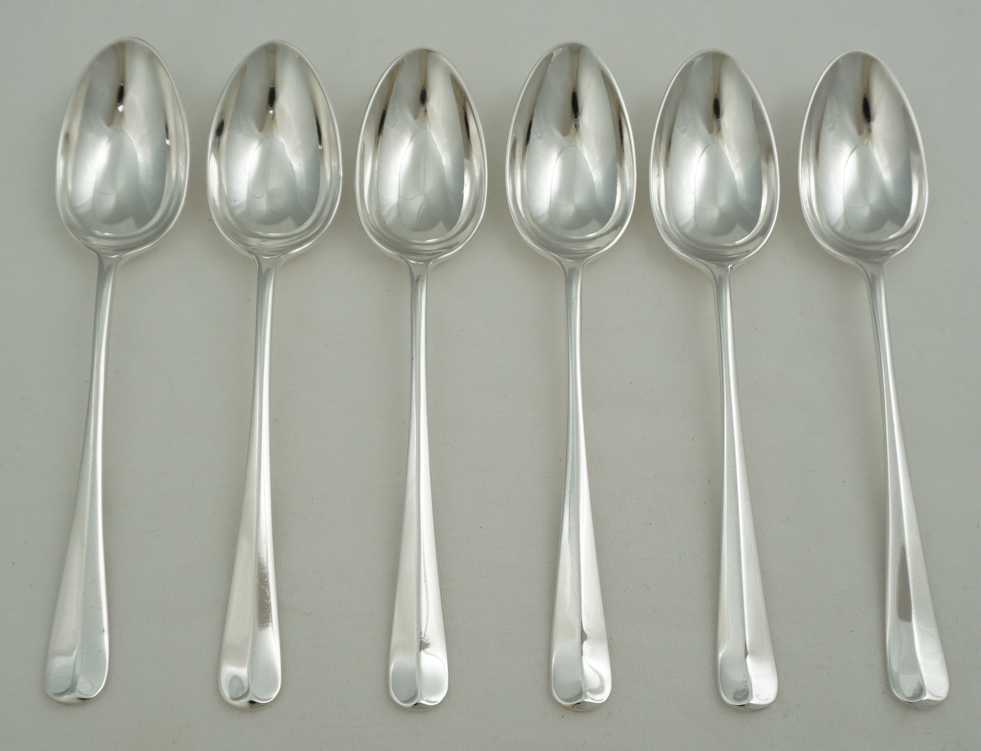 DESCRIPTION | Interesting set of six vintage English solid sterling silver Hanoverian with Rat Tail pattern demitasse coffee spoons with no engraving or erasure. One has been assayed at each of the British assay offices open in 1934. Stylistically these are good reproductions of Hanoverian pattern of the 1740s, still with the full length rat tail and central rib but bowl now a little broader and shallower than the 1720s. However, a little point of interest for those who enjoy such pedantry as much as I do, there are two spoons that could not have existed in the 1740s. They are the Birmingham and Sheffield marked examples for those assay offices did not open until 1773. |