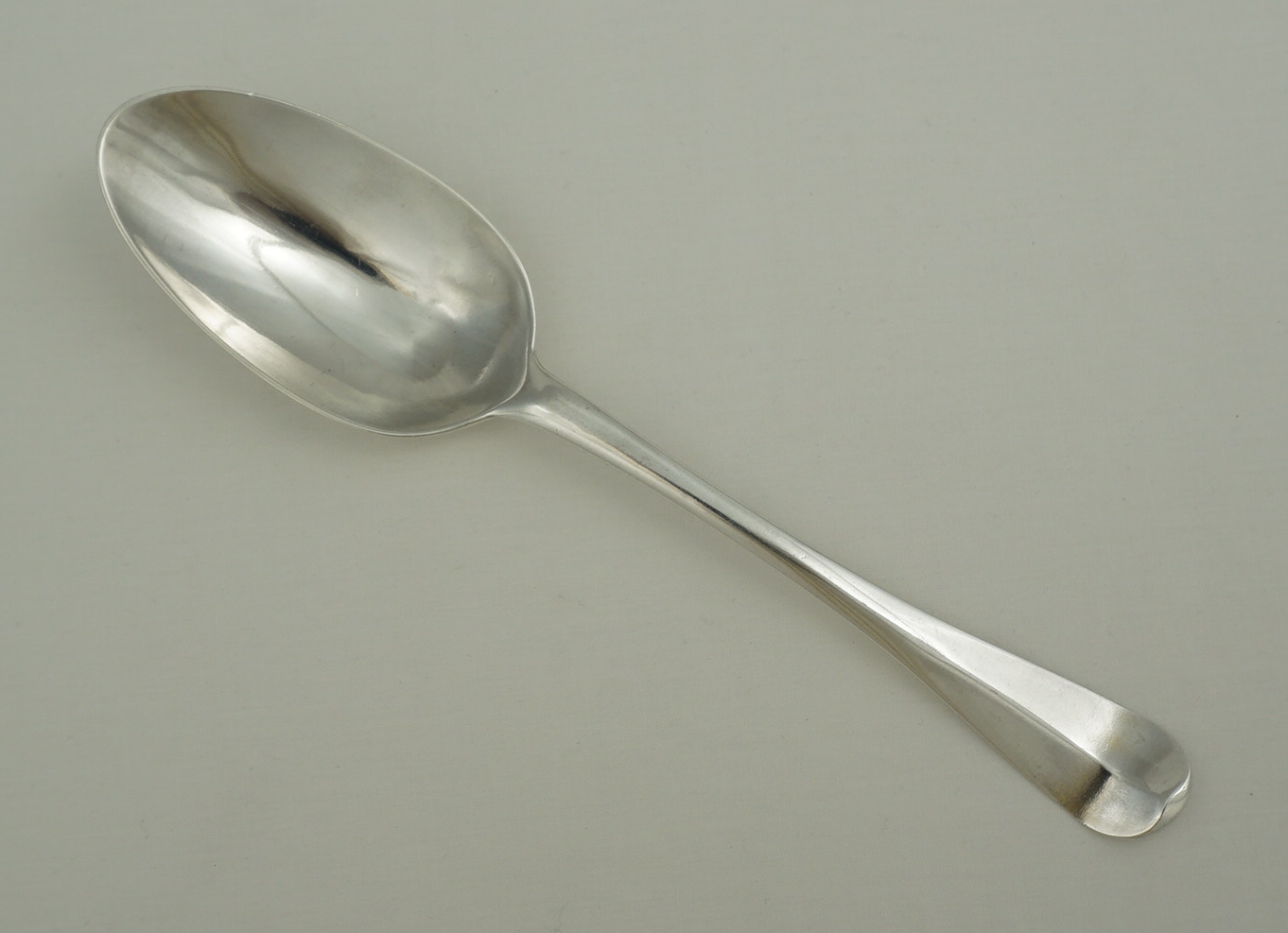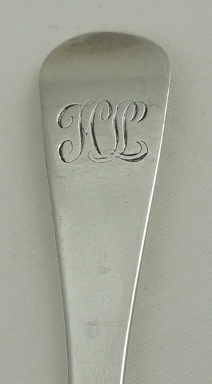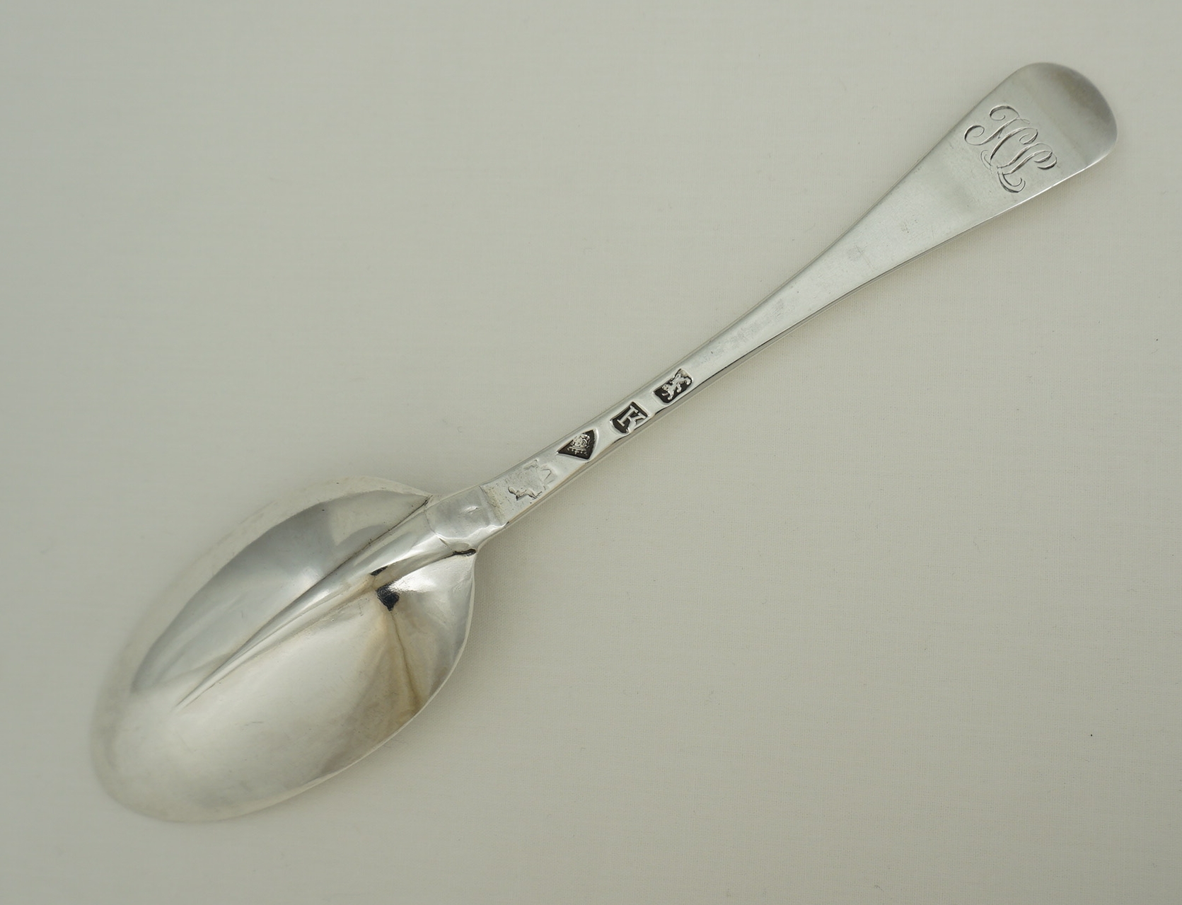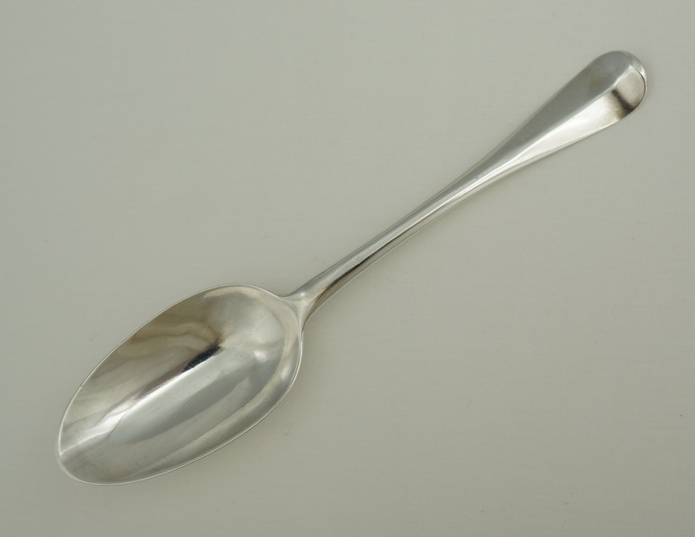DESCRIPTION | Very good antique English Georgian solid sterling silver Hanoverian with Rat Tail pattern table spoon with a monogram engraving. |
