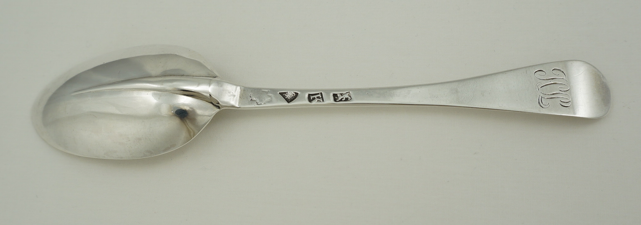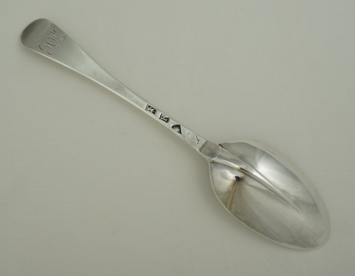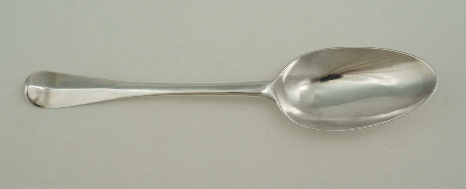 DESCRIPTION | Very good antique English Georgian solid sterling silver Hanoverian with Rat Tail pattern table spoon with a monogram engraving. |