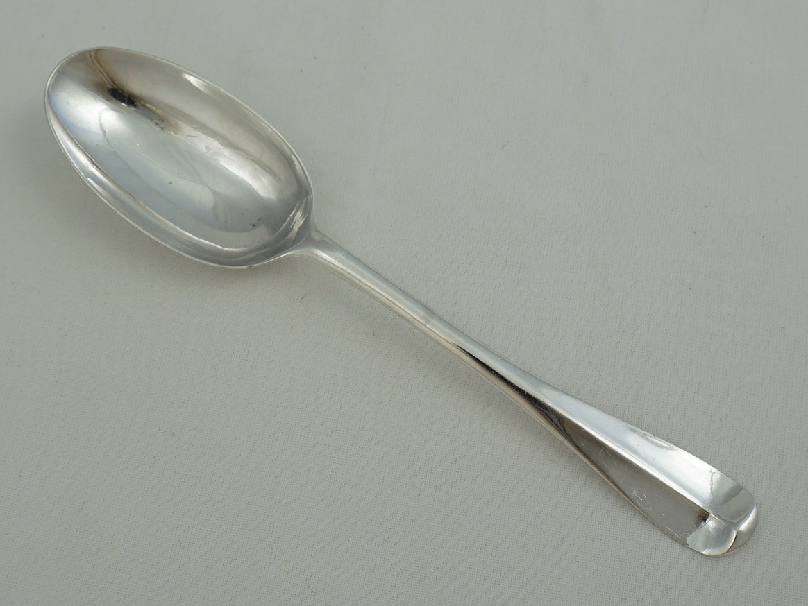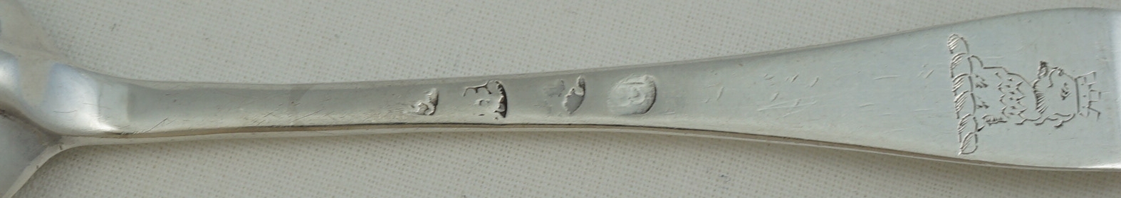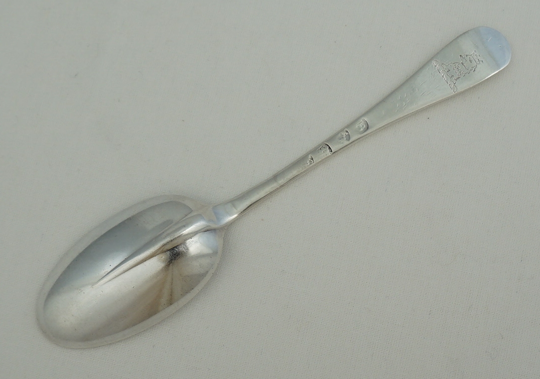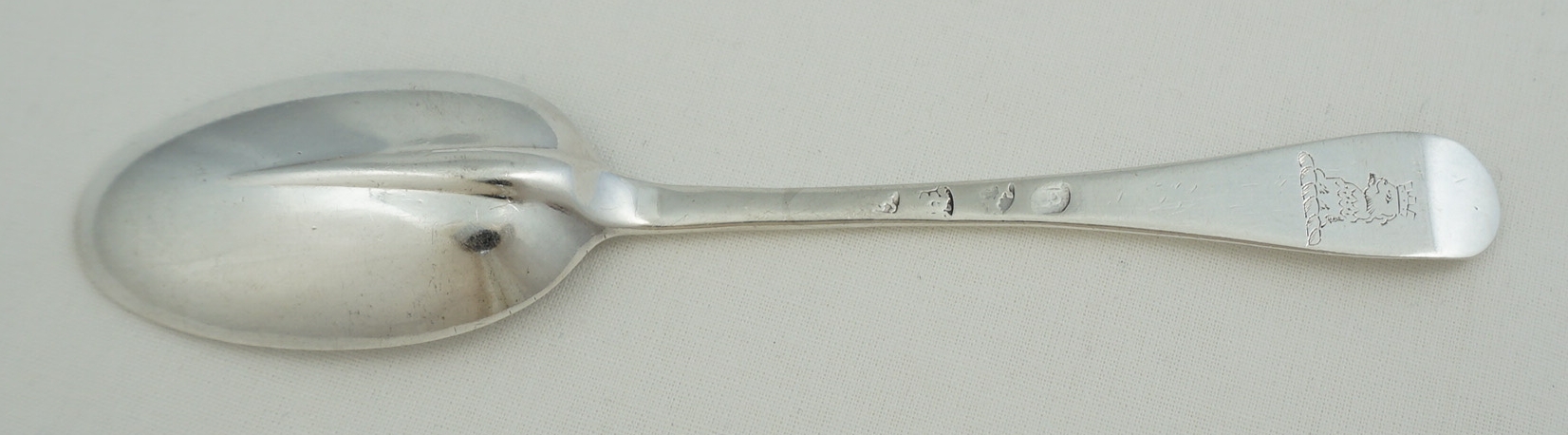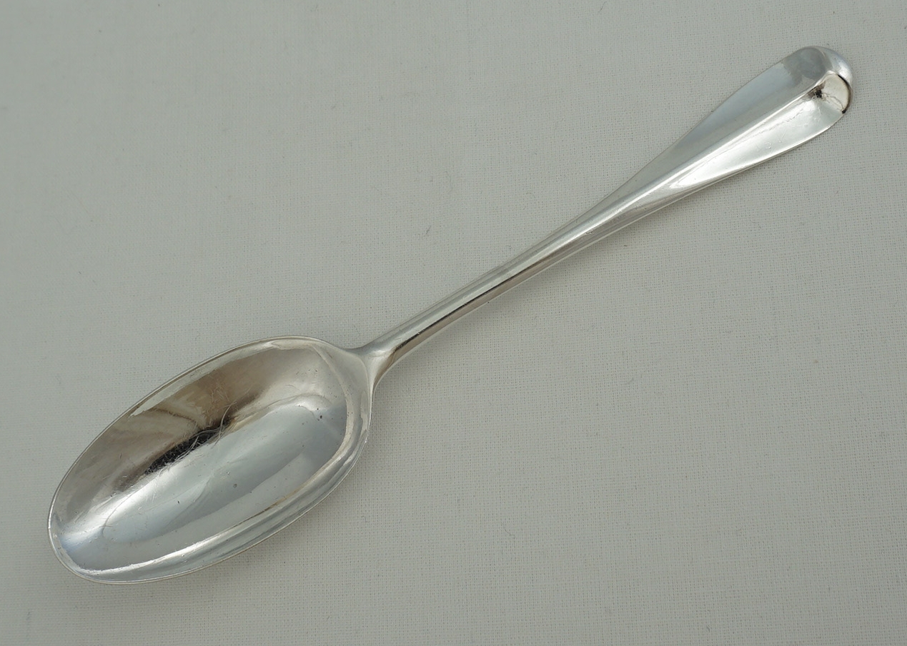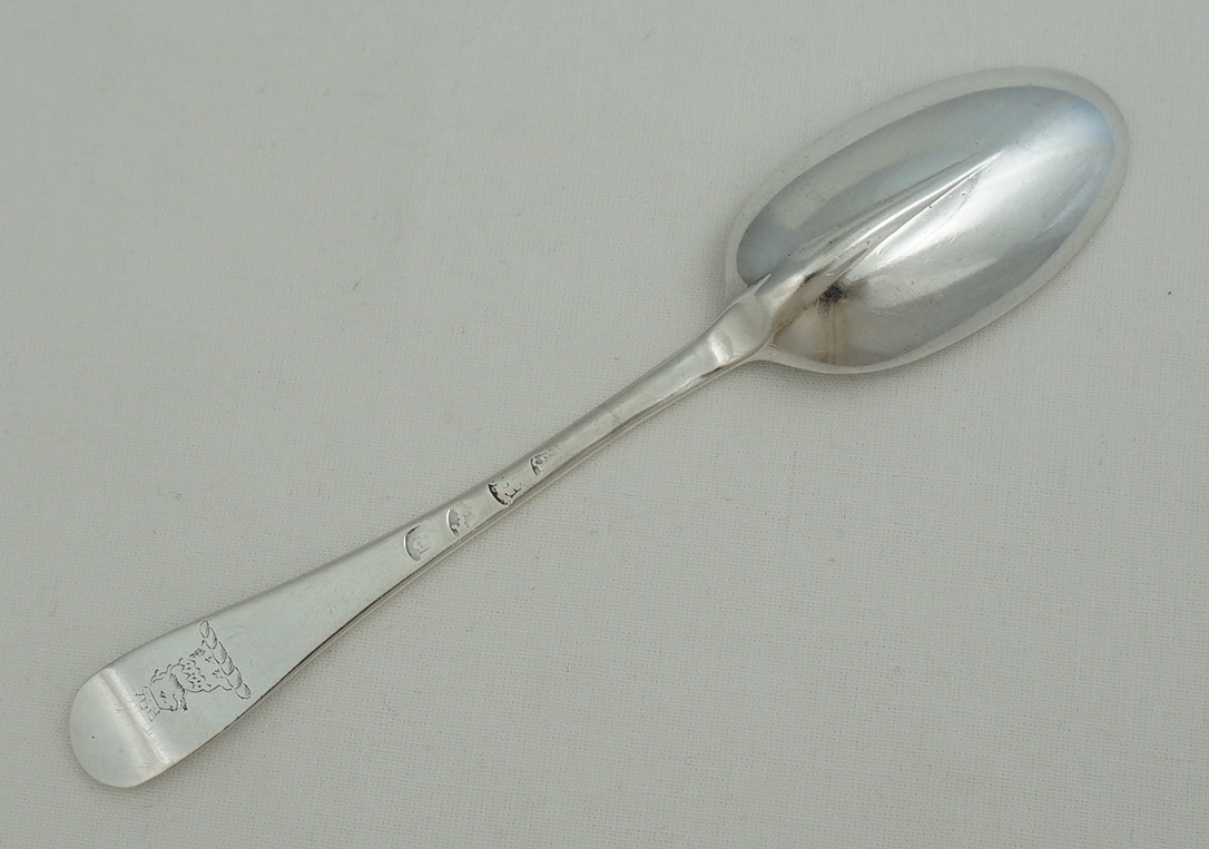 DESCRIPTION | Antique English early Georgian solid sterling silver Hanoverian with Rat Tail pattern dessert spoon with a pronounced frontal rib and later crest engraving verso. |