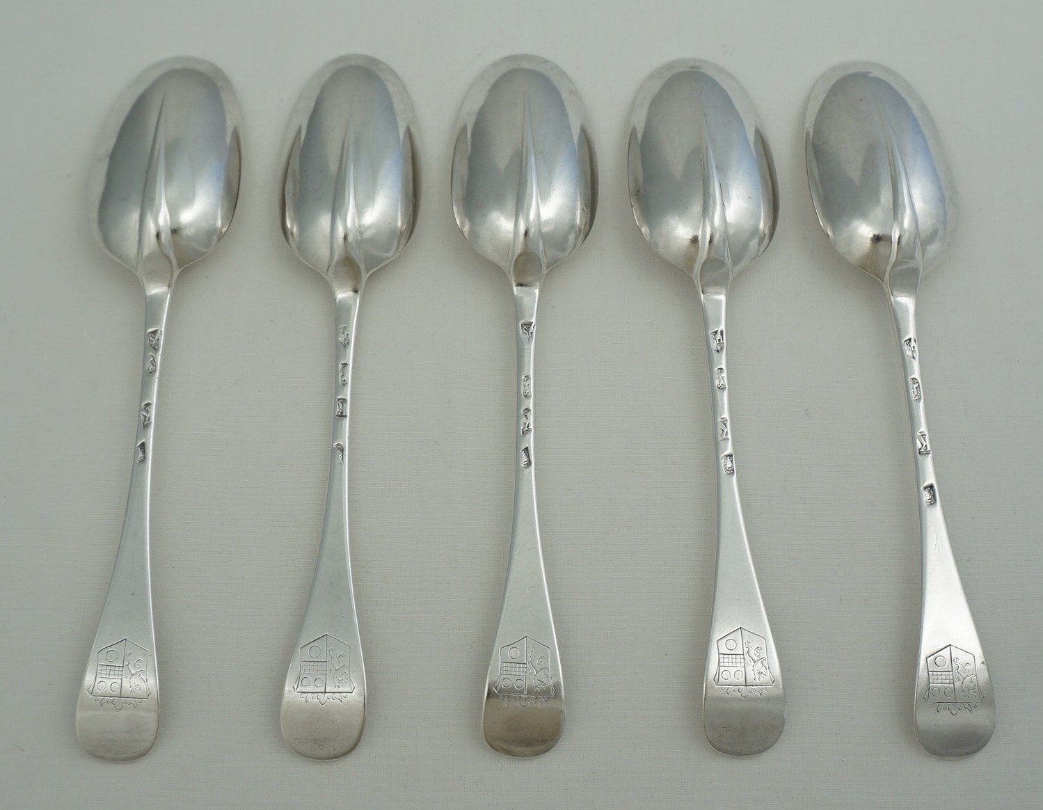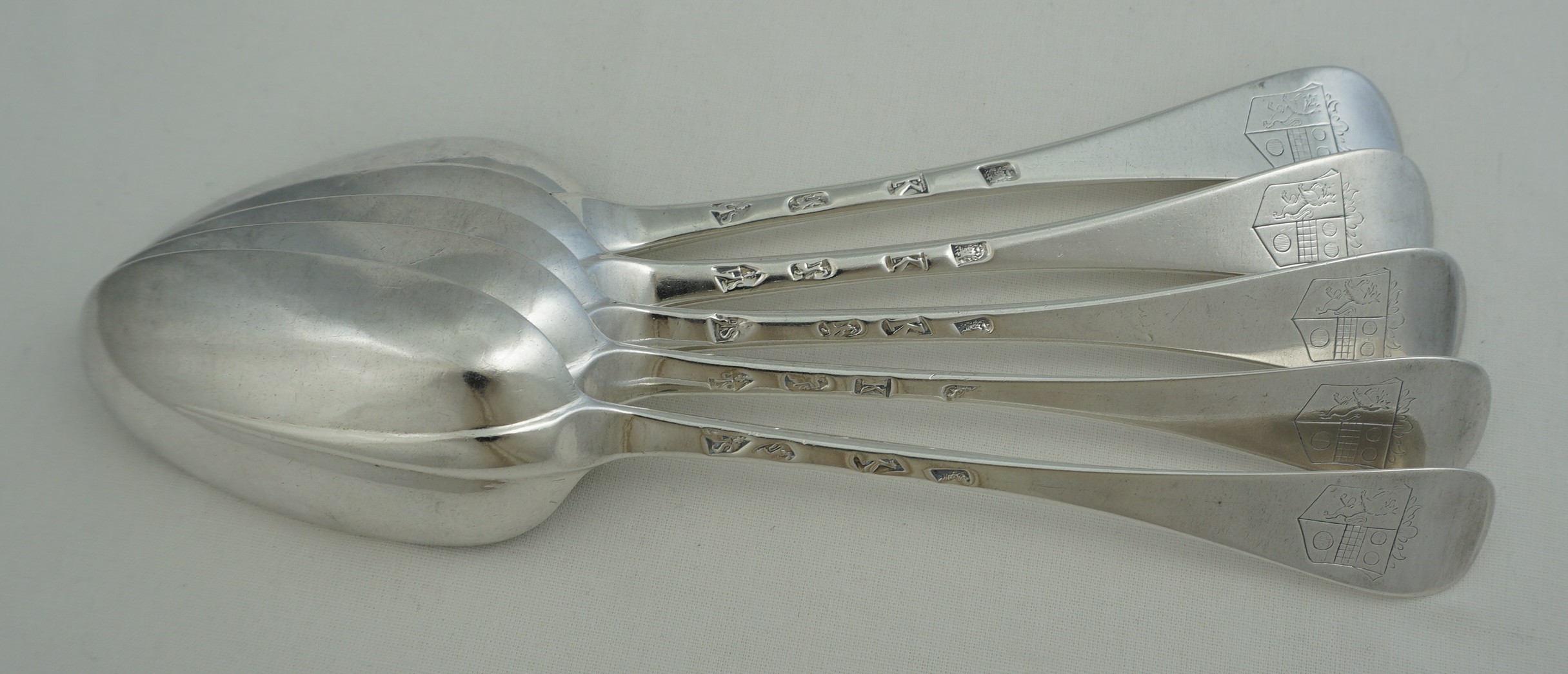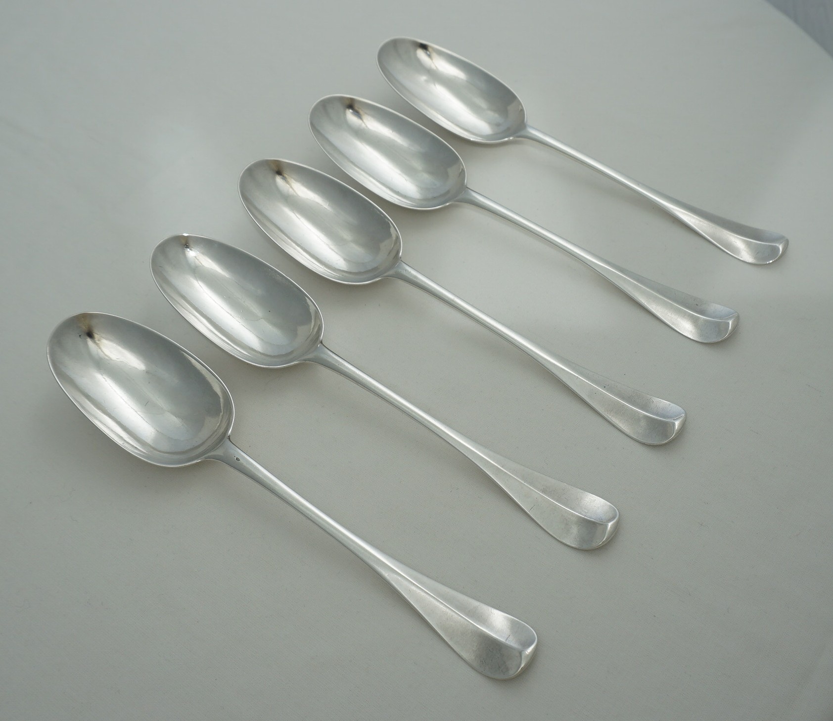 DESCRIPTION | Exceptionally good set of five same date and maker antique English Georgian solid sterling silver Hanoverian with Rat Tail pattern table spoons with an interesting crest engraving verso. |