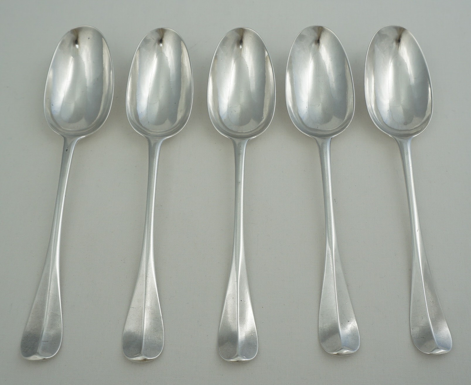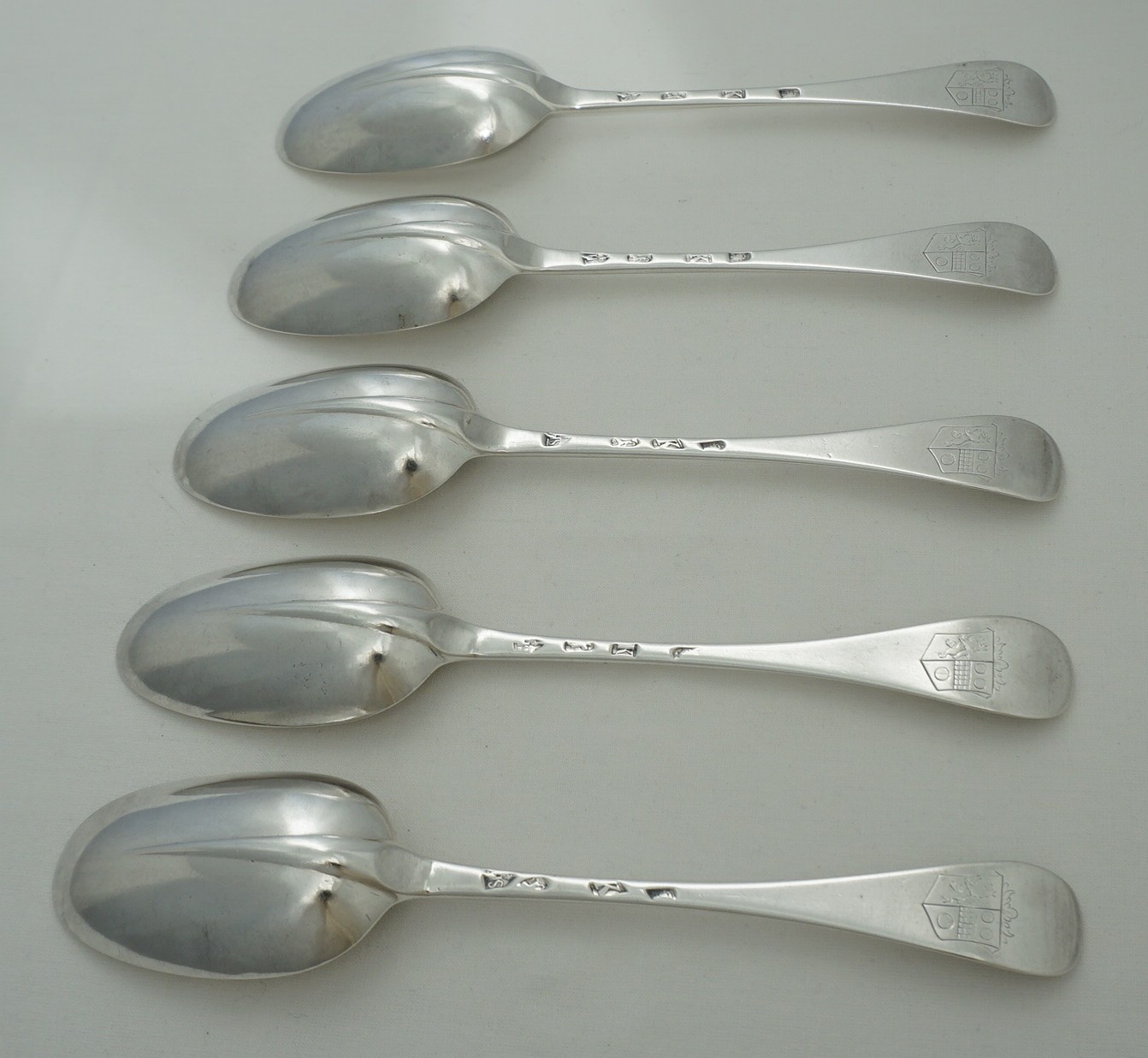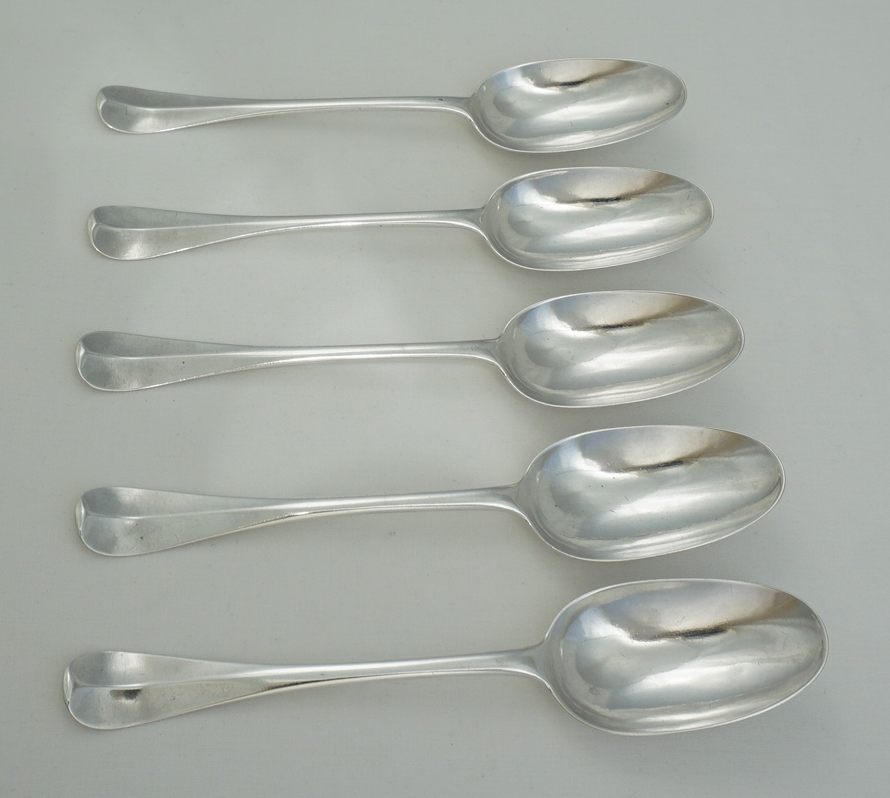 DESCRIPTION | Exceptionally good set of five same date and maker antique English Georgian solid sterling silver Hanoverian with Rat Tail pattern table spoons with an interesting crest engraving verso. |