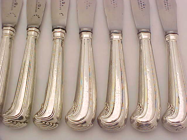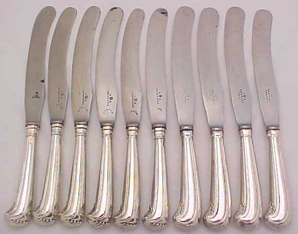 Generously proportioned set of ten Georgian silver leaf capped pistol grip hafted steel scimitar bladed table knives. Six are clearly hallmarked and doubly crested below a coronet (first six from the left), four have worn marks although the one date letter extant is also for 1817, and are similarly crested but to the side, crests now very faint. Astonishingly, one of the six clearly hallmarked examples (first left) also appears to have the original steel blade, the others have Victorian steel scimitar replacements by Thornhill of London. The four all have Victorian steel scimitar blades by Garrard of London. |