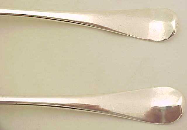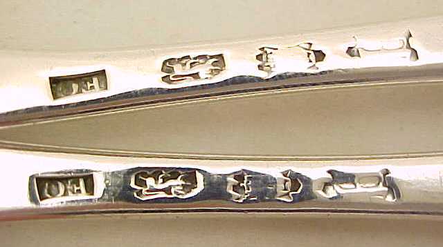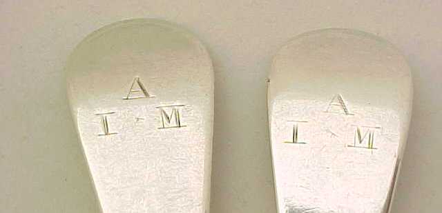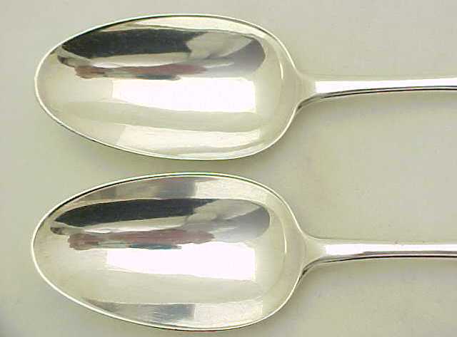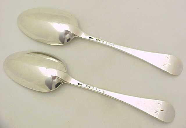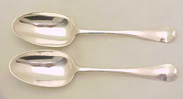Excellent pair of George II silver Hanoverian pattern table spoons with long drops and original initial 'A I*M' engraving verso. |