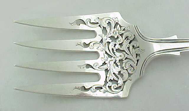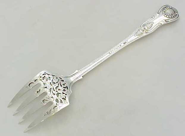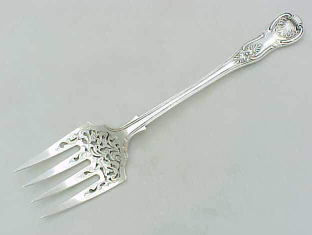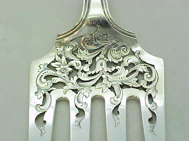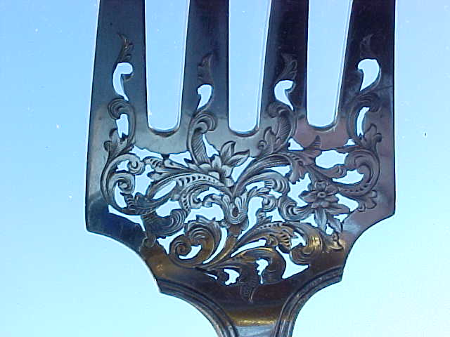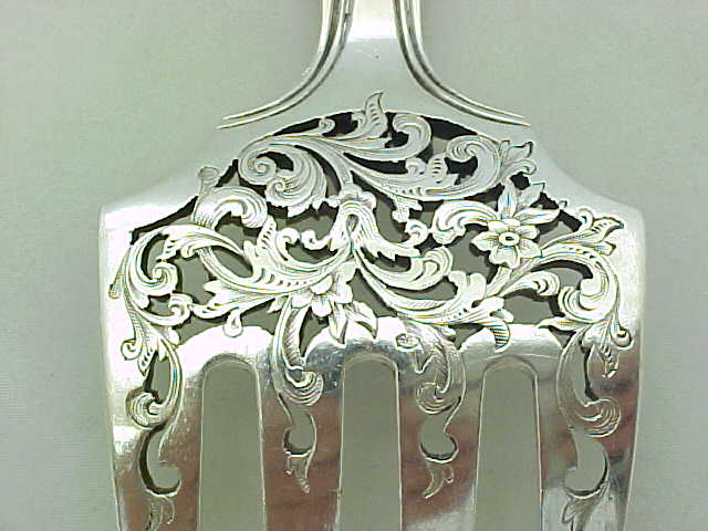 Beautiful early Victorian silver double struck King's pattern serving fork with hand pierced and engraved decoration. |