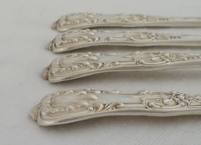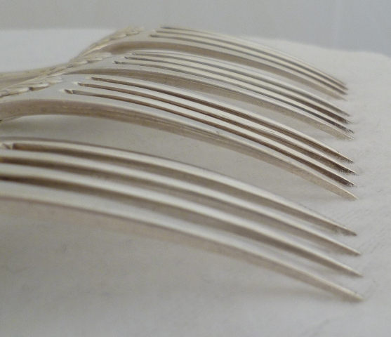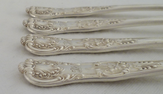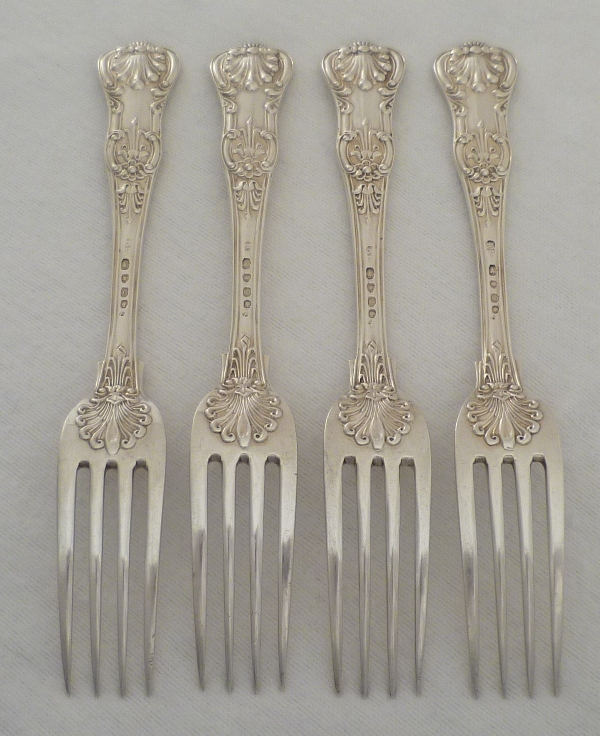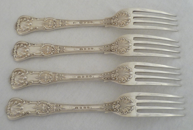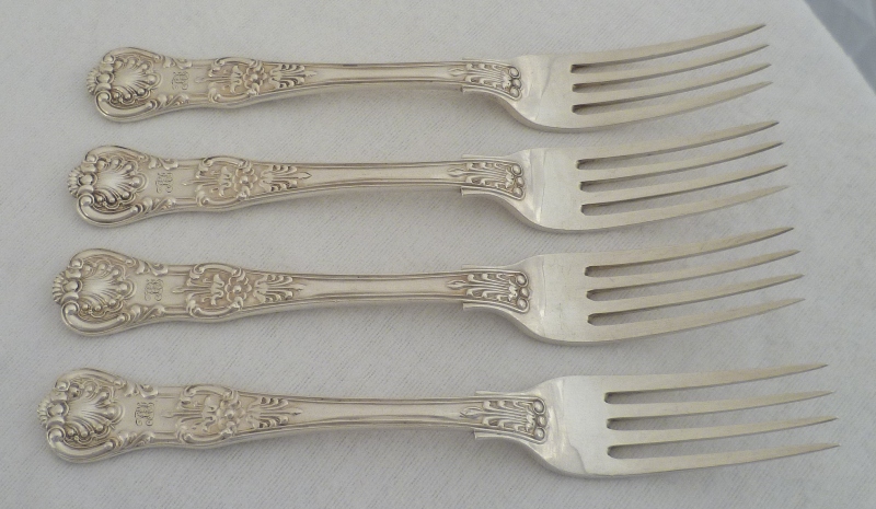 DESCRIPTION | Four Victorian silver double struck Queen's pattern dessert forks with frontal engravings. Also ideal for starters and salads. |