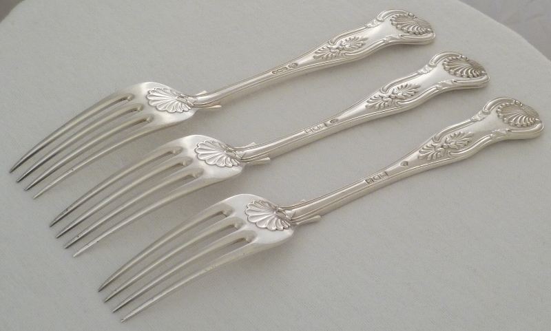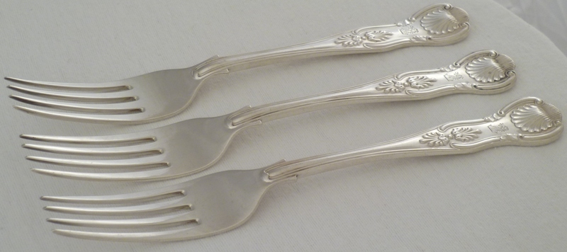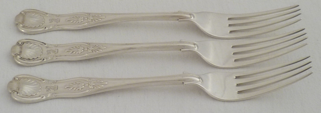 DESCRIPTION | Three silver double struck King's pattern table forks with diamond shell heels and frontal crest engraving. |