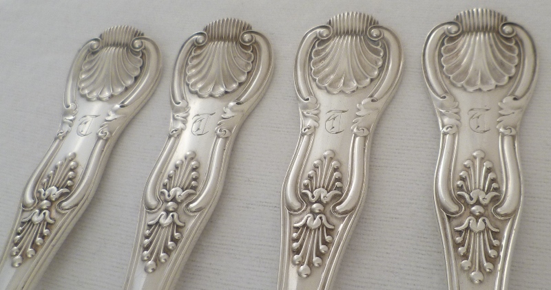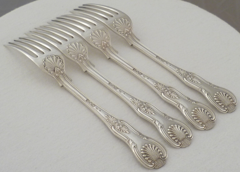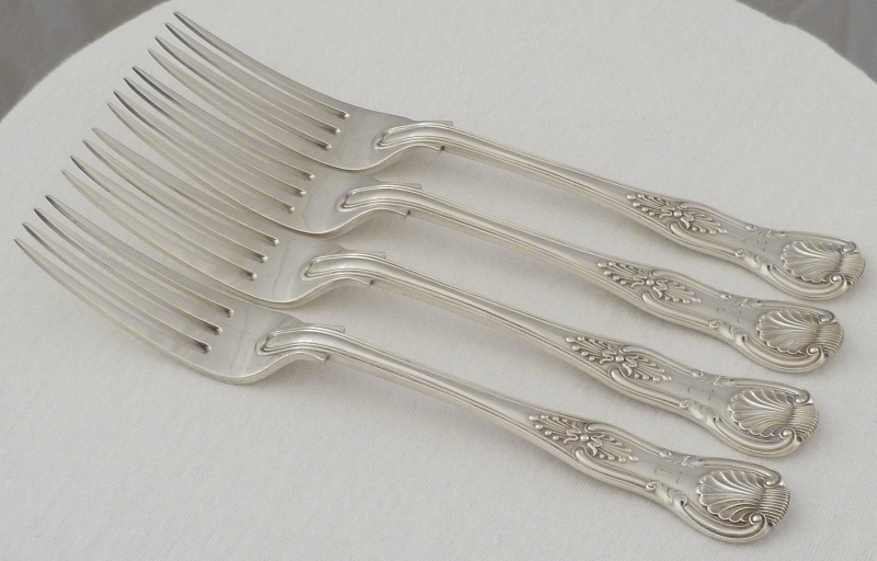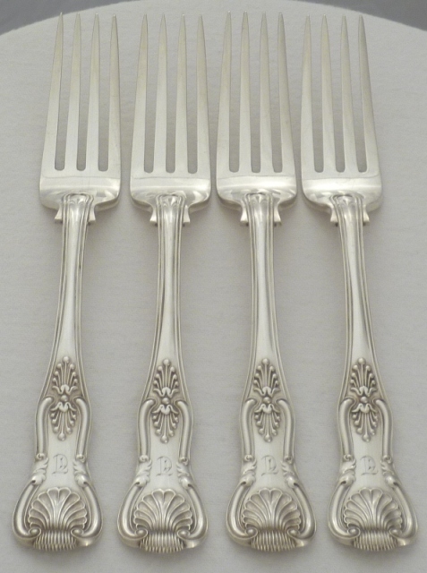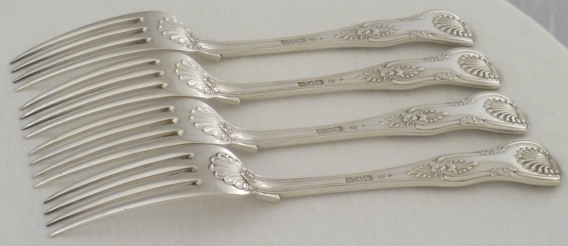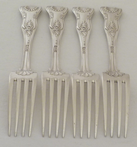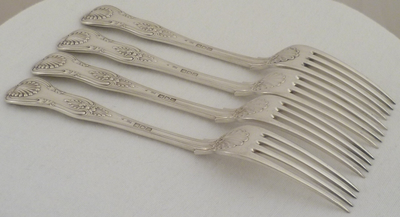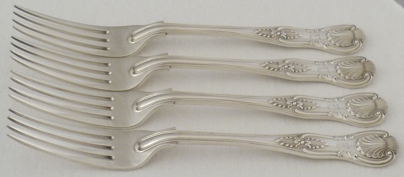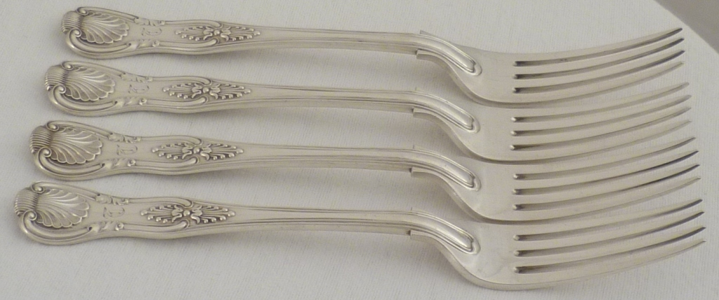 DESCRIPTION | Four Edwardian silver double struck King's pattern table forks with diamond shell heels and frontal initial engraving. |