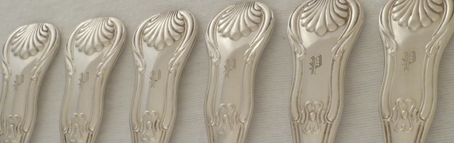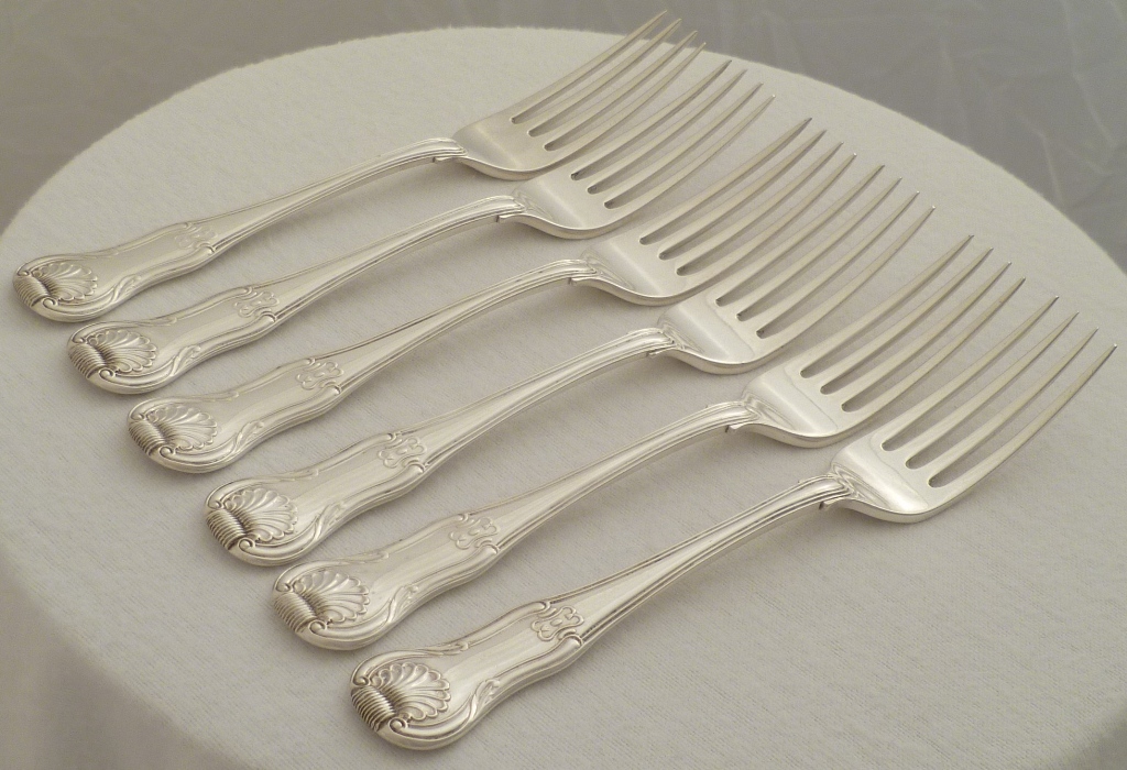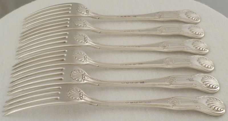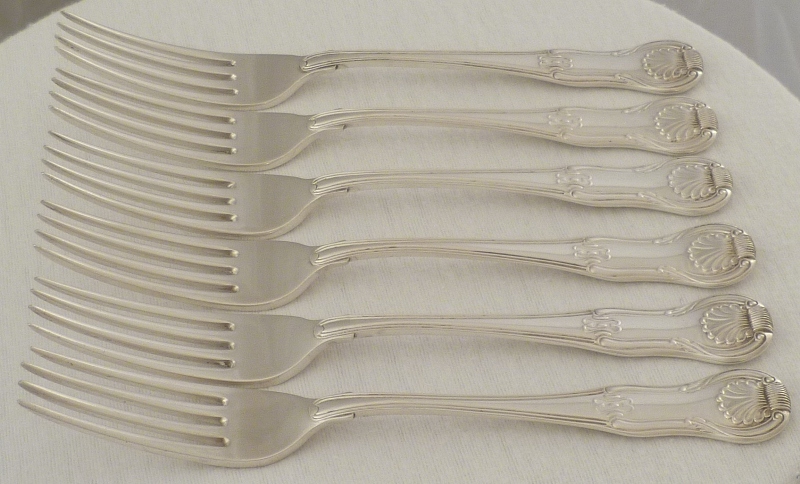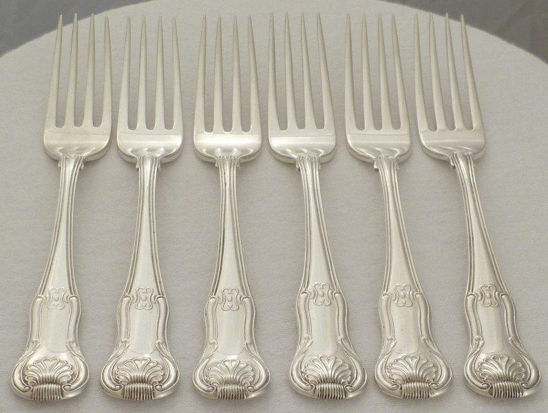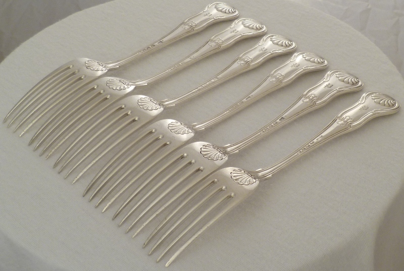 DESCRIPTION | Set of six Georgian silver double struck King's Hour Glass pattern table forks with diamond shell heels and an initial engraving to the back of the terminals. |