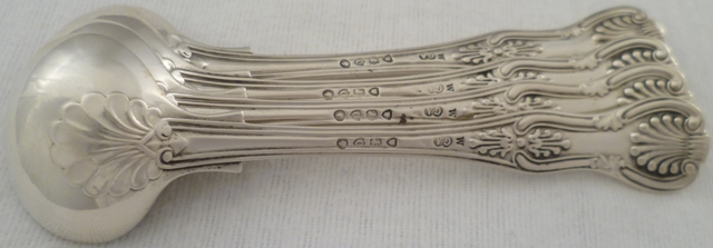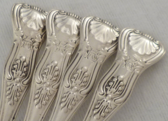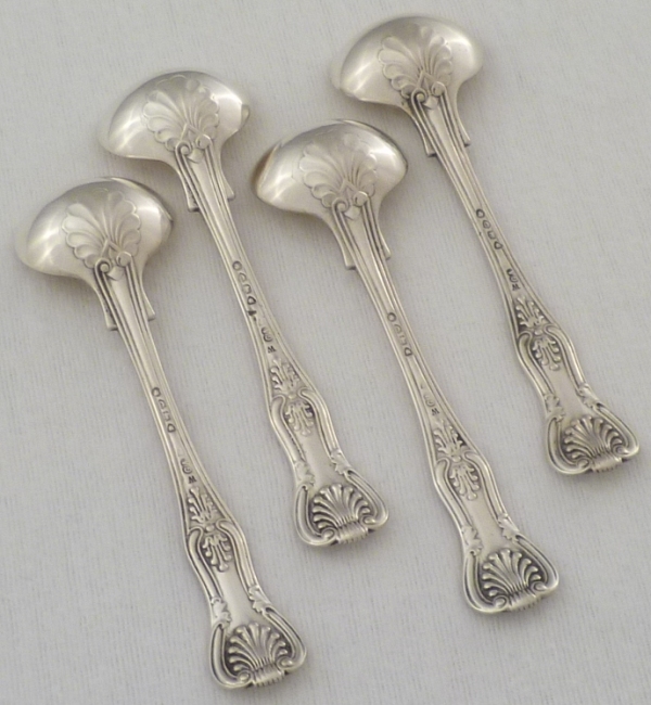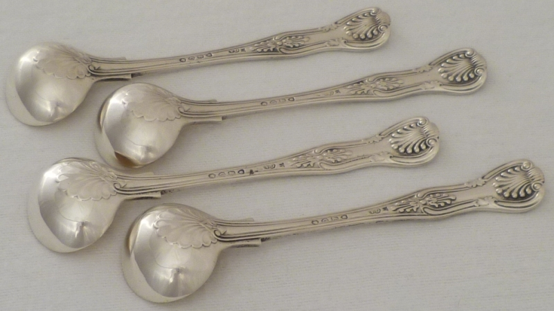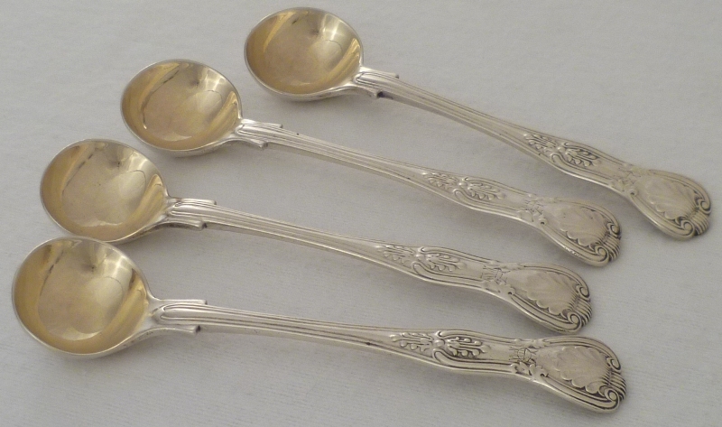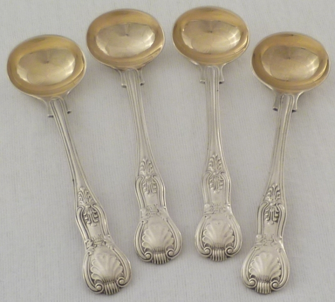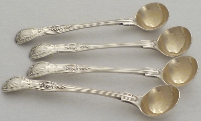 DESCRIPTION | Set of four Victorian silver double struck King's pattern salt spoons with diamond shell heels, monogram engraving and gilded bowls. |