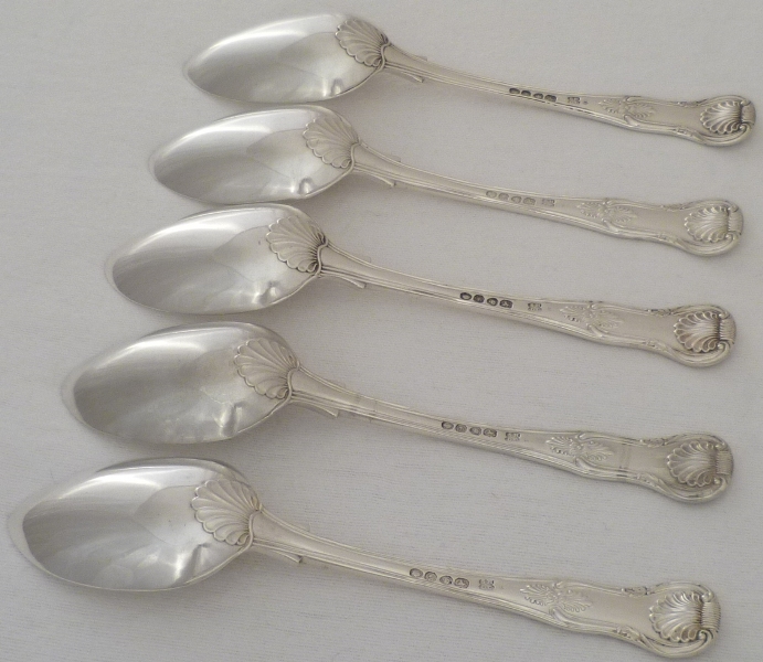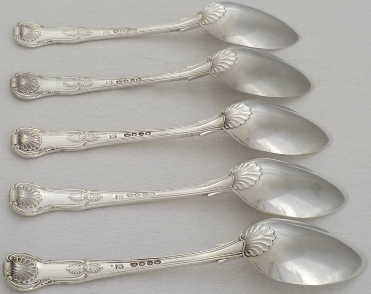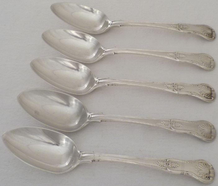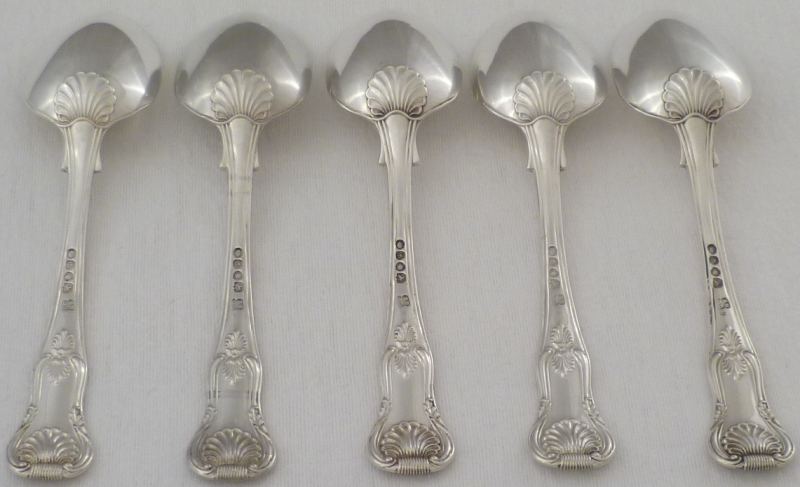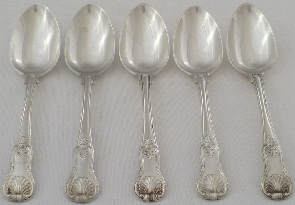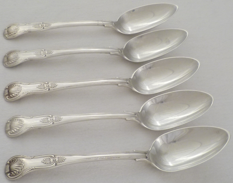 DESCRIPTION | Five William IV silver double struck King's pattern dessert or soup spoons with union shell heels and no engravings. |