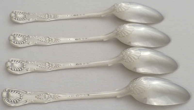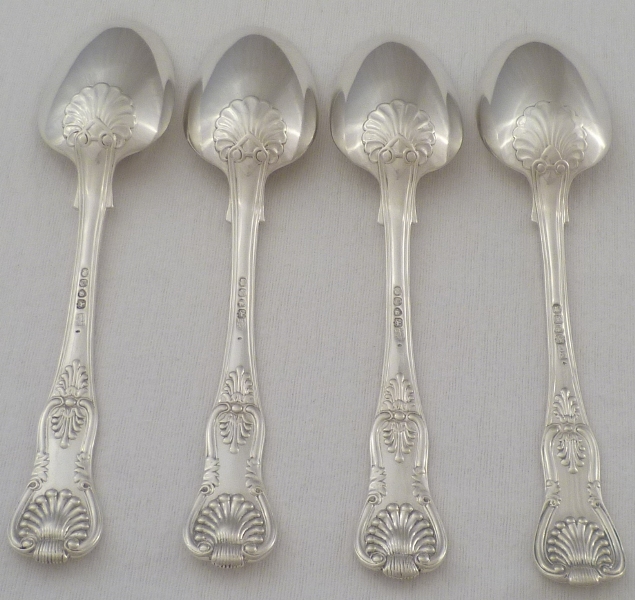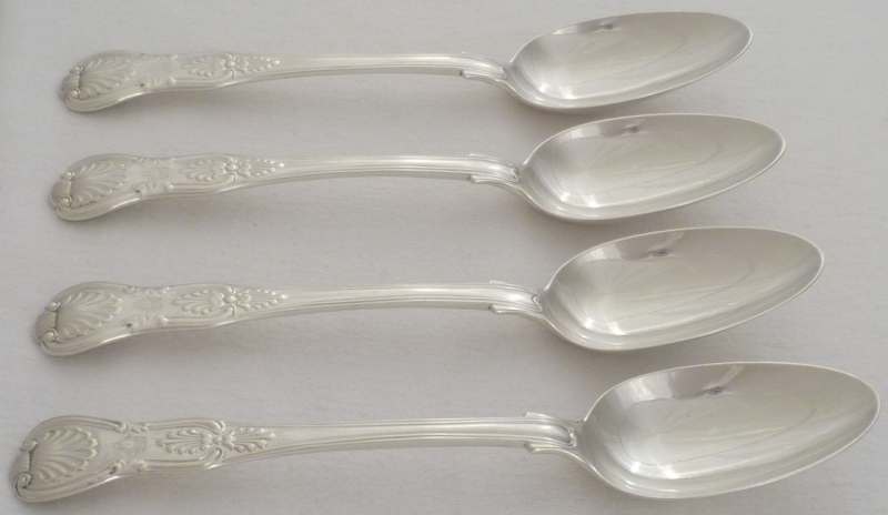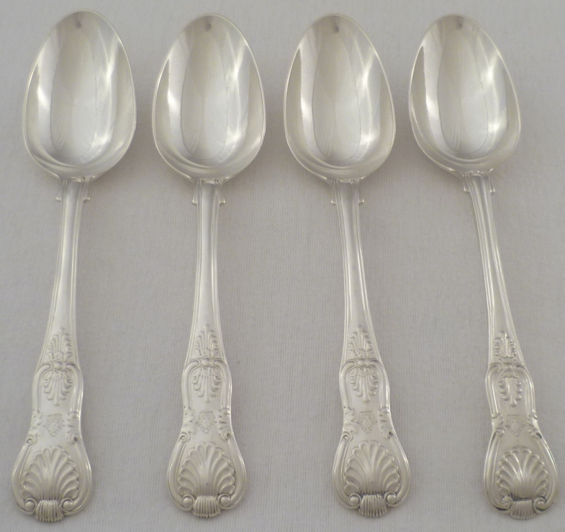 DESCRIPTION | Four William IV silver double struck King's pattern table spoons with diamond shell heels and frontal crests over probable erasures. |