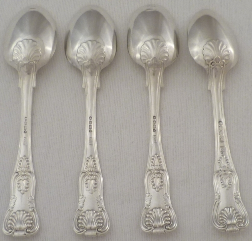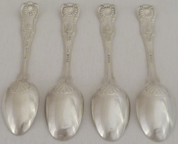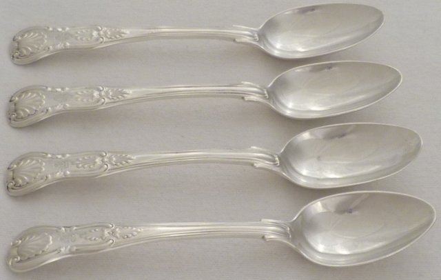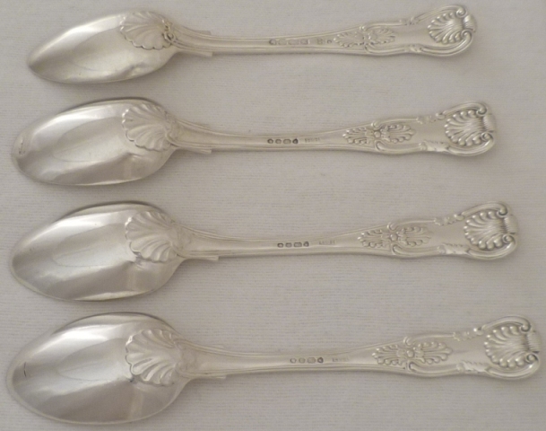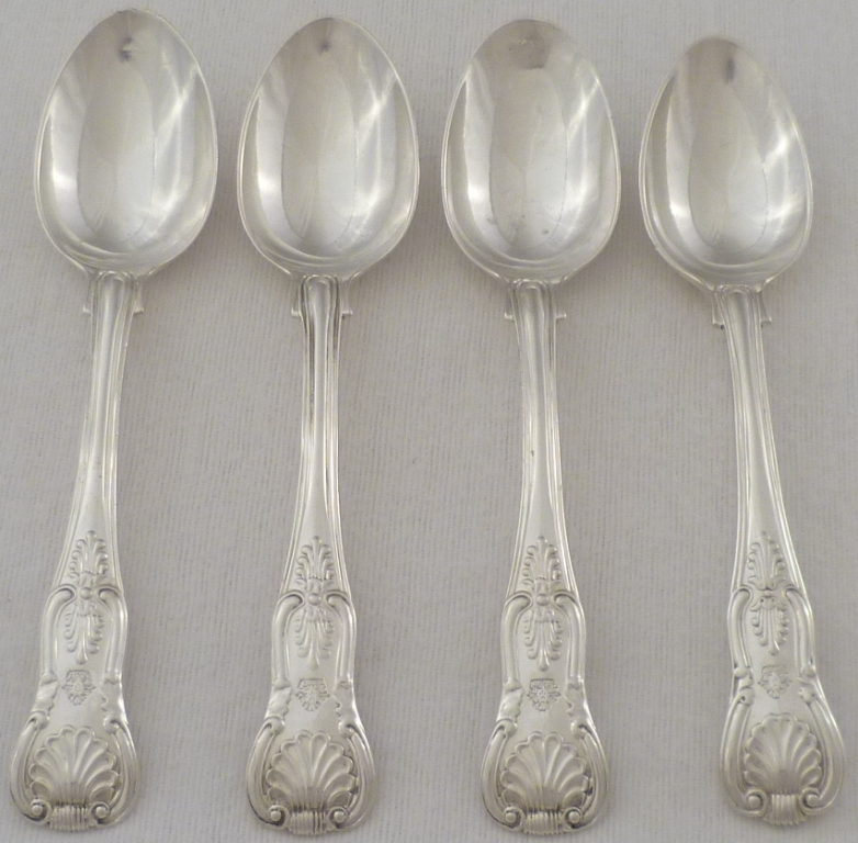 DESCRIPTION | Four Victorian silver double struck King's pattern teaspoons with diamond shell heels and frontal crests over probable erasures. |