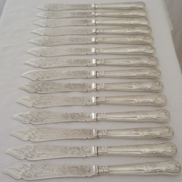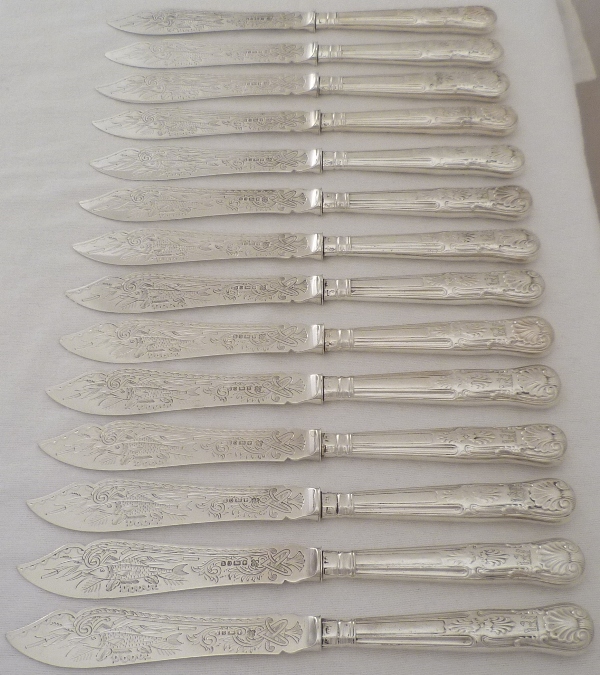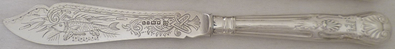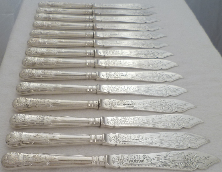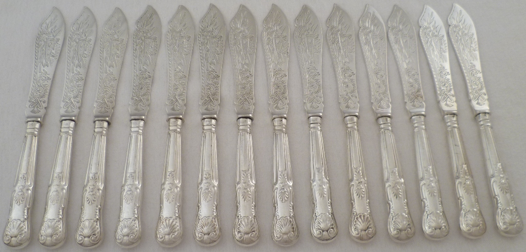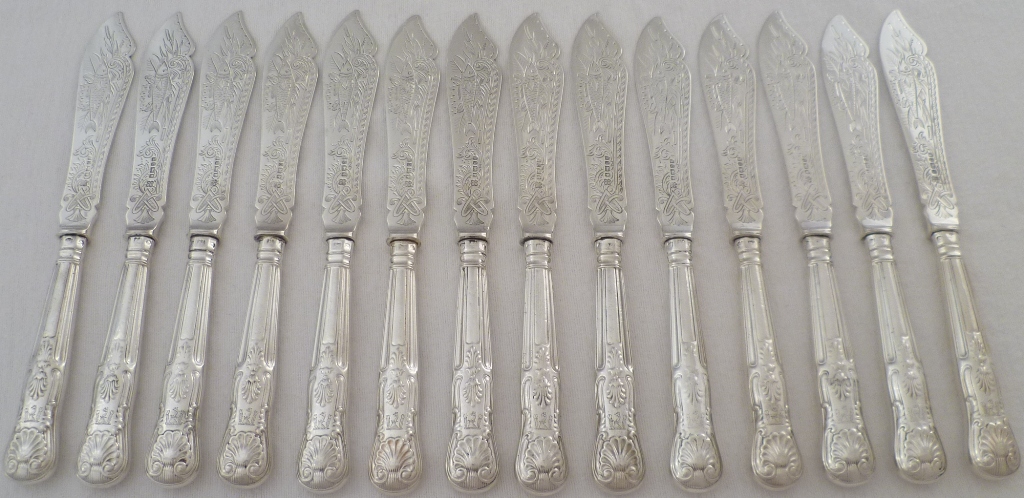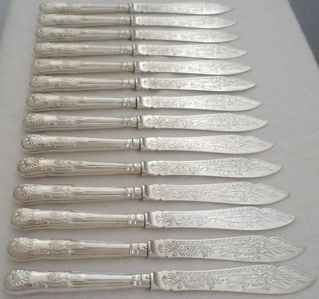 DESCRIPTION | Magnificent set of fourteen Victorian silver double struck King's pattern fish knives with solid silver blades engraved both sides with fish and foliate decoration. The silver handles have all just been reloaded with fresh pitch and have a matching crest engraving to one side. All handles and blades have matching hallmarks. I would consider an 8/6 split. |