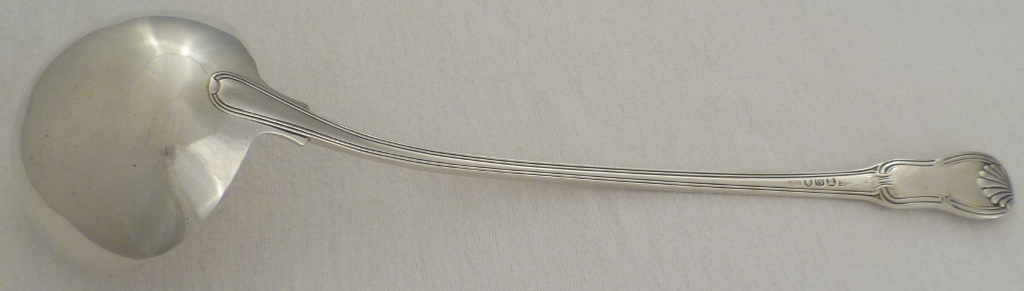 DESCRIPTION | Georgian silver double struck King's Hourglass pattern soup ladle with a possible well executed old erasure verso. |