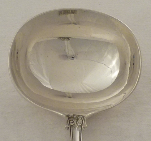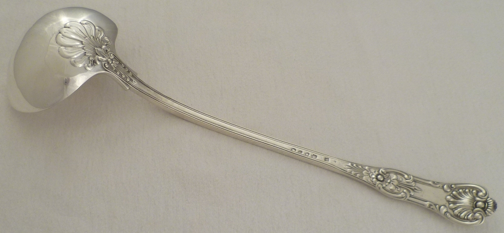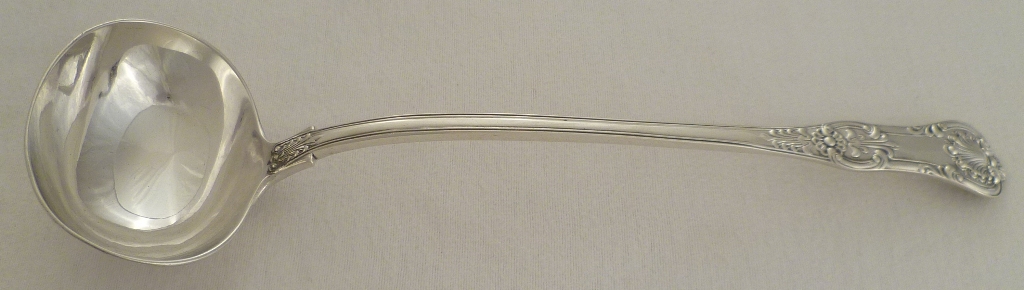 DESCRIPTION | Heavy Victorian silver double struck Queen's pattern soup ladle. |