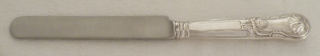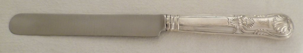 DESCRIPTION | Pair of Georgian silver double struck King's pattern table knives, crest engraved. Fully restored, reloaded and fitted with new stainless steel blades. |