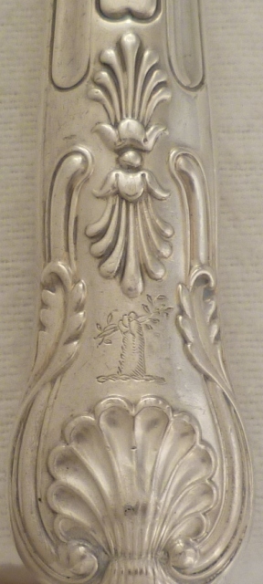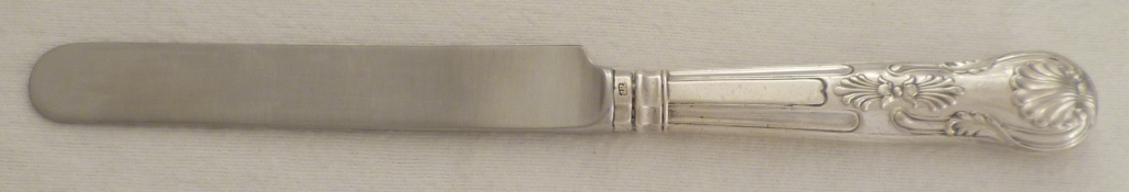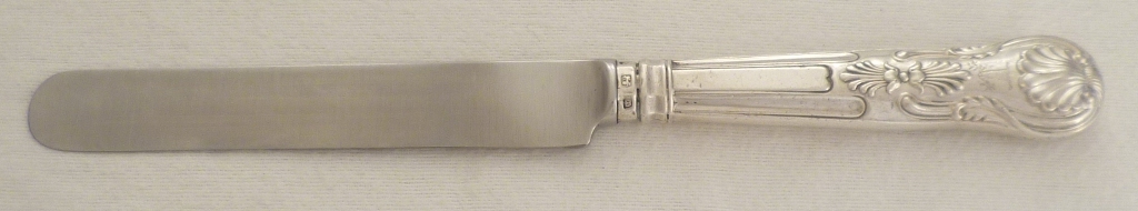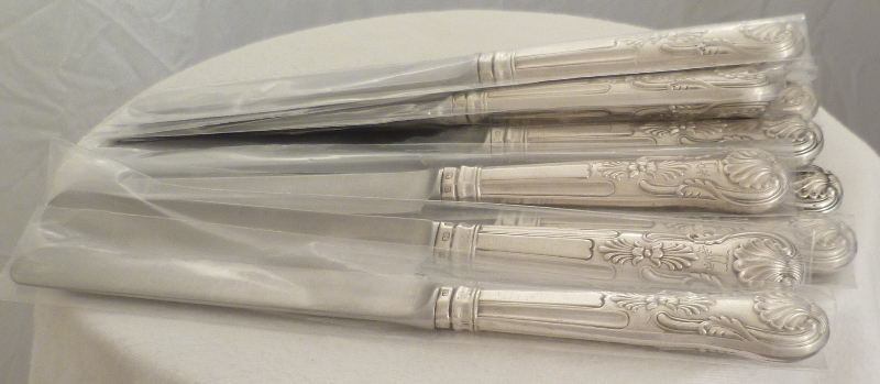 DESCRIPTION | Six Victorian silver double struck King's pattern table knives, crest engraved. Fully restored, reloaded and fitted with new stainless steel blades. |